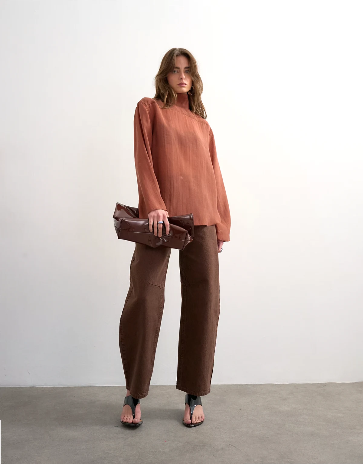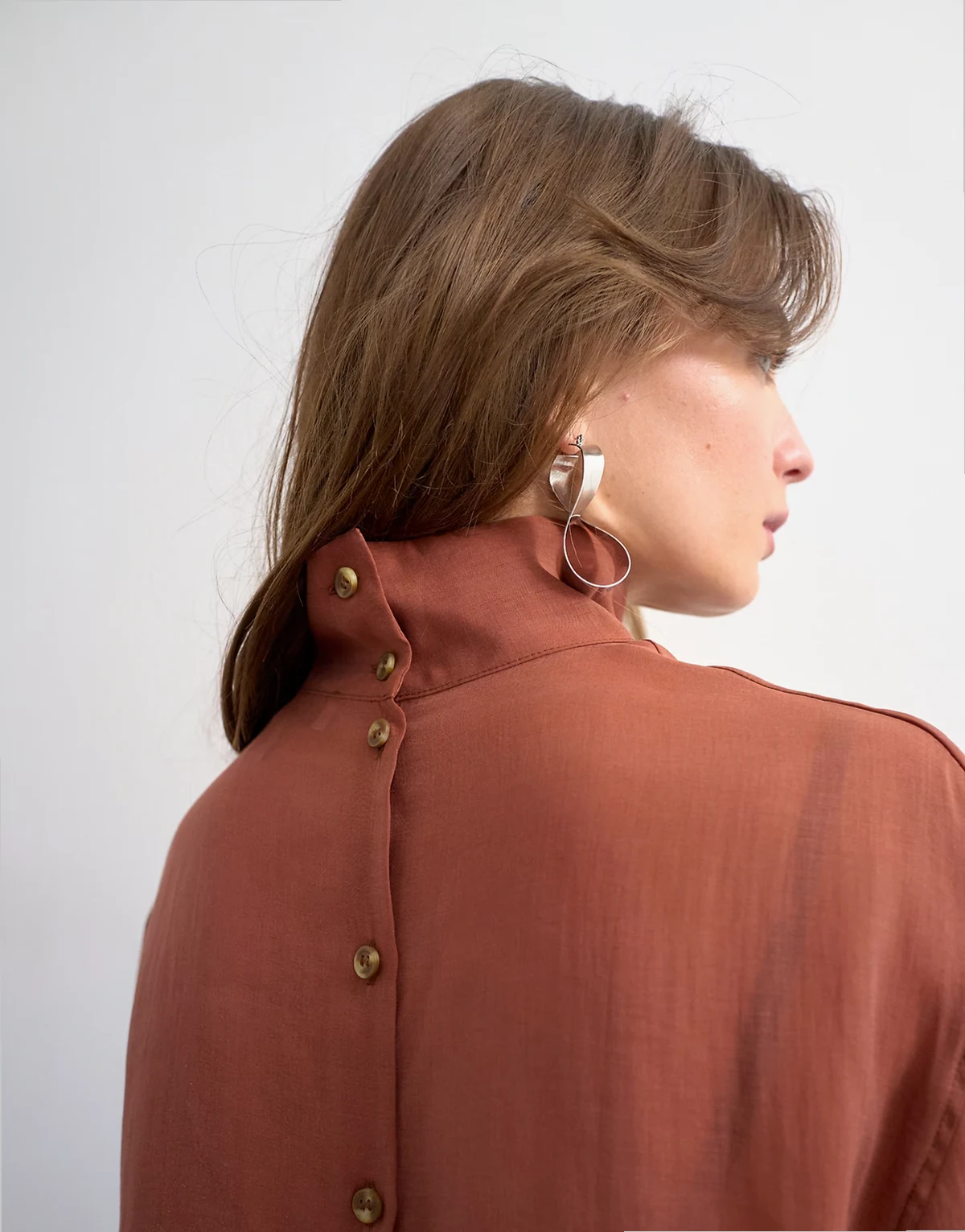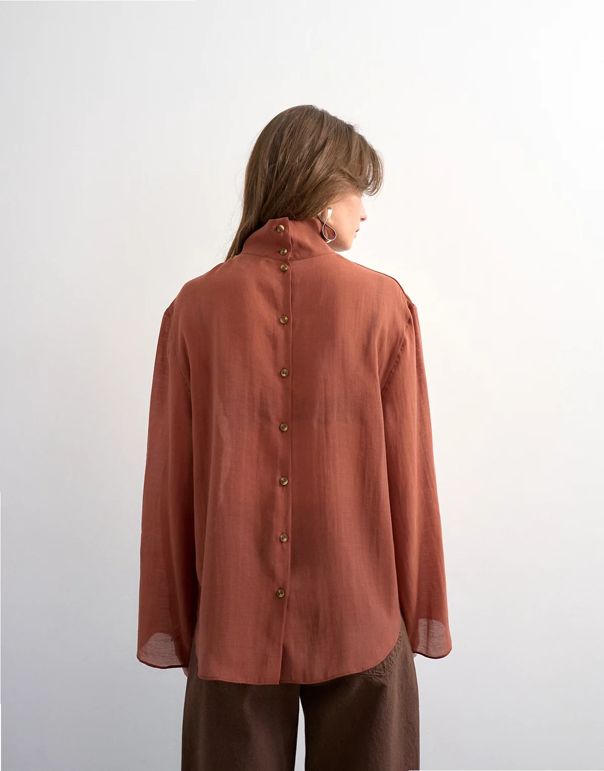 Ta koszula została wykonana z lekkiego szyfonu w rdzawopomarańczowym odcieniu. Model ma odwrócony fason, stójkę, długie rękawy i plisę na guziki z tyłu. Ten fason ma luźny krój.