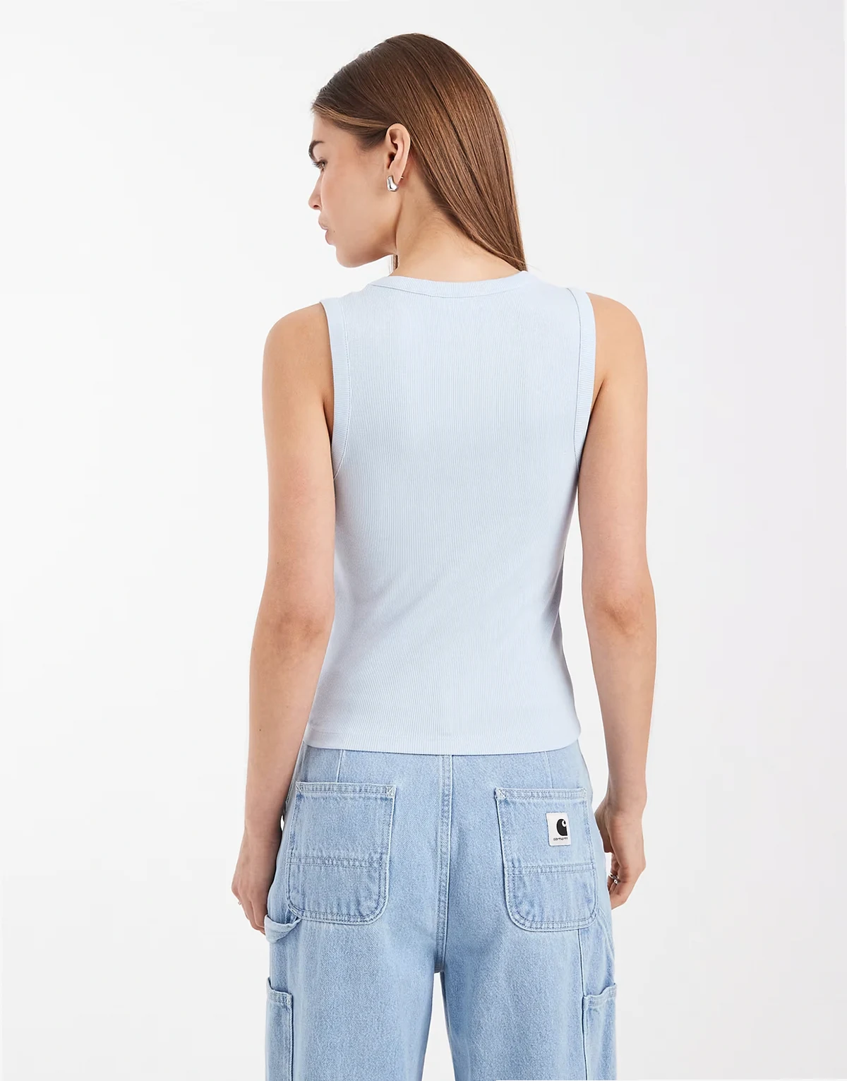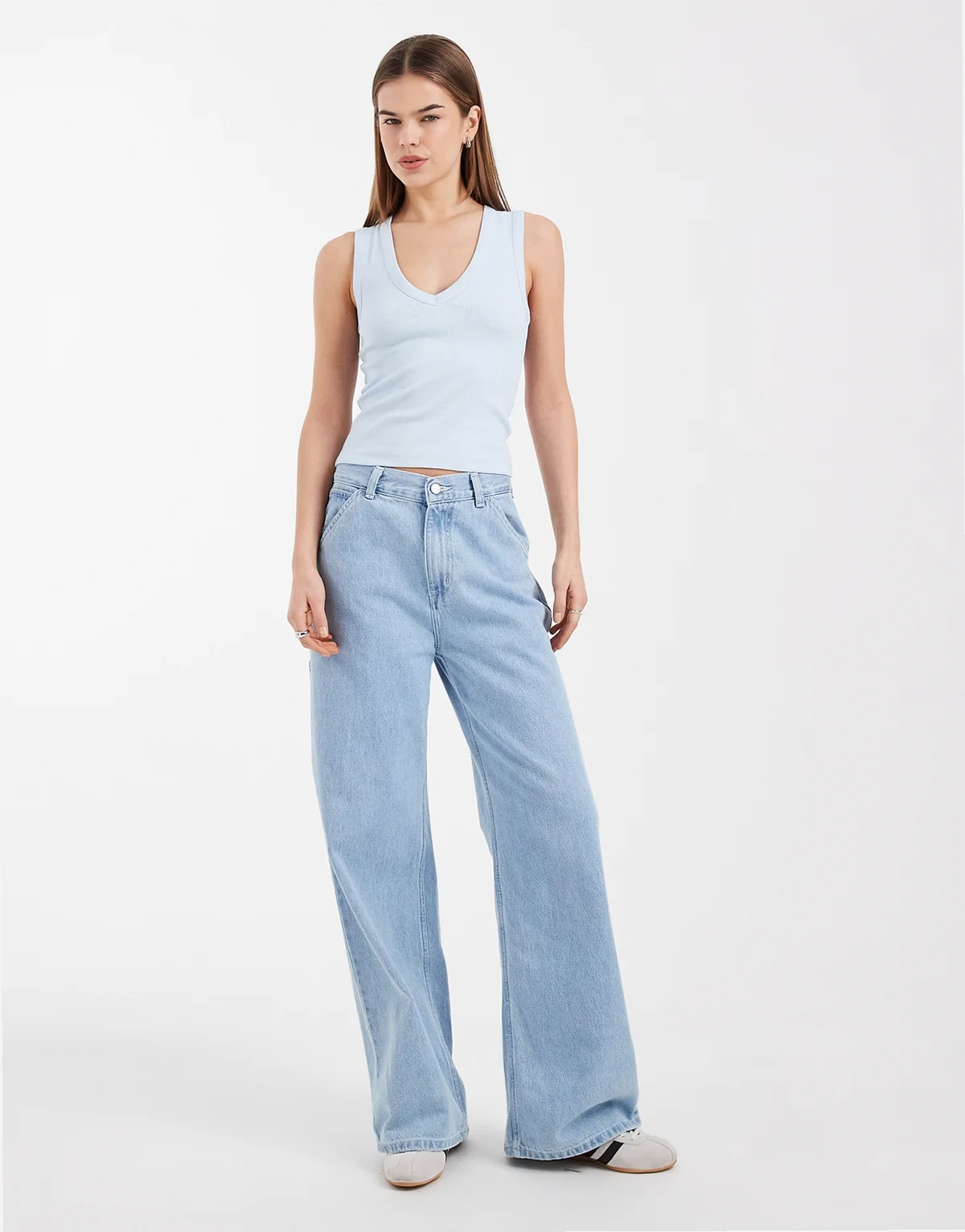 – Jasnoniebieski prążkowany podkoszulek z dekoltem w szpic