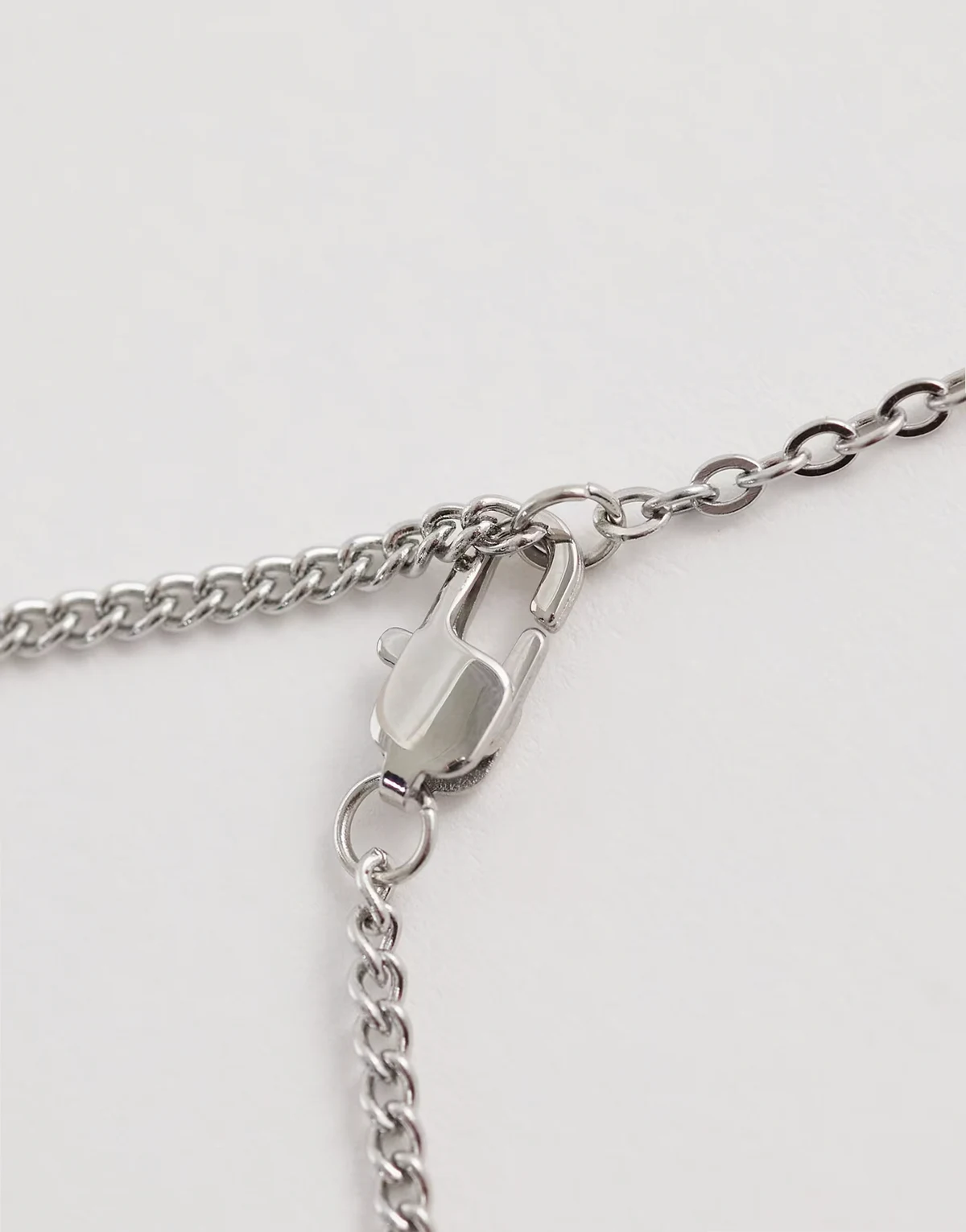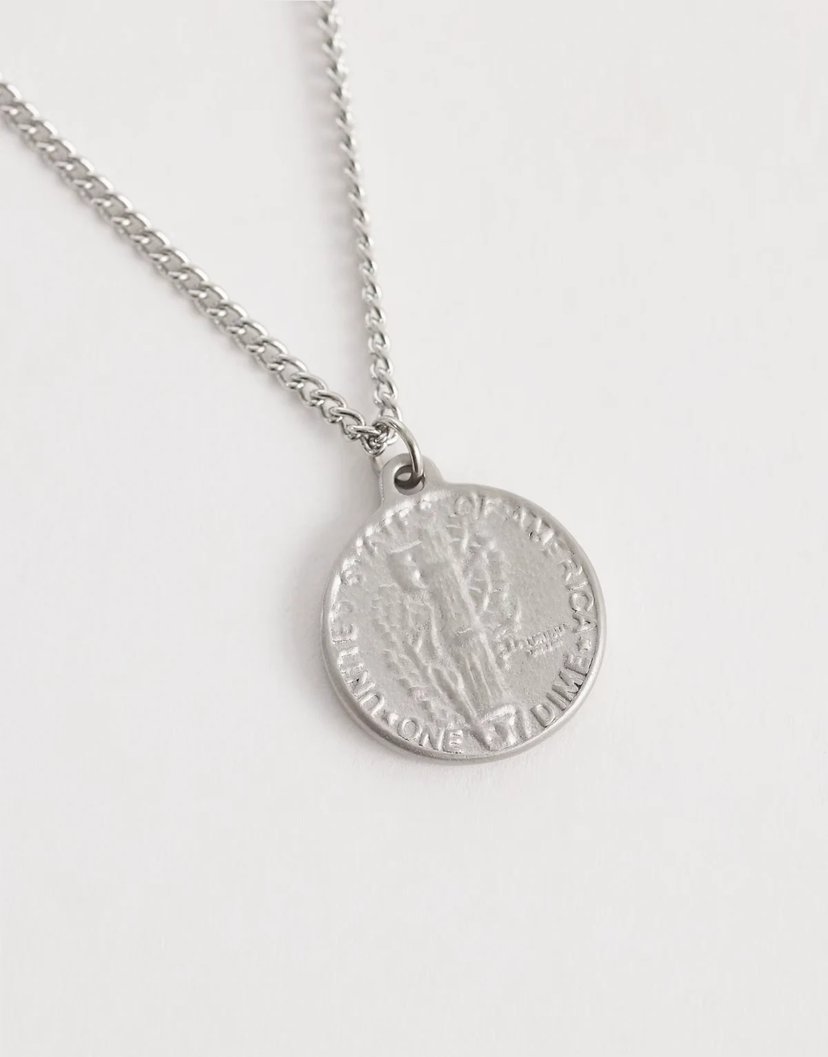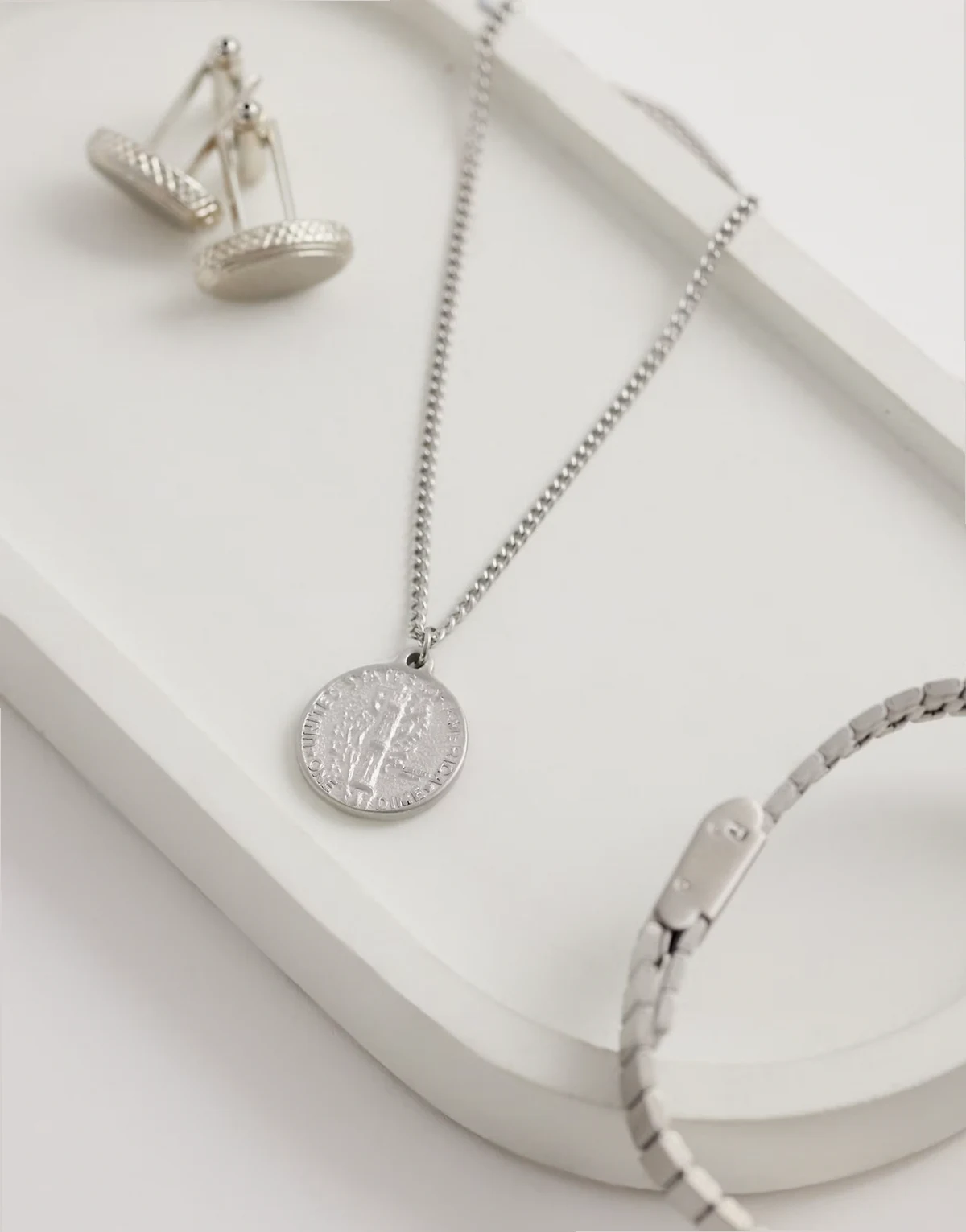 – Dwustronny naszyjnik ze stali nierdzewnej w kolorze srebra z zawieszką w kształcie monety