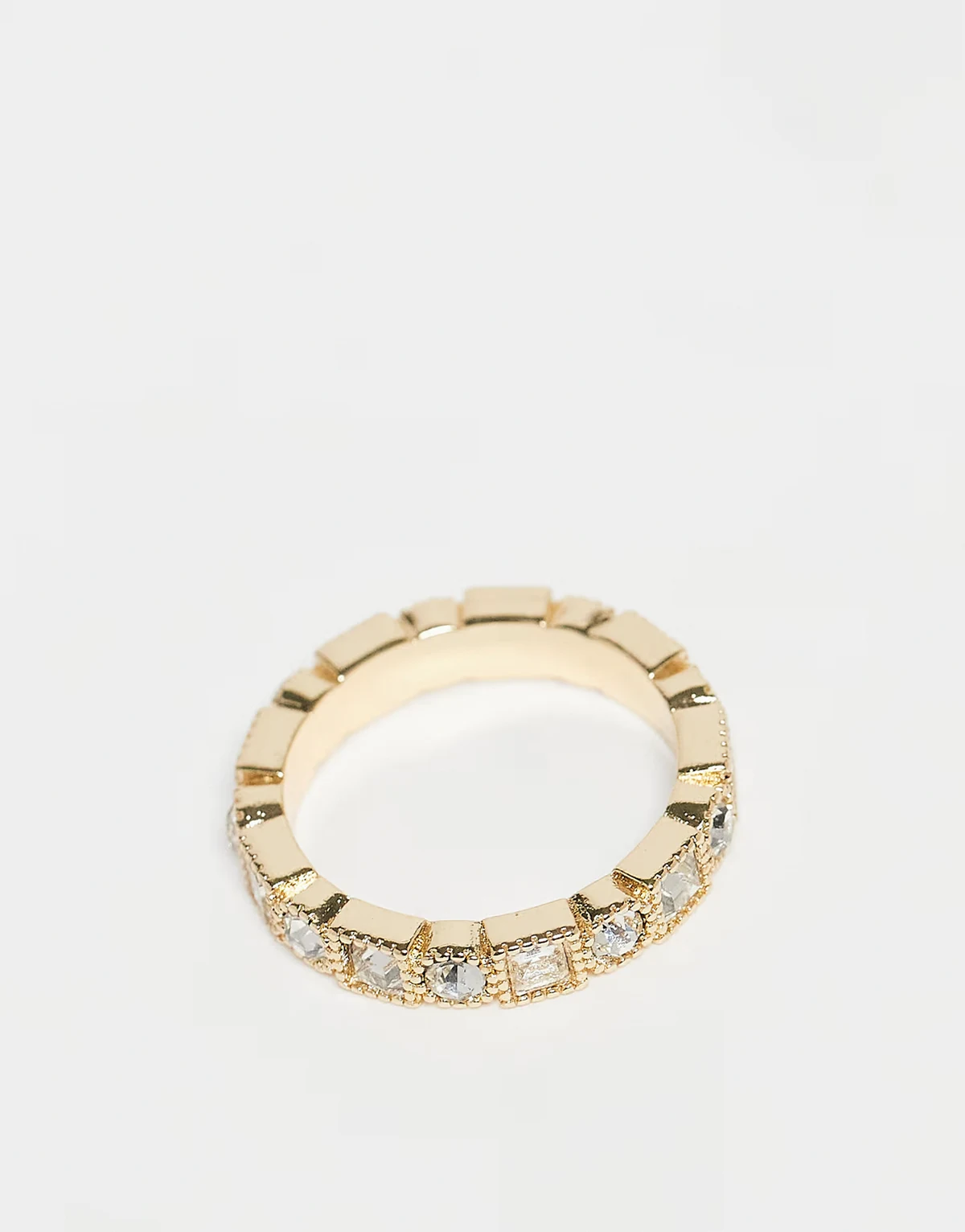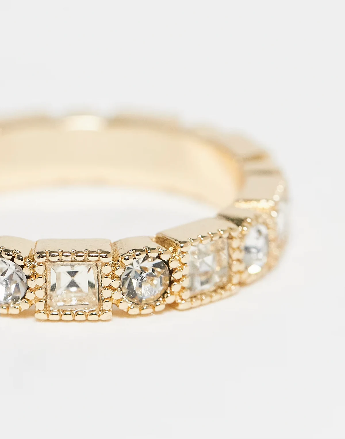 – Pierścionek obrączka w kolorze złotym z kwadratowymi i okrągłymi sztucznymi kryształkami