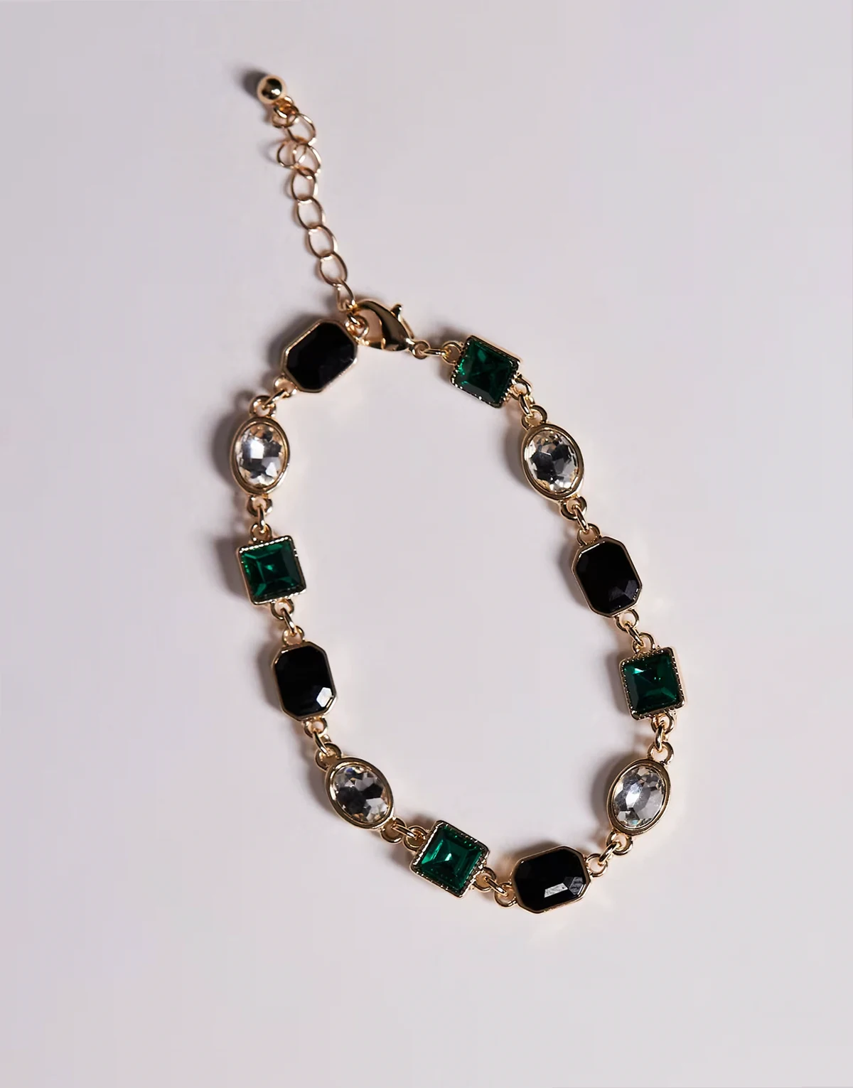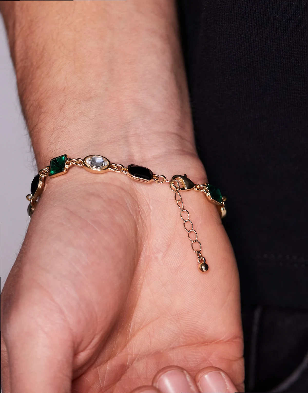 – Bransoletka w kolorze złota z czarnymi, szmaragdowymi i kryształkowymi kamieniami