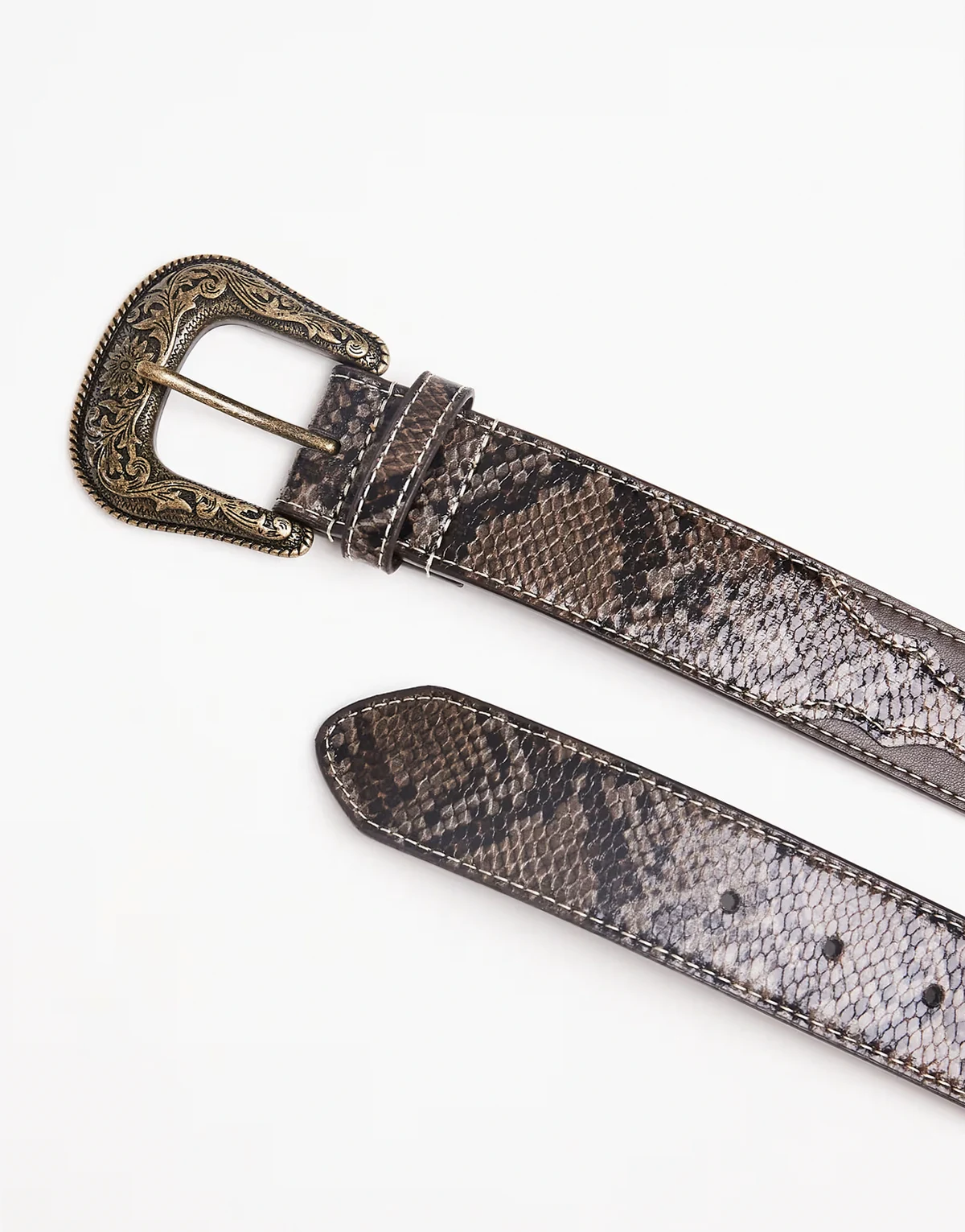 – Brązowy pasek z imitacji skóry w kowbojskim stylu ze wstawką ze wzorem skóry węża
