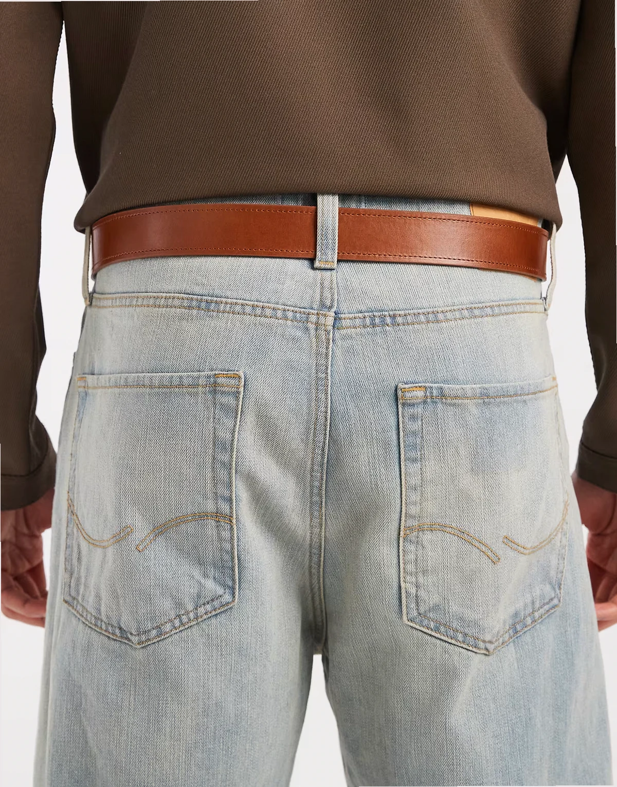 – Kremowy skórzany pasek do jeansów z klamrą do noszenia w talii lub na biodrach