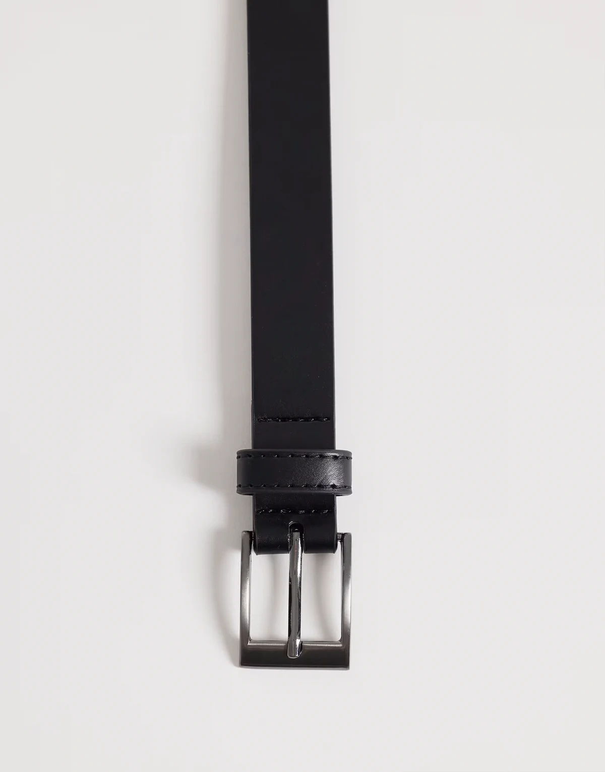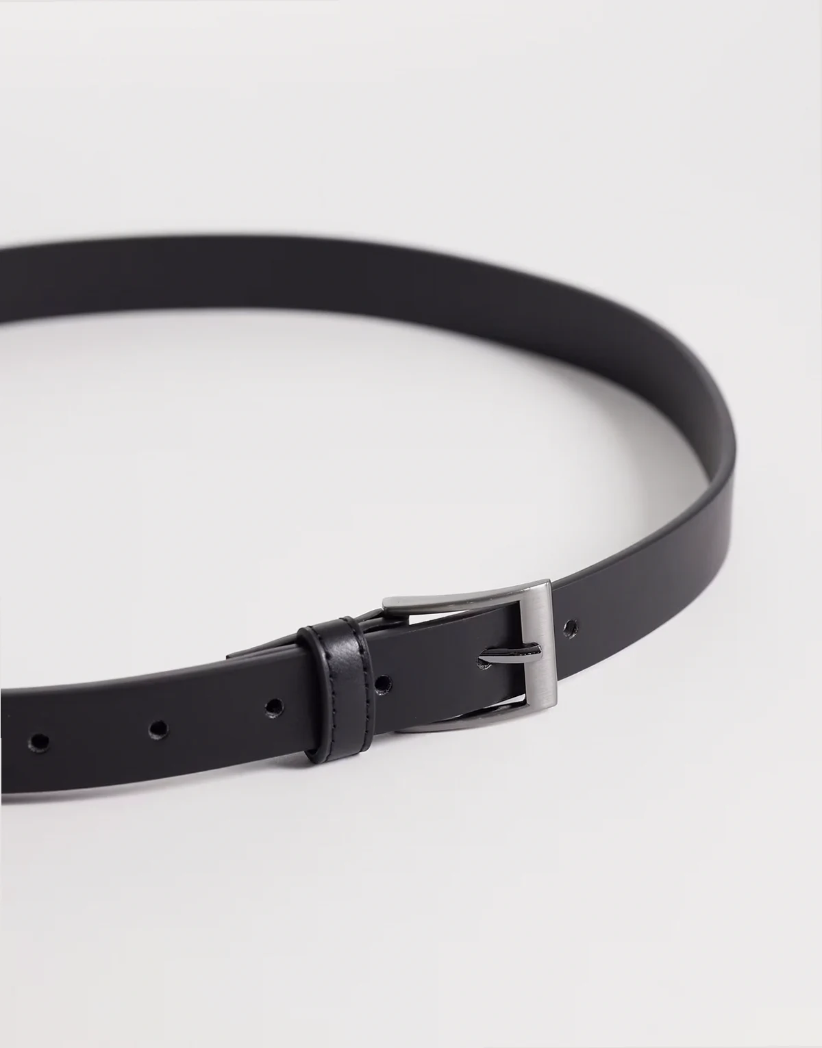 – Czarny cienki pasek z imitacji skóry ze stalowoszarą sprzączką