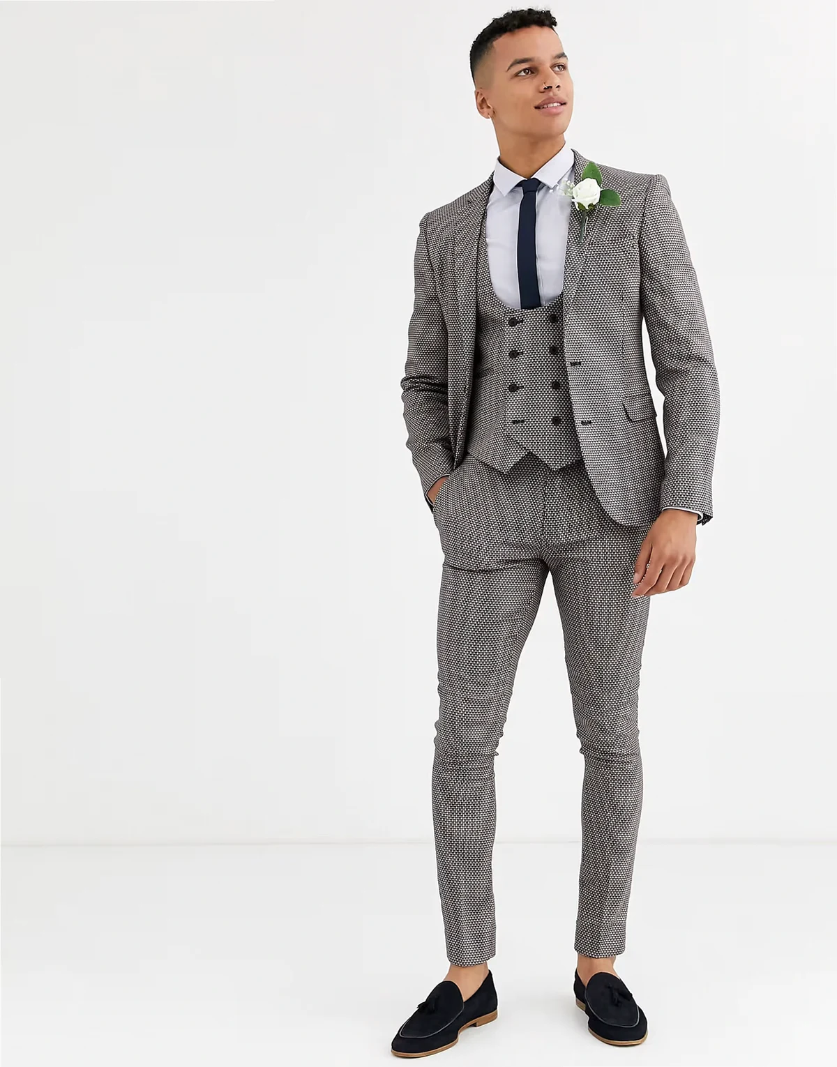 – Ślubna marynarka garniturowa o bardzo obcisłym kroju w kolorze teksturowanej szarości