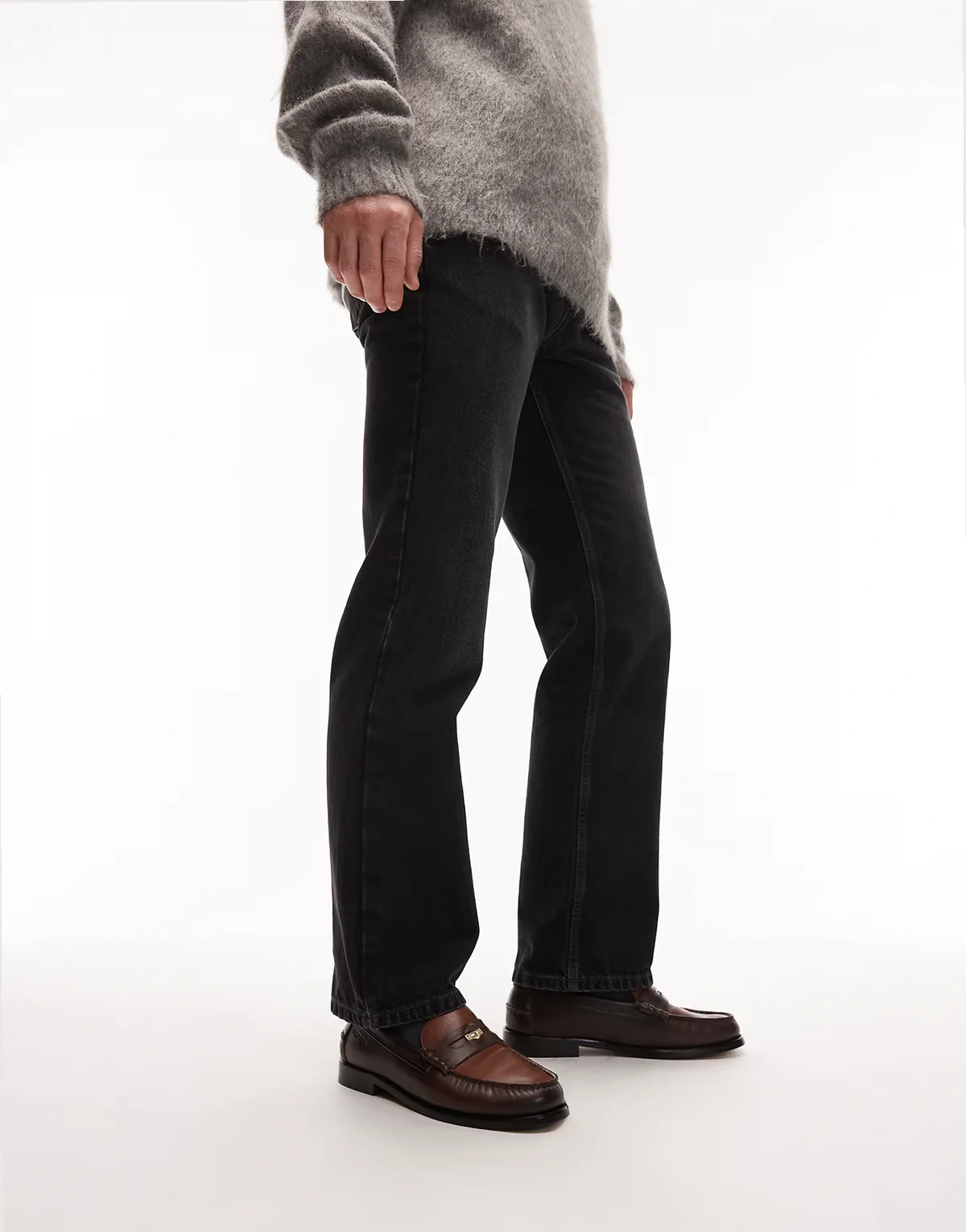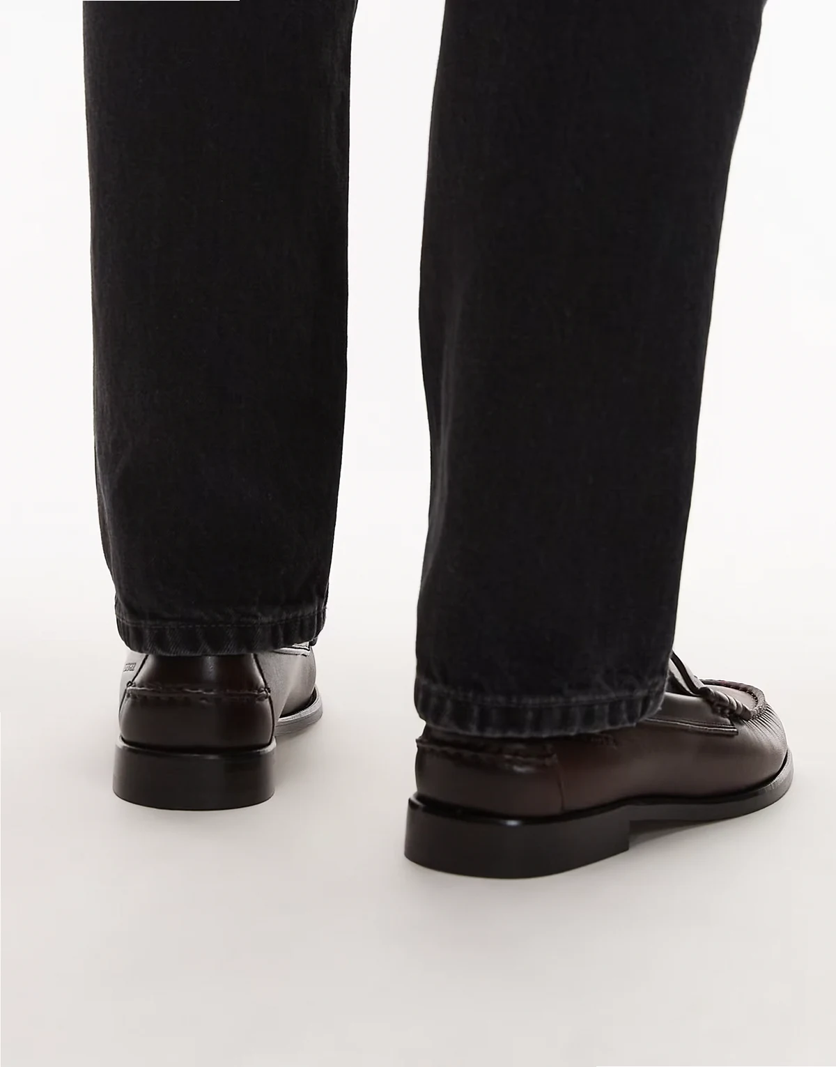 – Czarne loafersy z kwadratowymi noskami i frędzlami