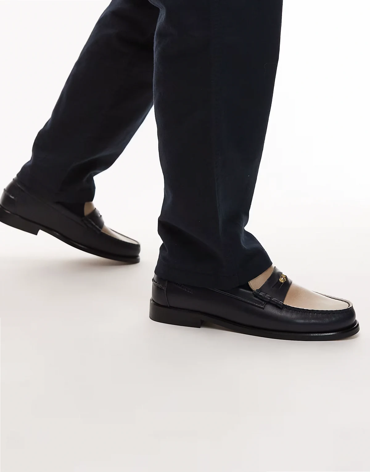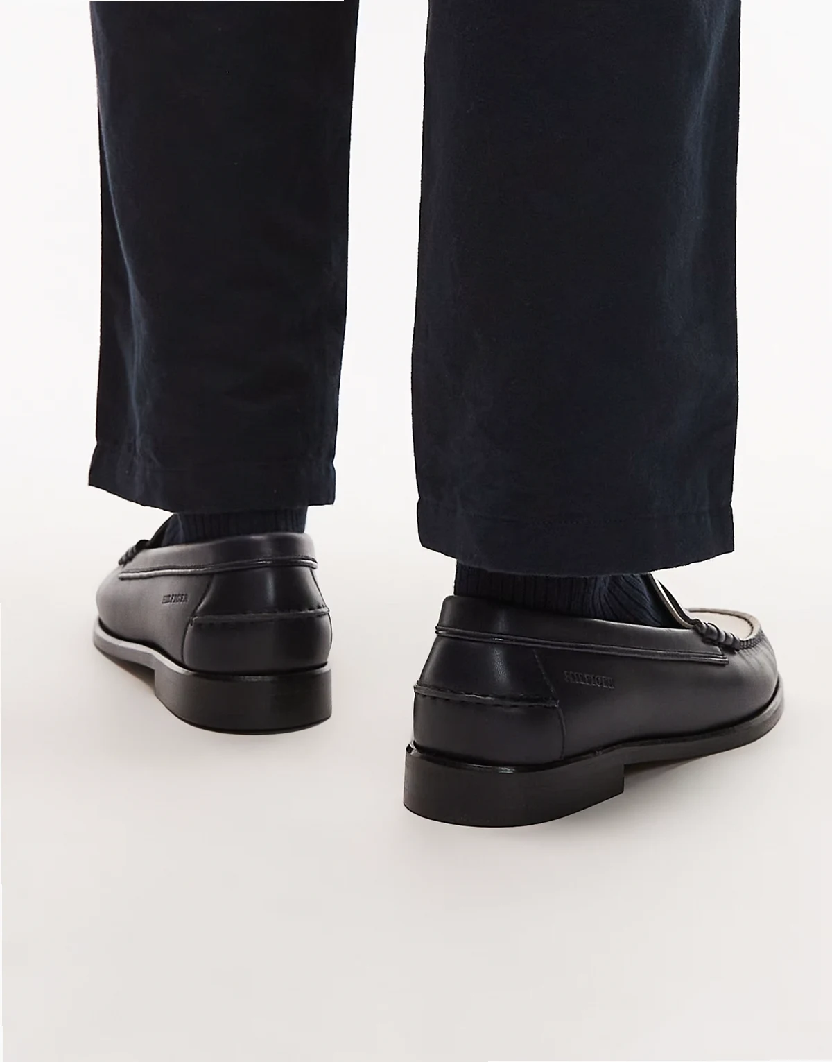 – Czarne loafersy z kwadratowymi noskami i frędzlami