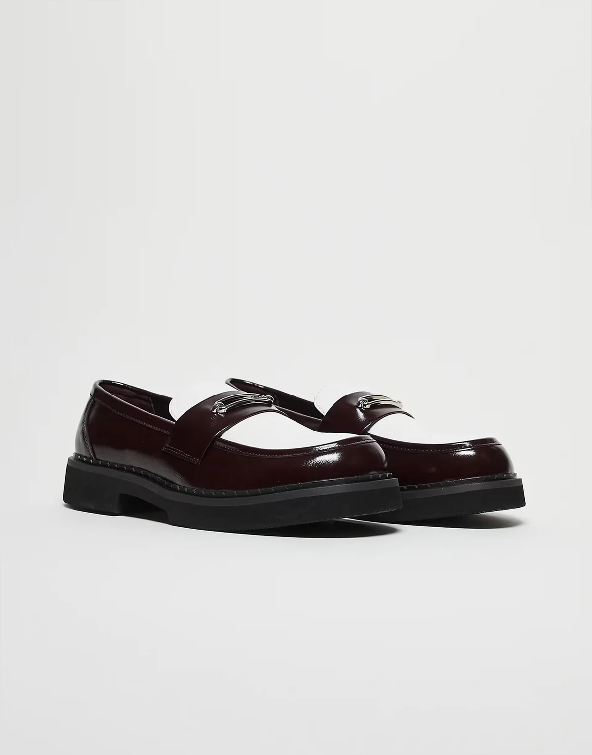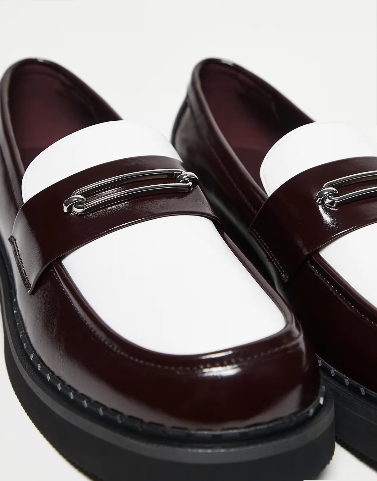 – Bordowo-białe loafersy ze srebrną sprzączką