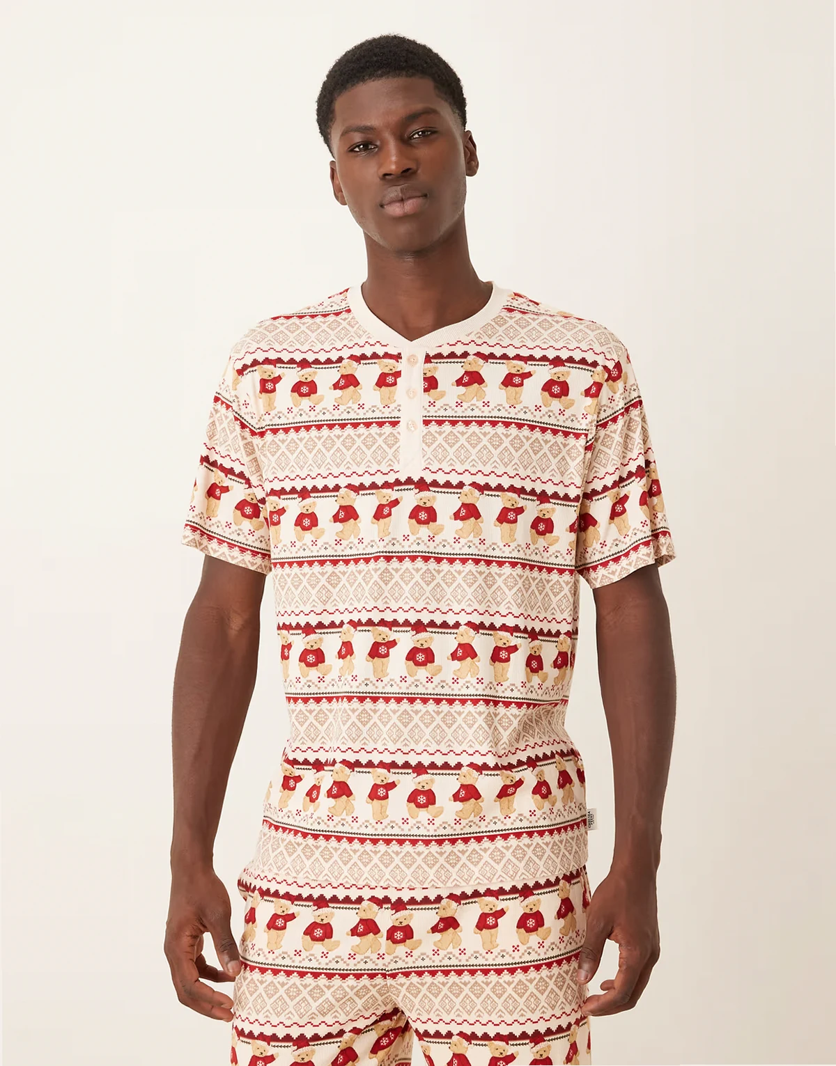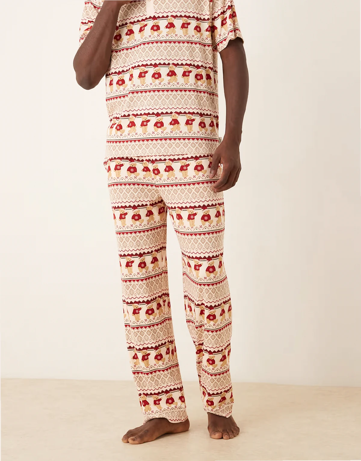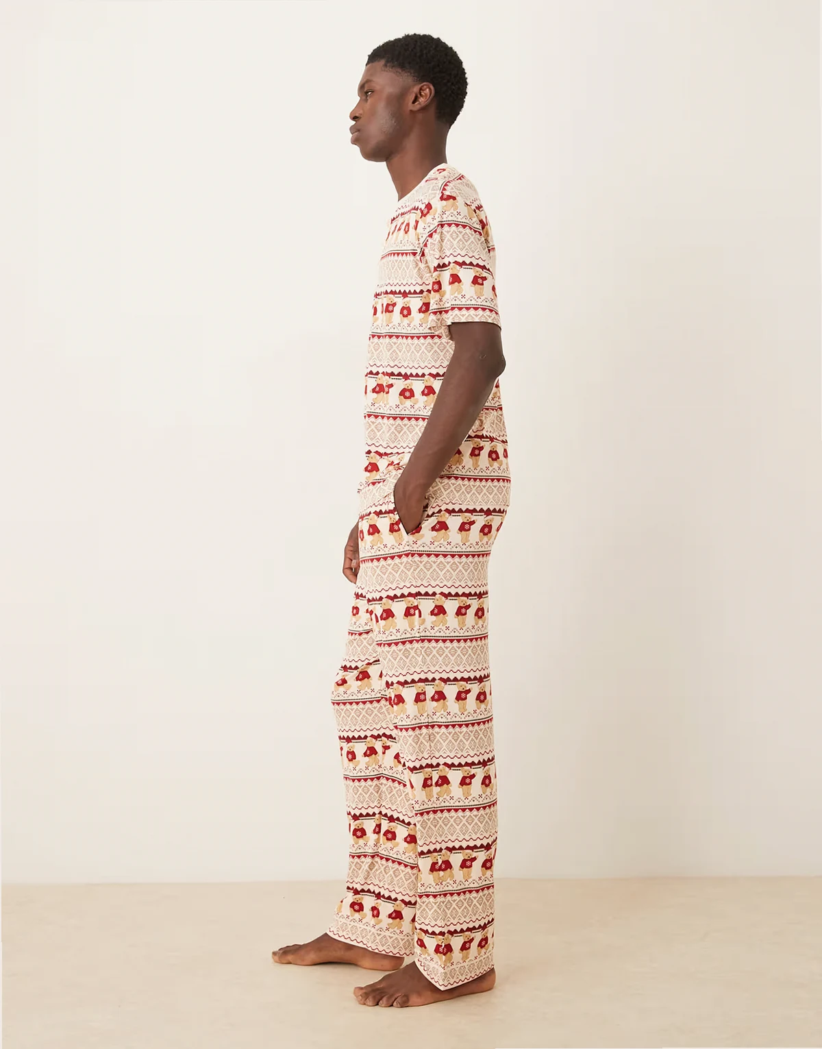 – Kolorowa świąteczna piżama z materiału typu misiek w skandynawski wzór: T-shirt i spodnie