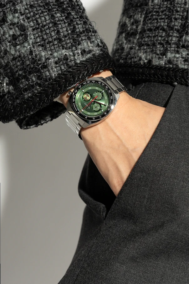 Tarcza wyposażona jest w chronograf z trzema małymi tarczami (subdials) oraz tachymetr wokół zewnętrznej krawędzi, co pozwala na precyzyjne mierzenie czasu i prędkości. Wskazówki w kolorze białym oraz czerwony sekundnik dodają wyrafinowanego kontrastu.