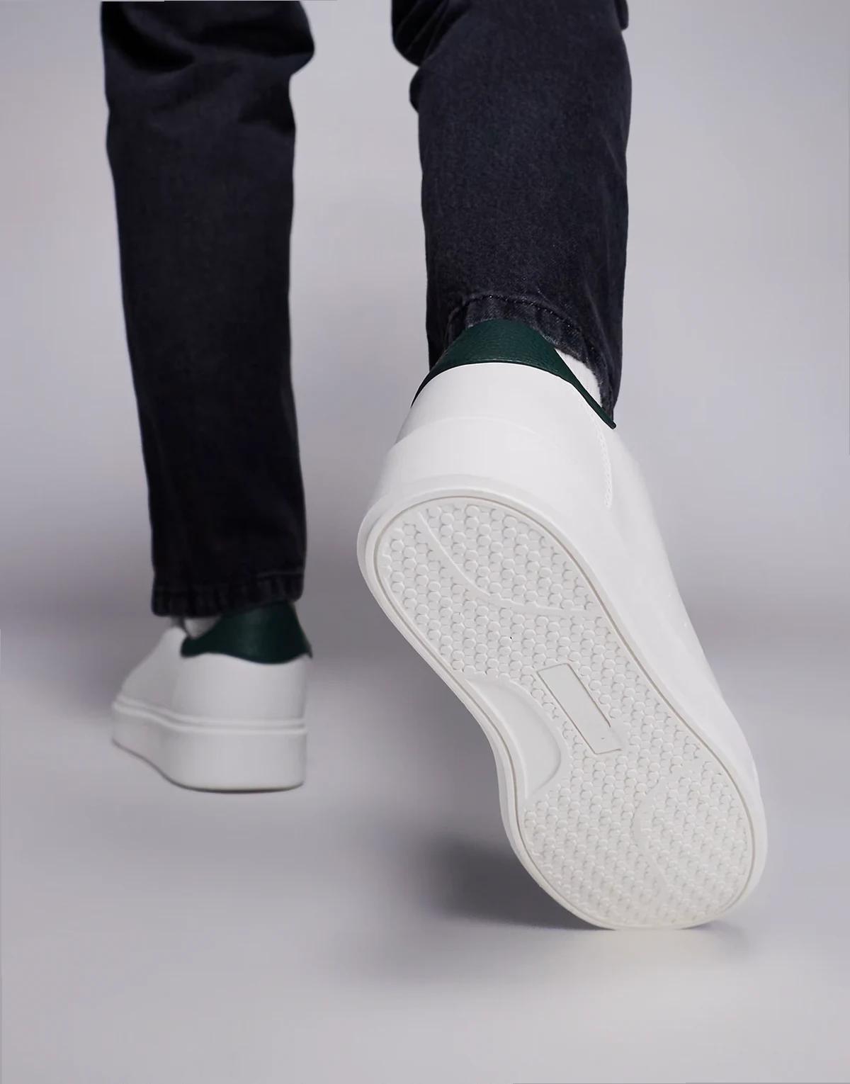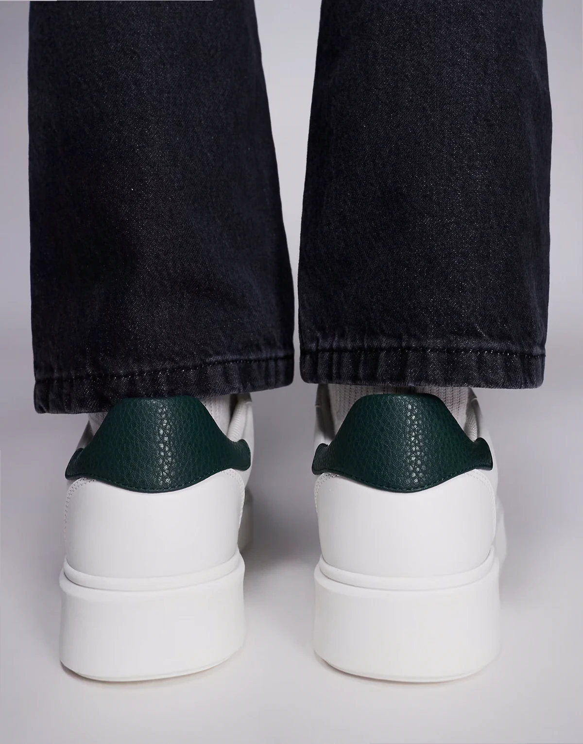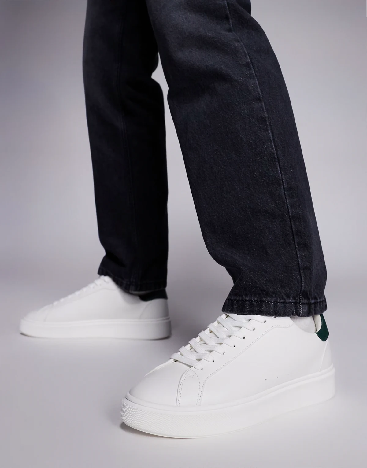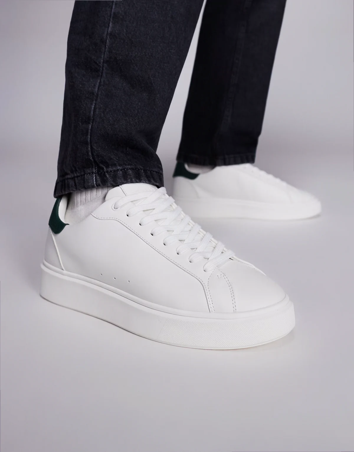 – Białe sznurowane buty sportowe z ciemnozielonymi wstawkami