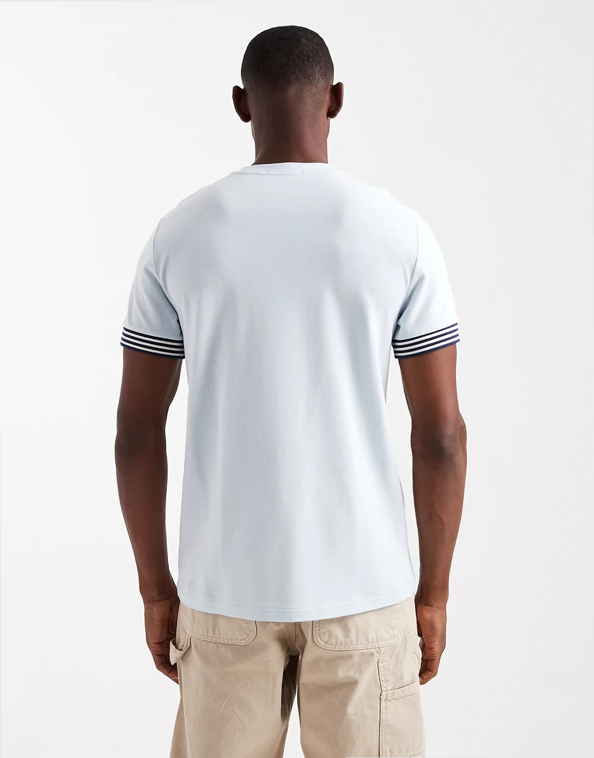 – Jasnoniebieski T-shirt z mankietami w paski