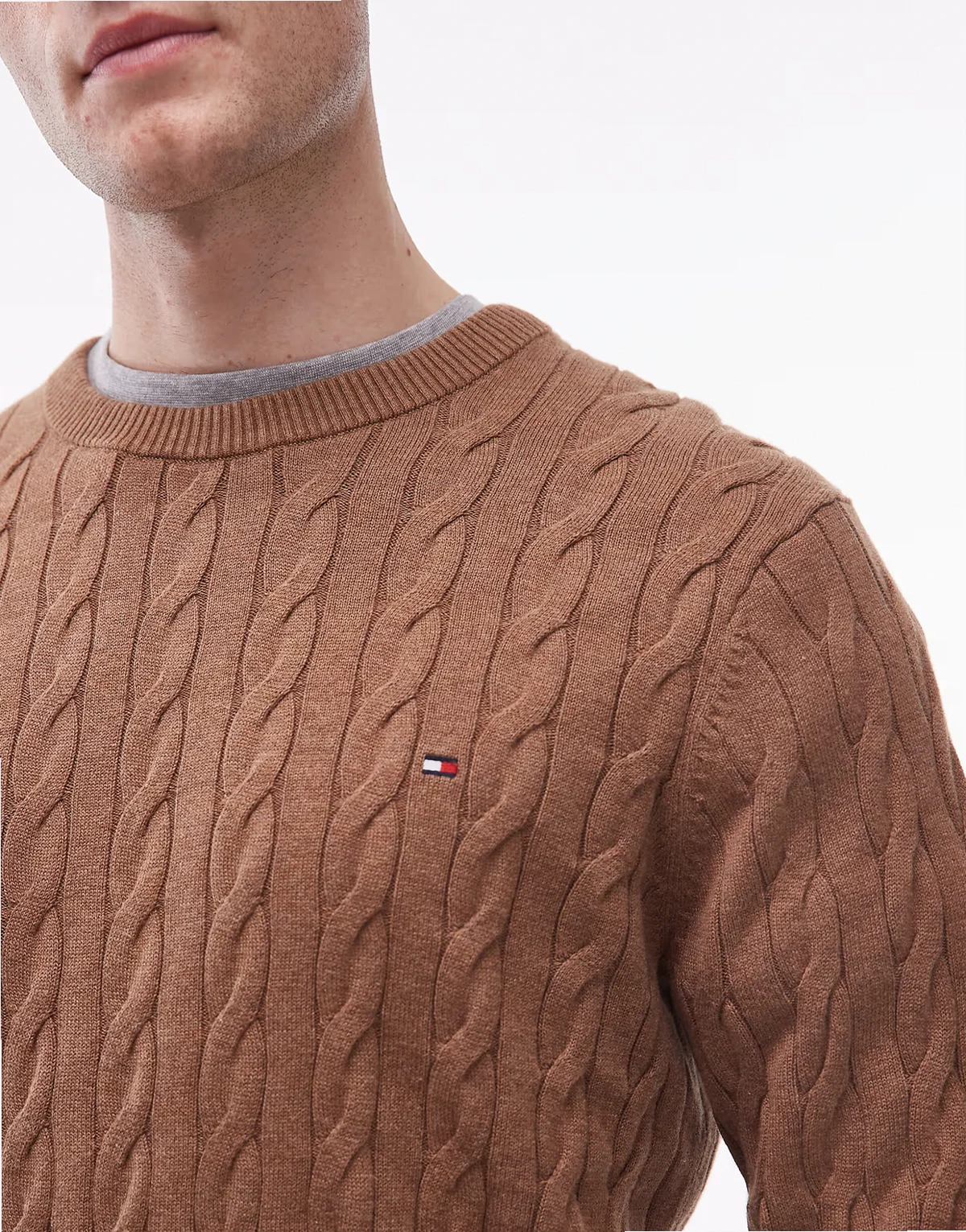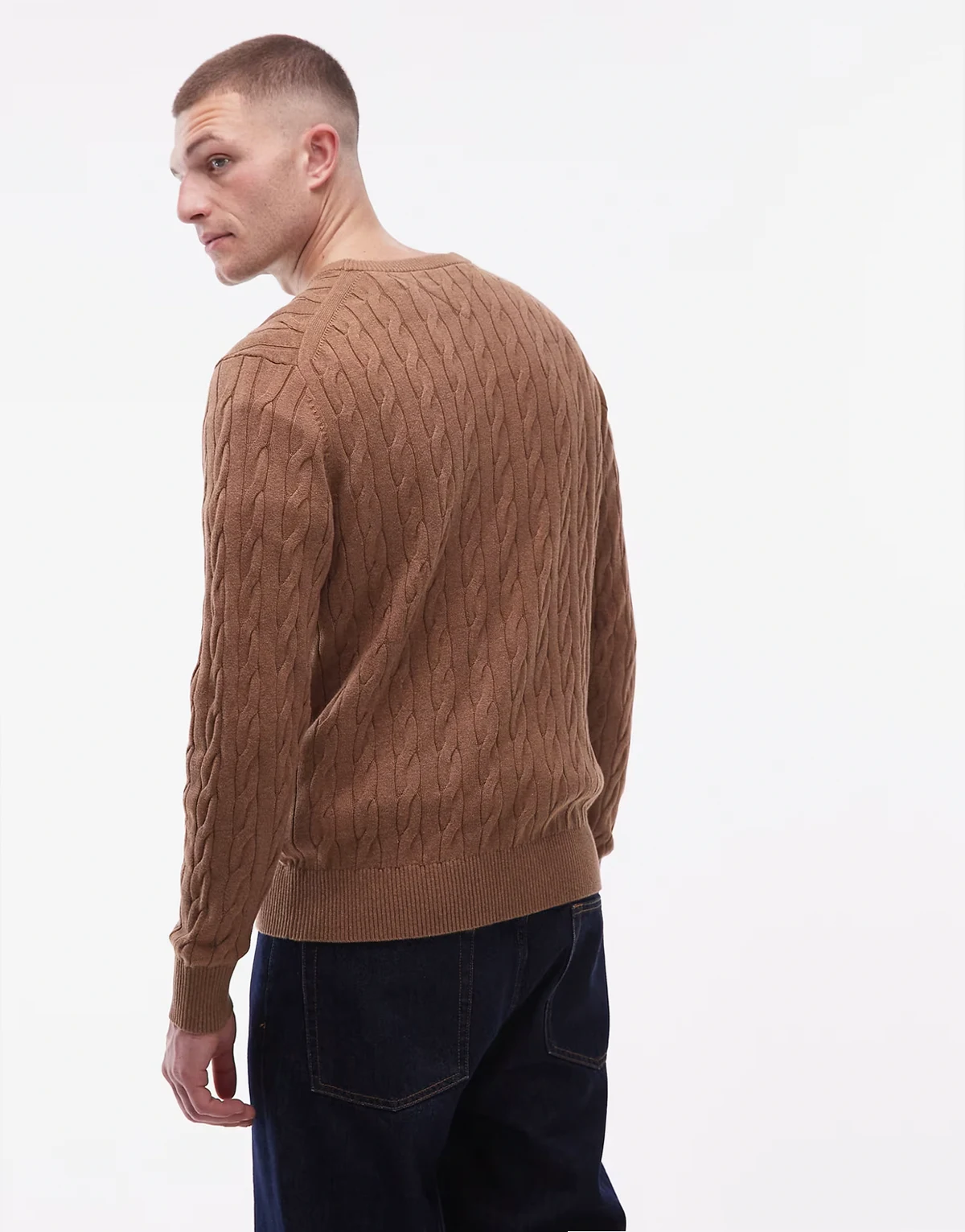 – Brązowy sweter z grubej dzianiny o warkoczowym splocie