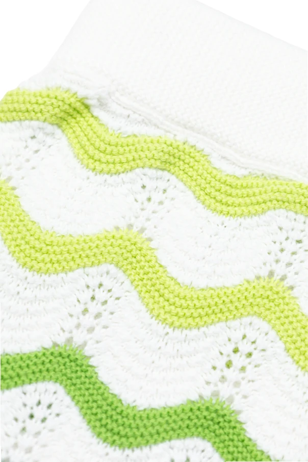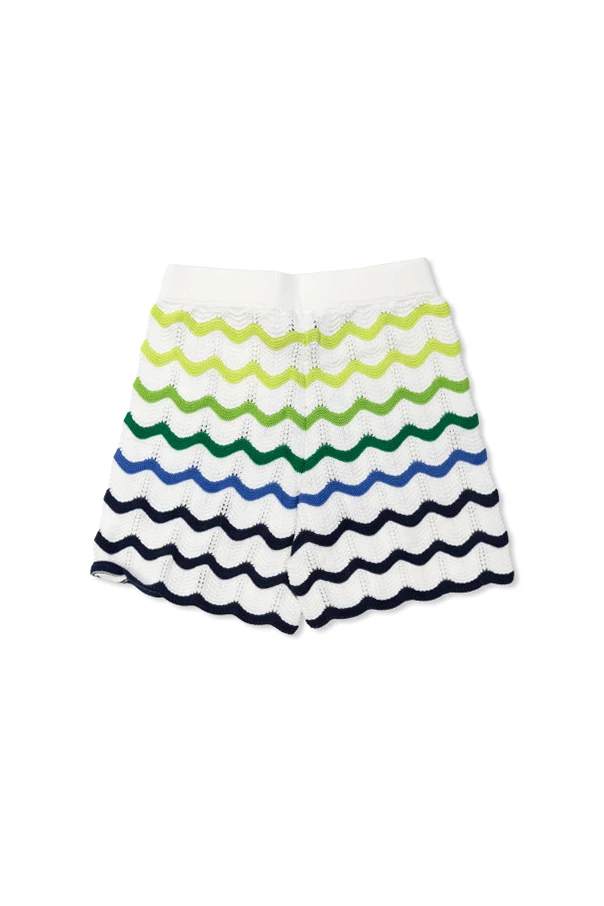 Szorty z naszywką z logo od Casablanca Kids to propozycja dla wymagających młodych miłośników stylu. Klasyczny fason z prostą nogawką oraz szeroki, elastyczny ściągacz subtelnie podkreślają komfort noszenia. Wielokolorowy, zygzakowaty wzór harmonijnie łączy biel, żółć, limonkę, zieleń, niebieski i granat, tworząc wyraziste, równoległe pasy, które intrygują i przyciągają spojrzenia.