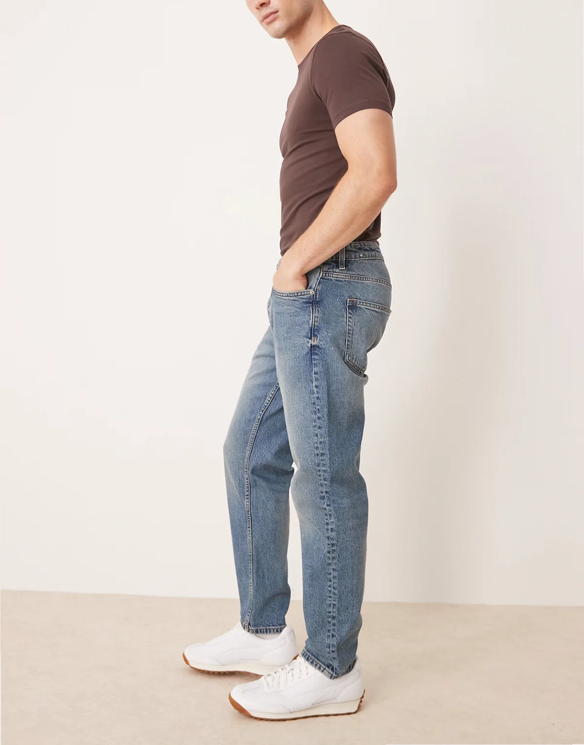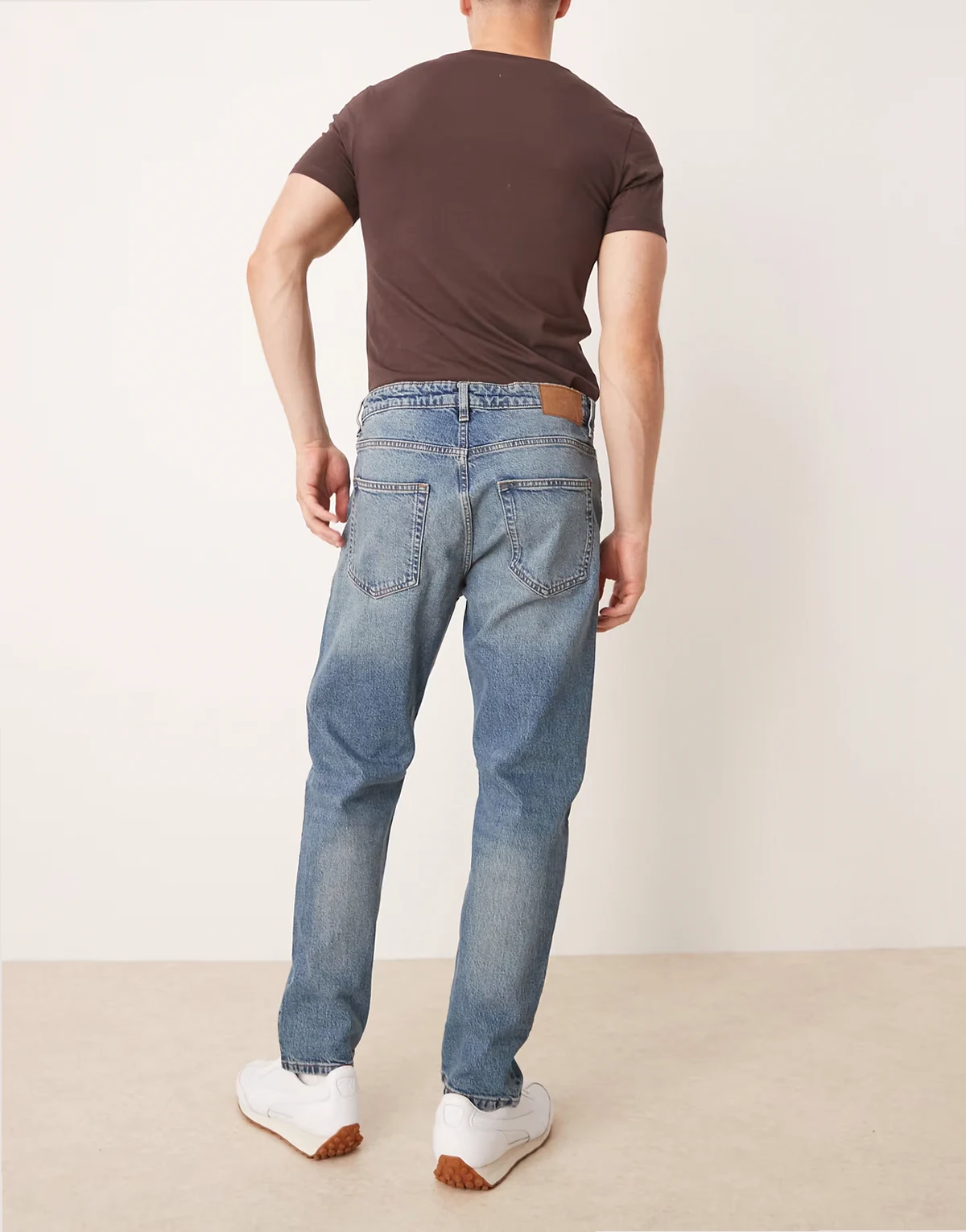 – Ciemnoniebieskie jeansy ze zwężanymi nogawkami