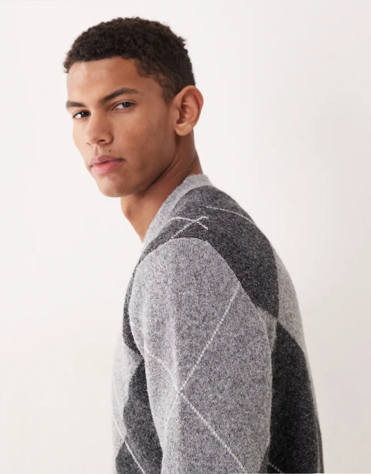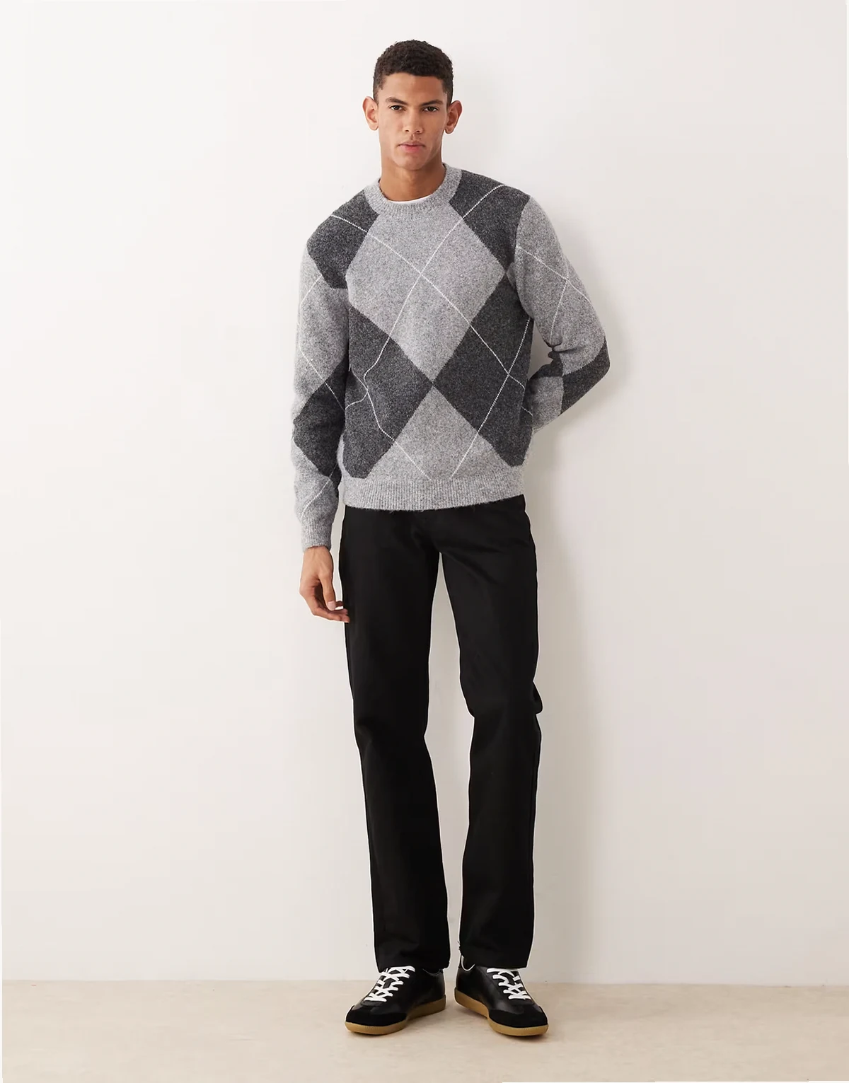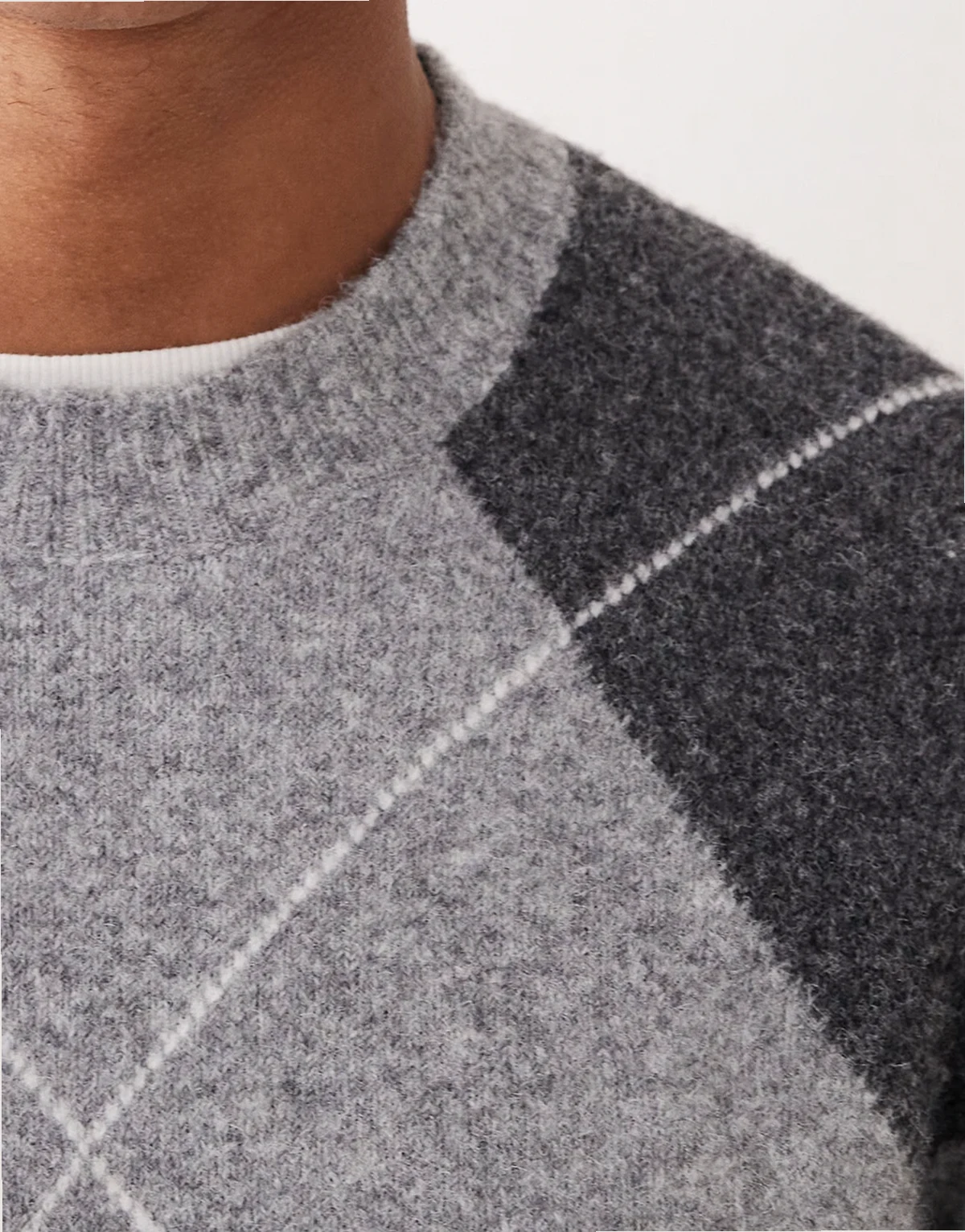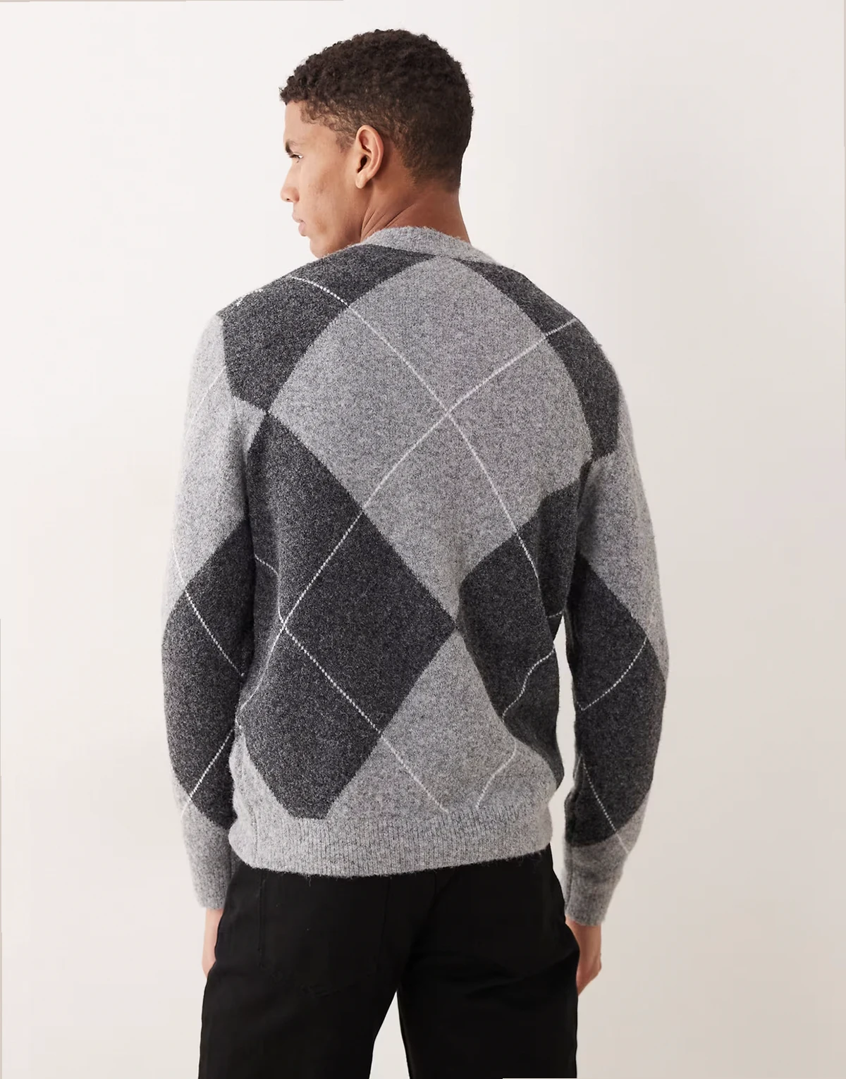 – Szary sweter z mieszanki wełny we wzór w romby