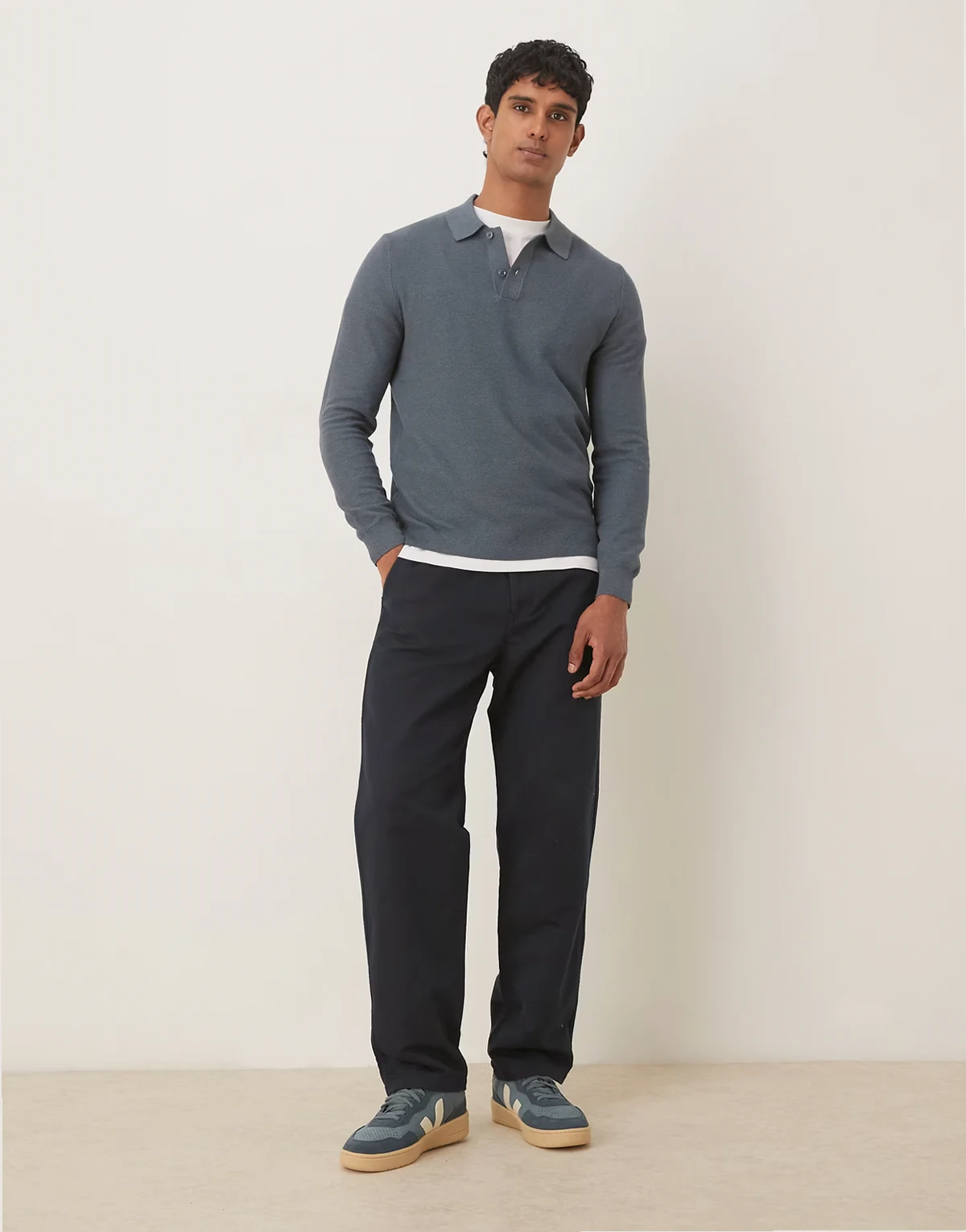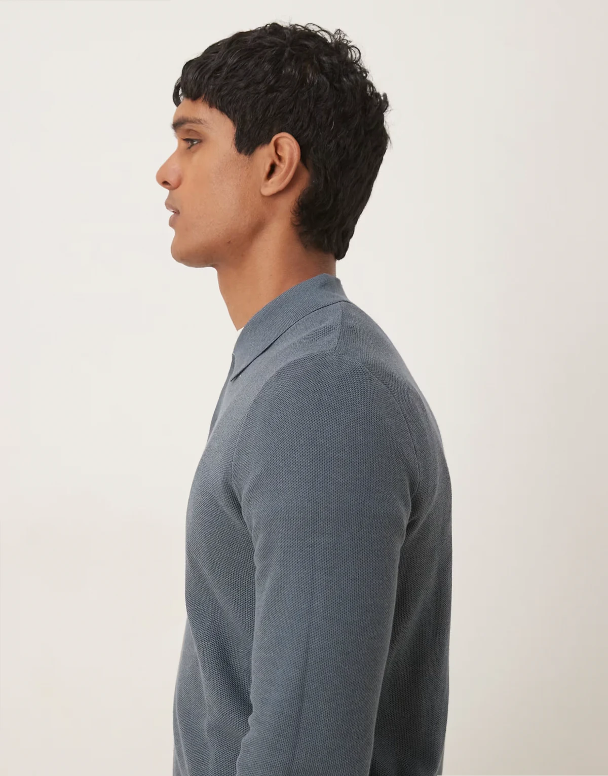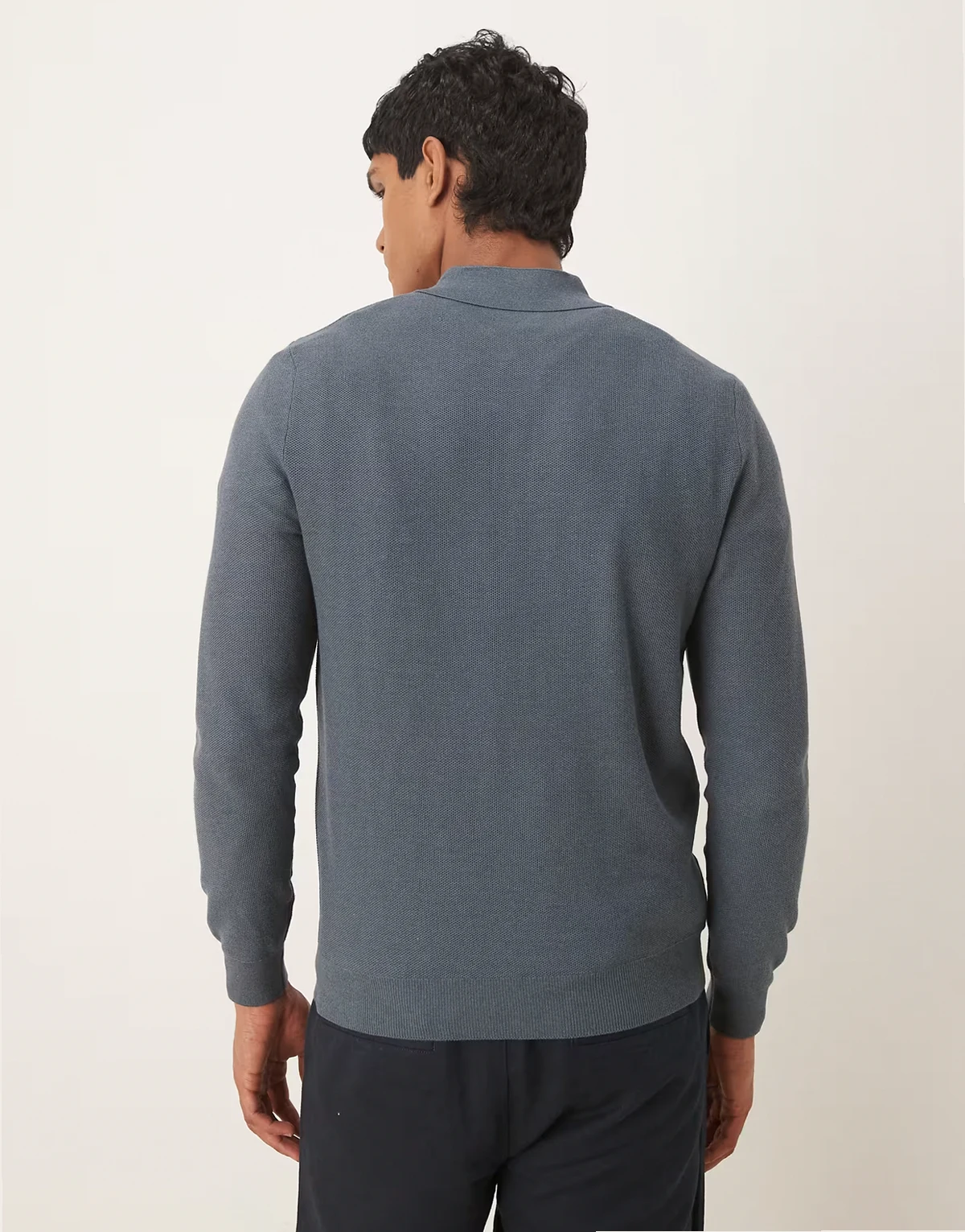 – Szary dzianinowy top z mieszaki bawełny z kołnierzykiem polo i długimi rękawami