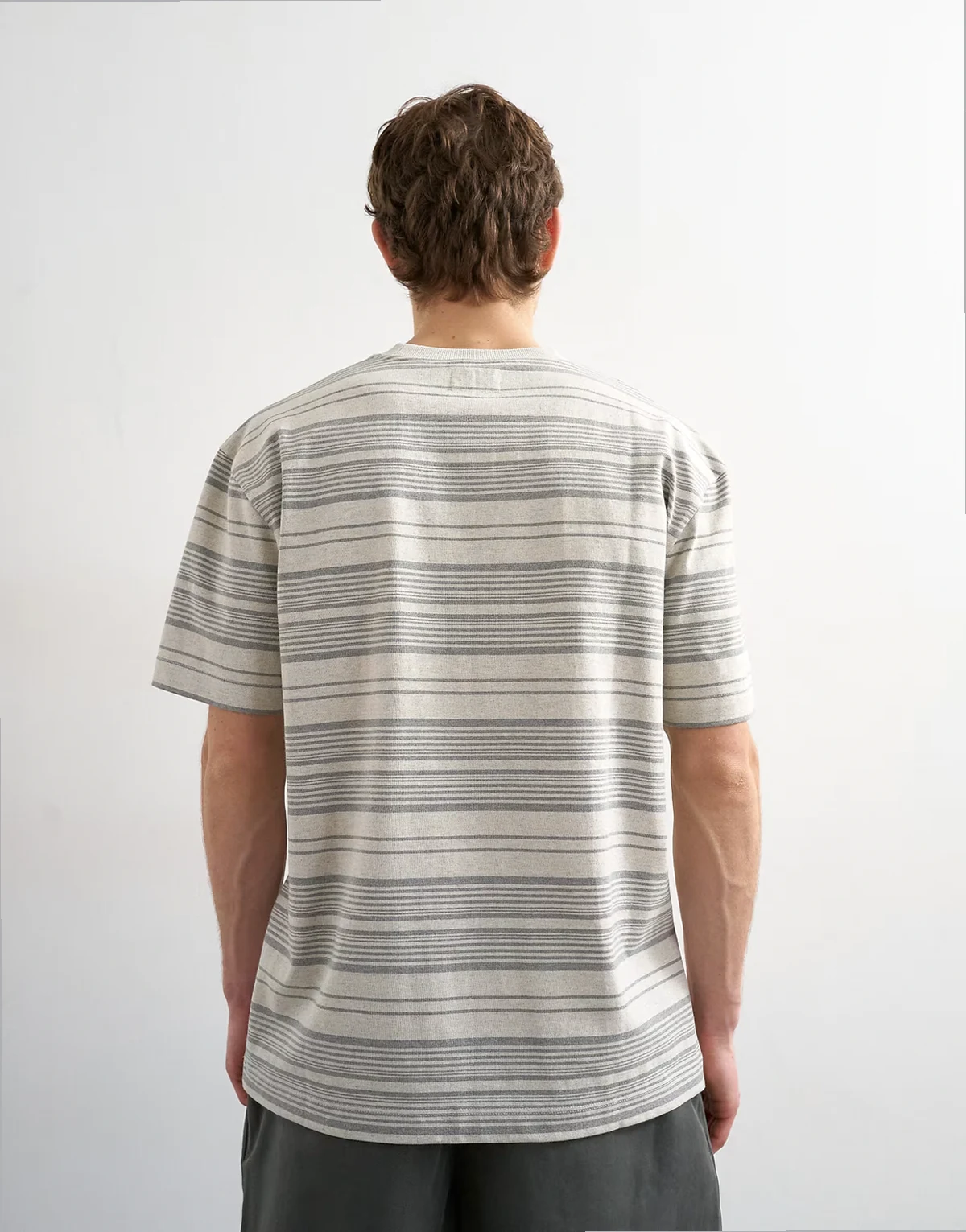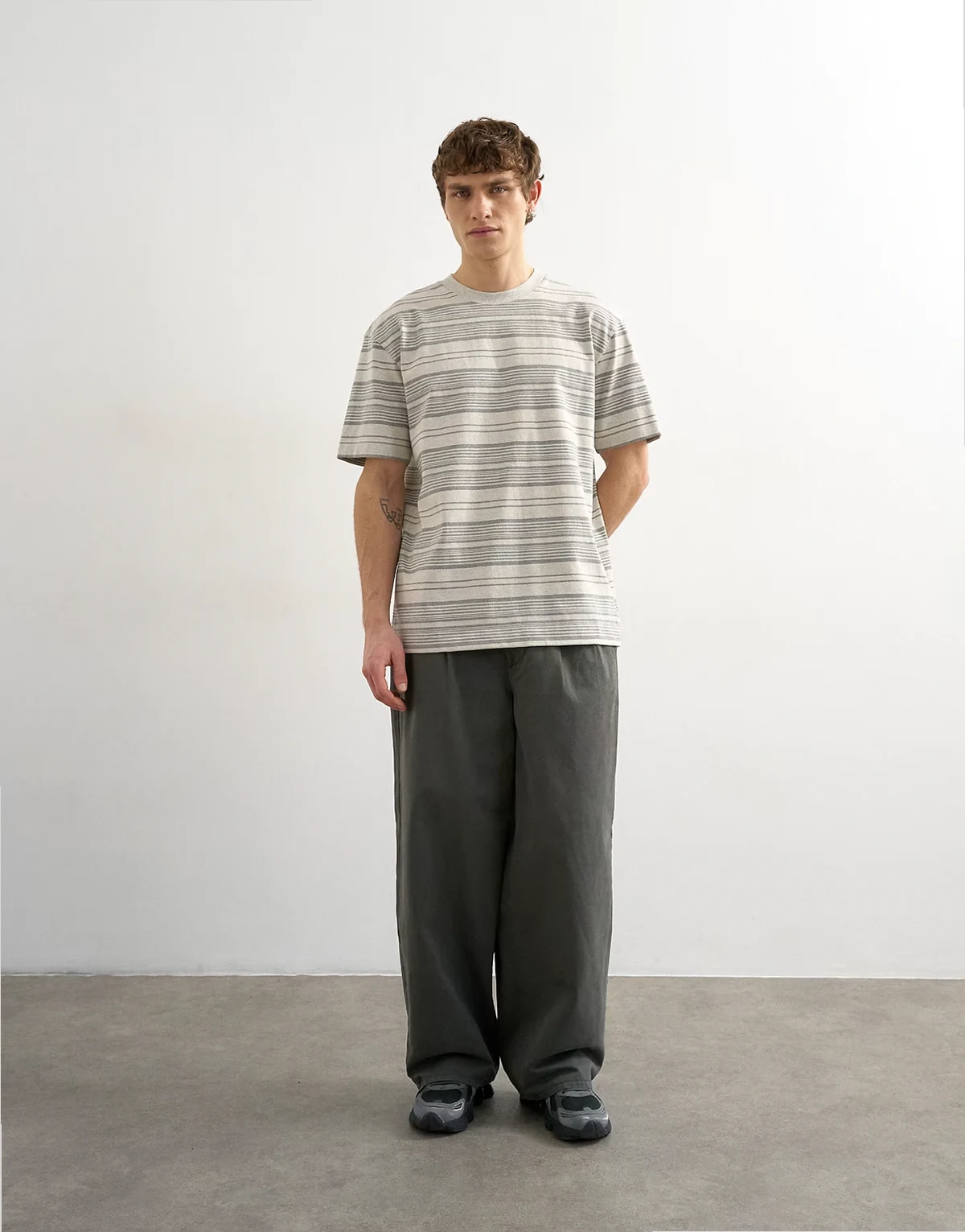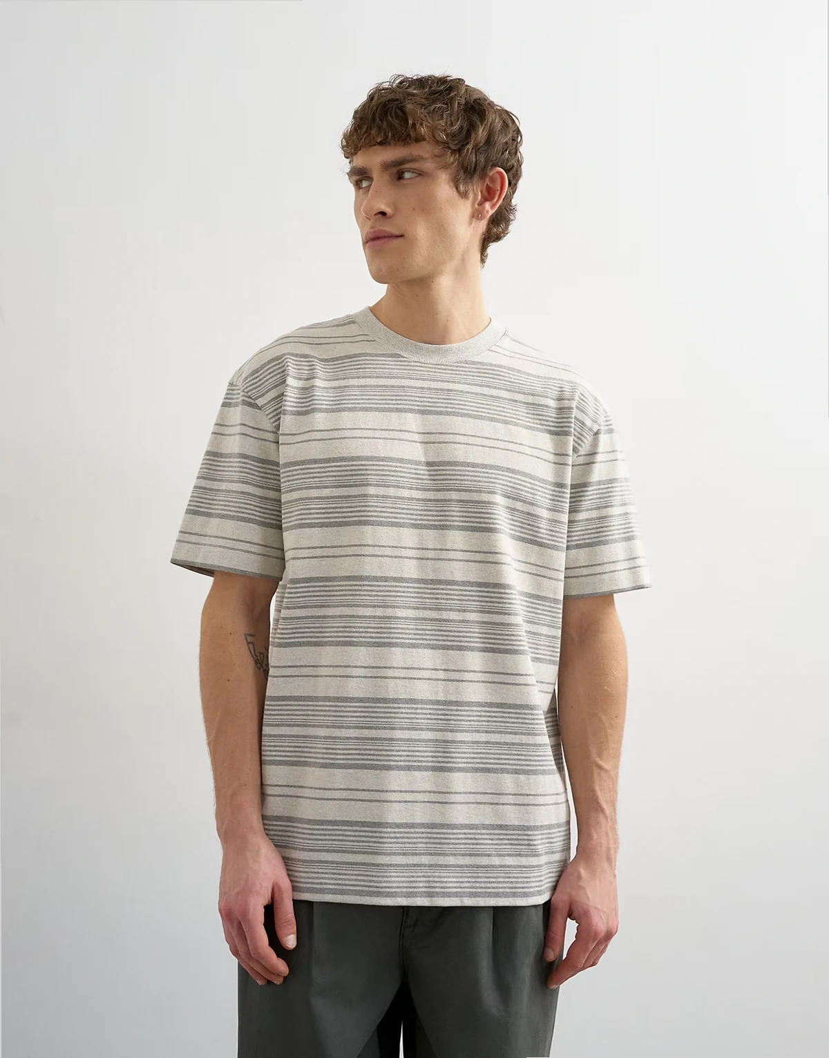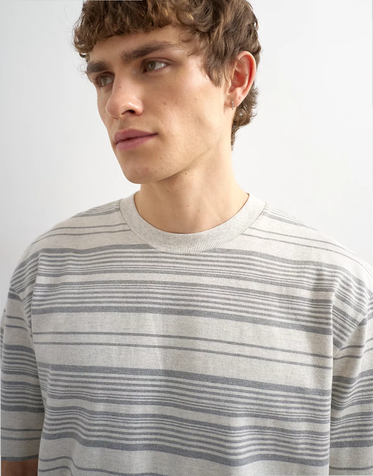 Ten T-shirt uszyto z miękkiego, elastycznego dżerseju w paski. Ma okrągły dekolt, krótkie rękawy i luźny krój.