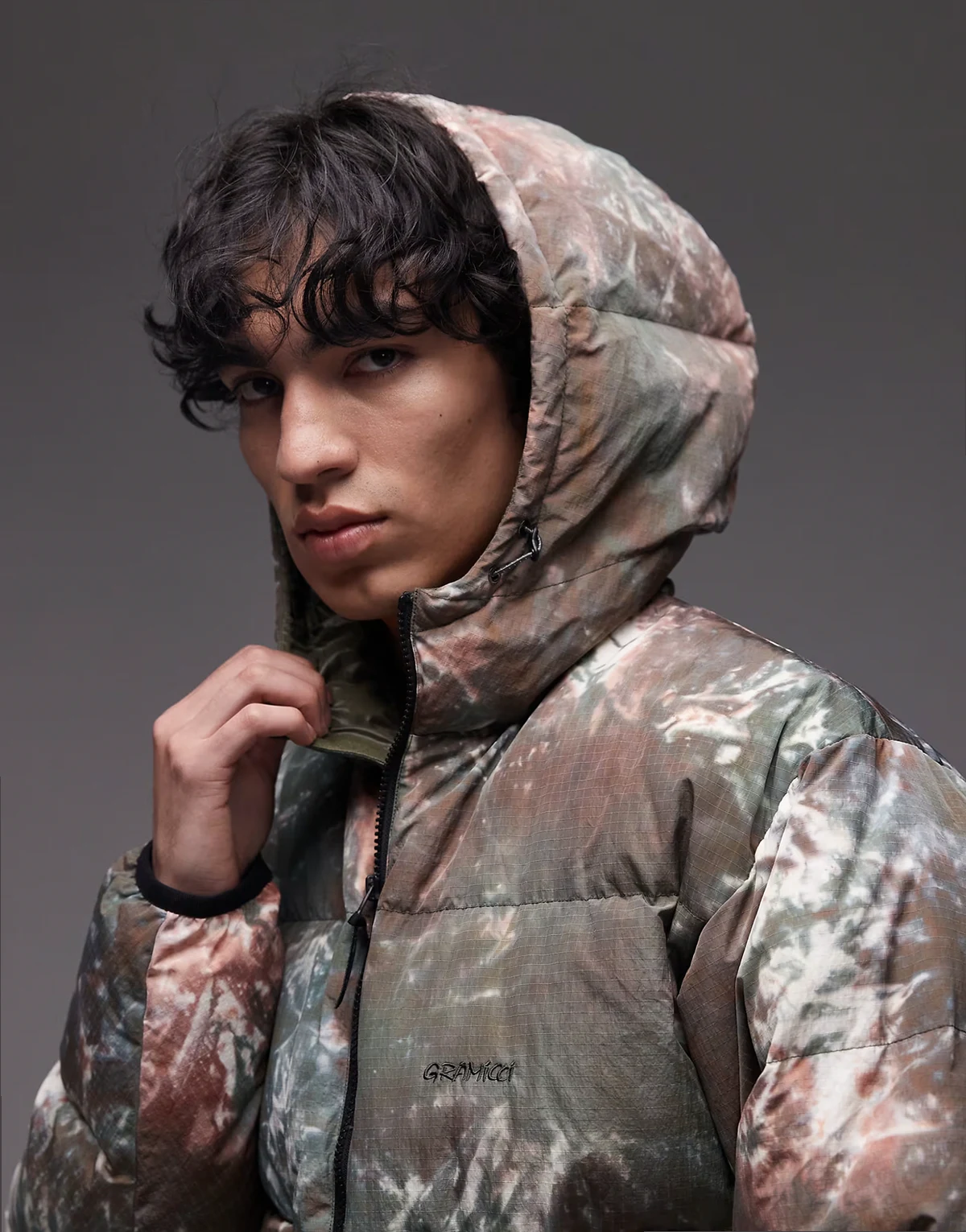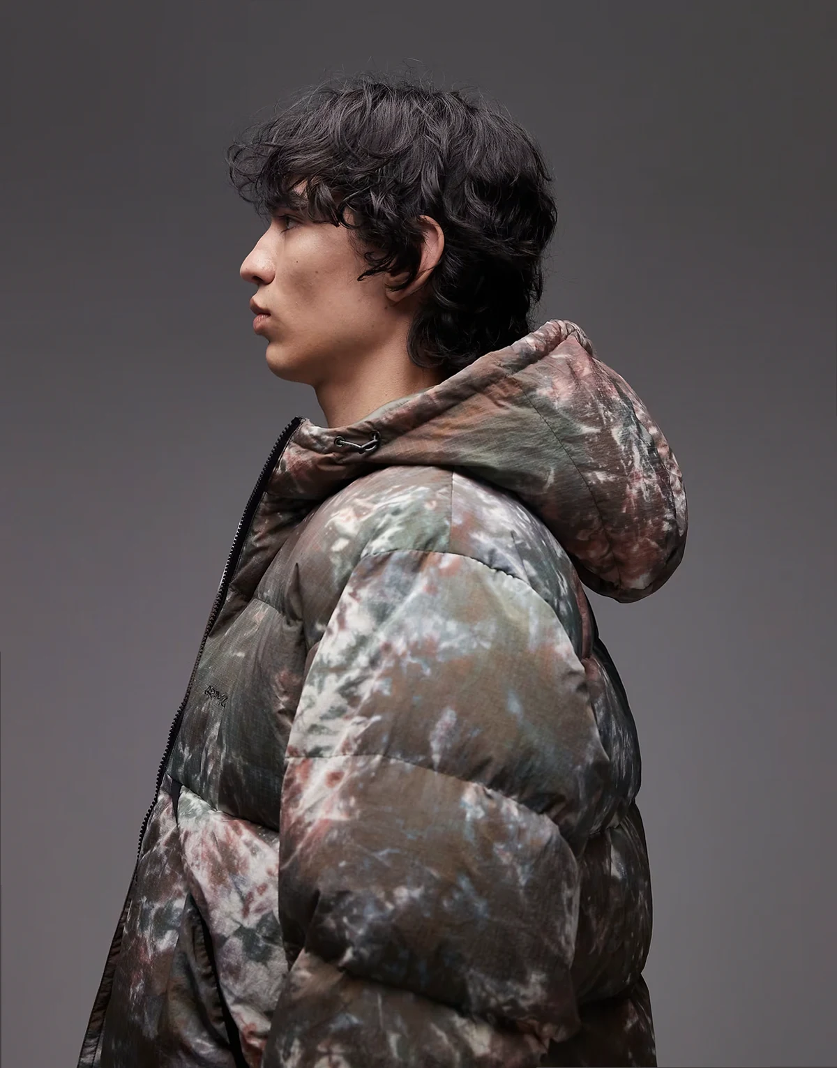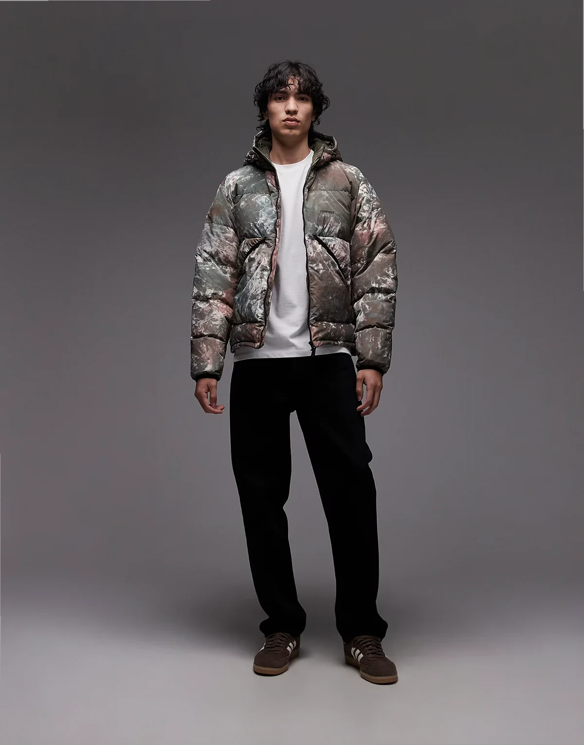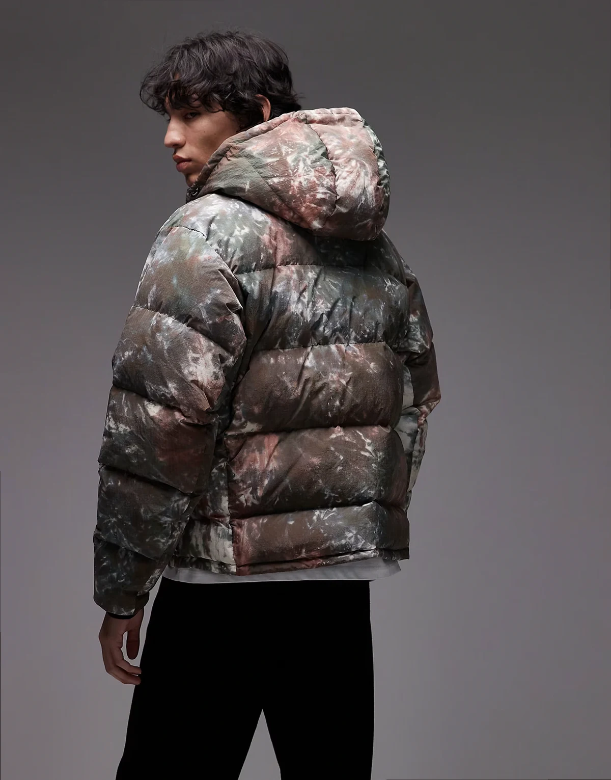 – Ocieplana kurtka w zielono-brązowy wzór tie dye
