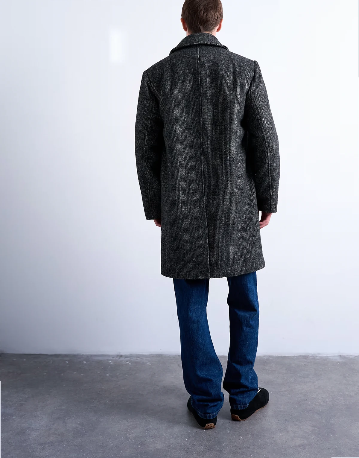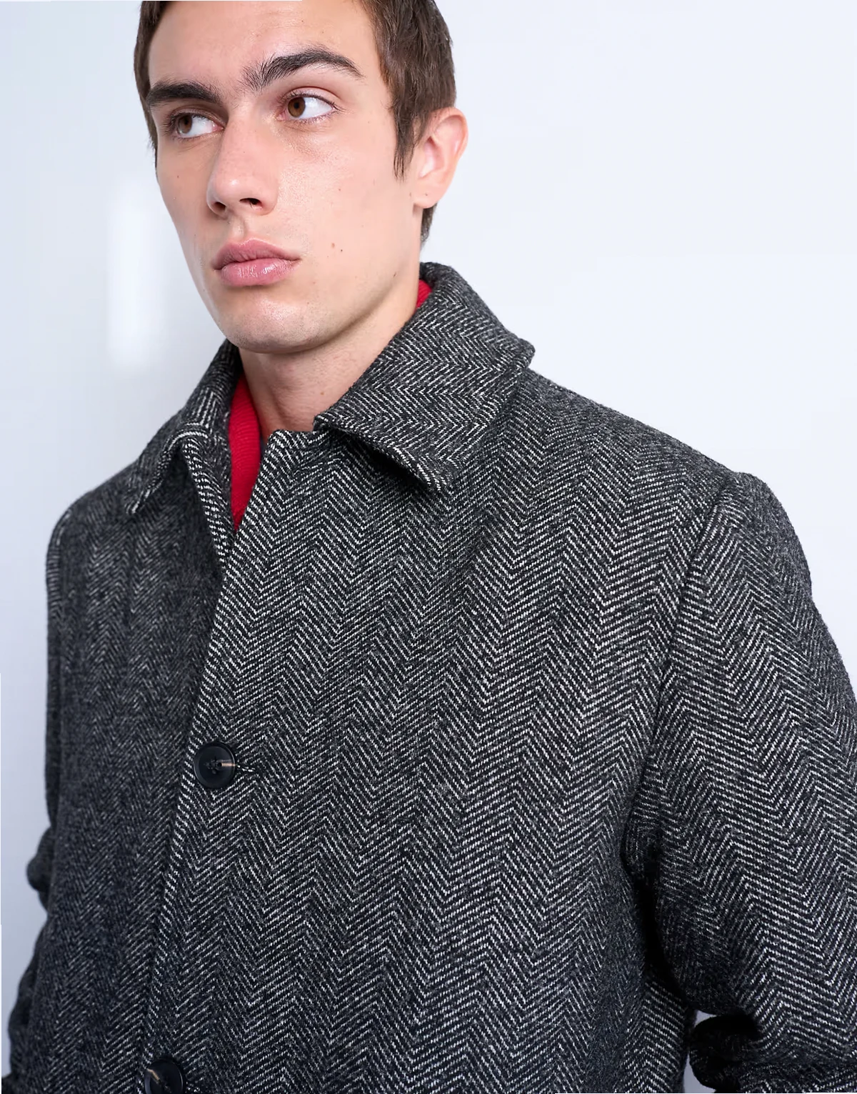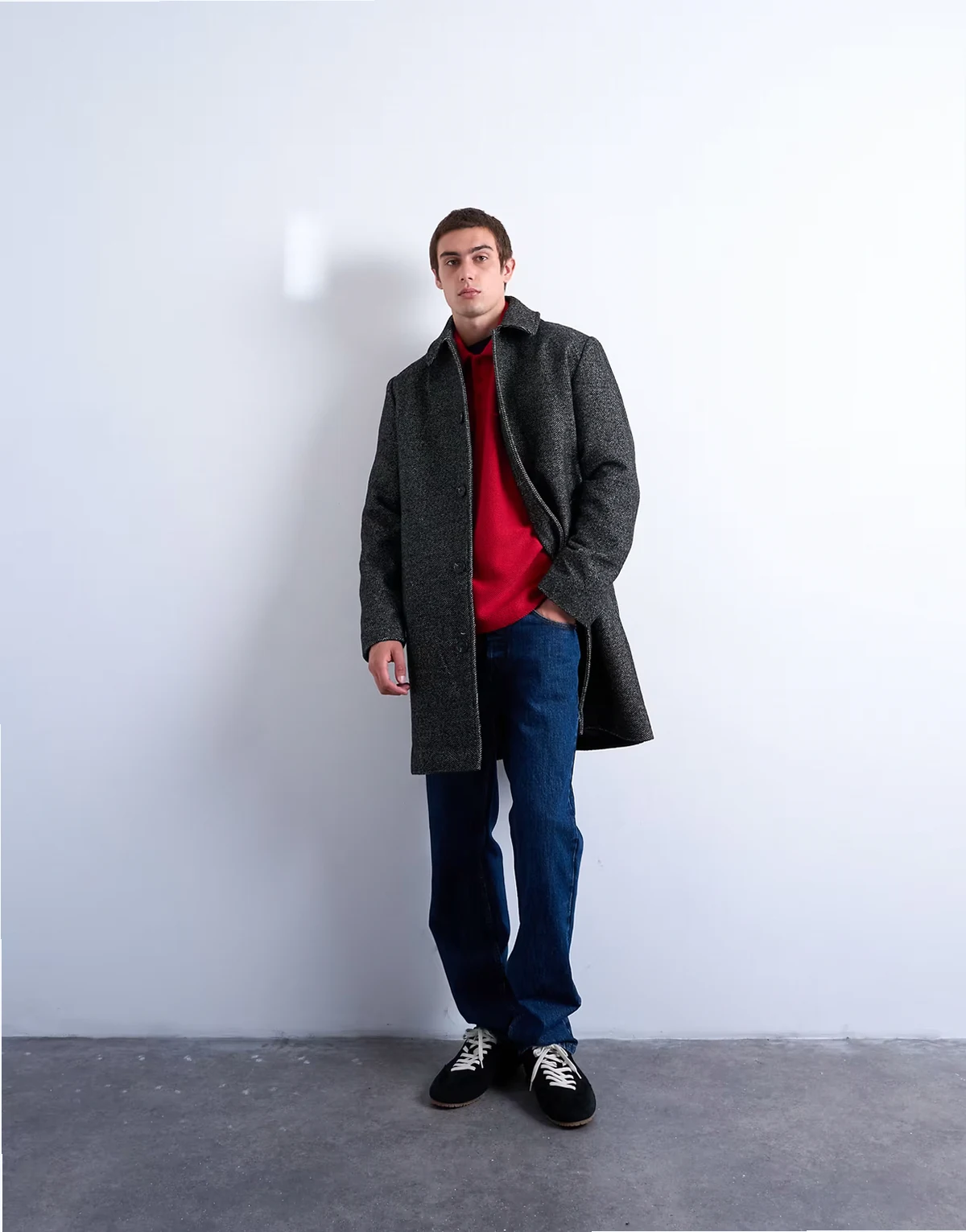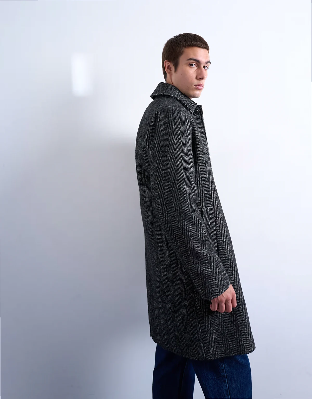 Ten płaszcz został wykonany z tkaniny w jodełkę w kształcie litery V. Ma kołnierzyk włoski, plisę na guziki, kieszenie po bokach i regularny krój.