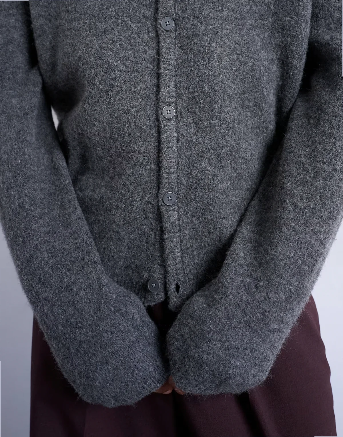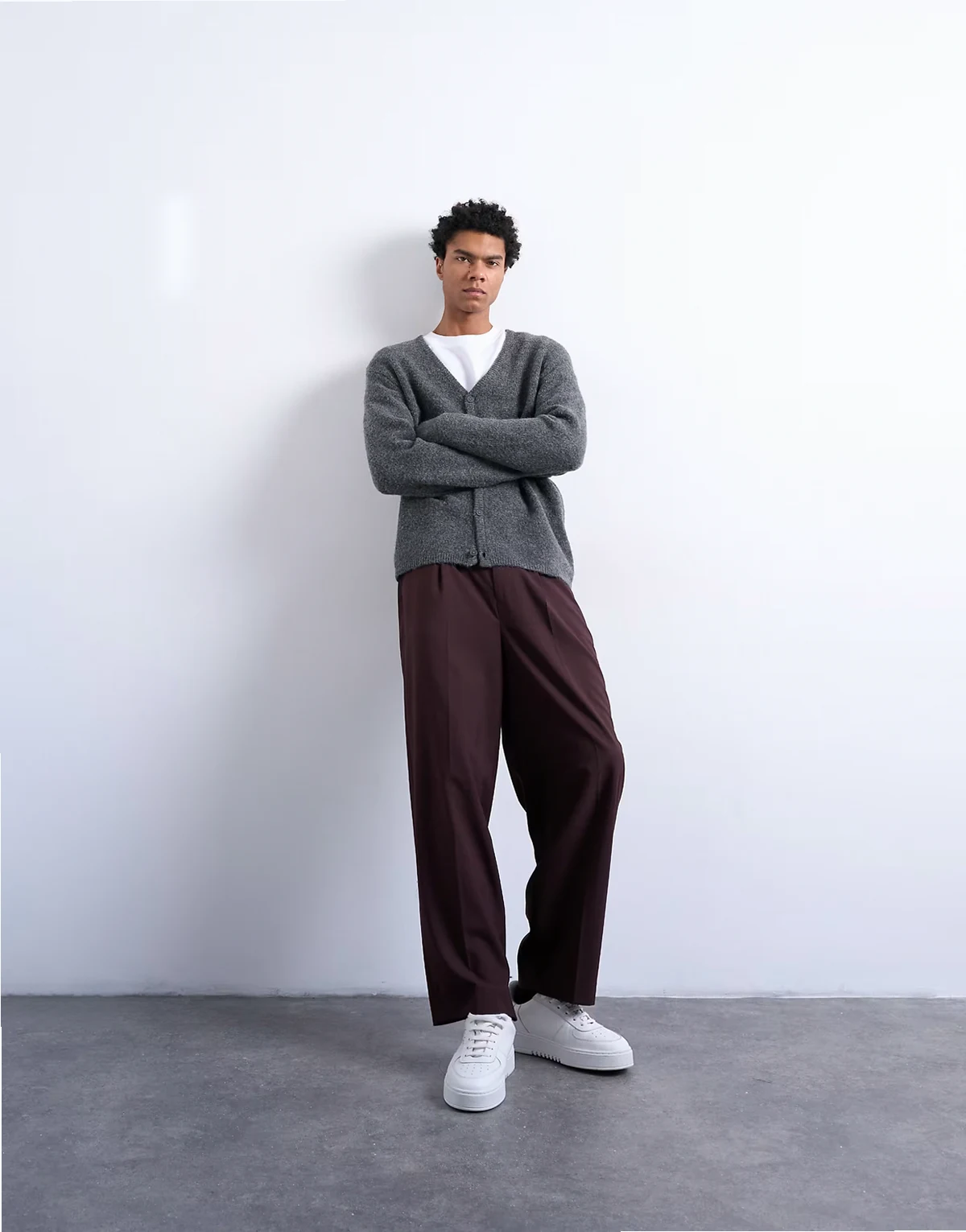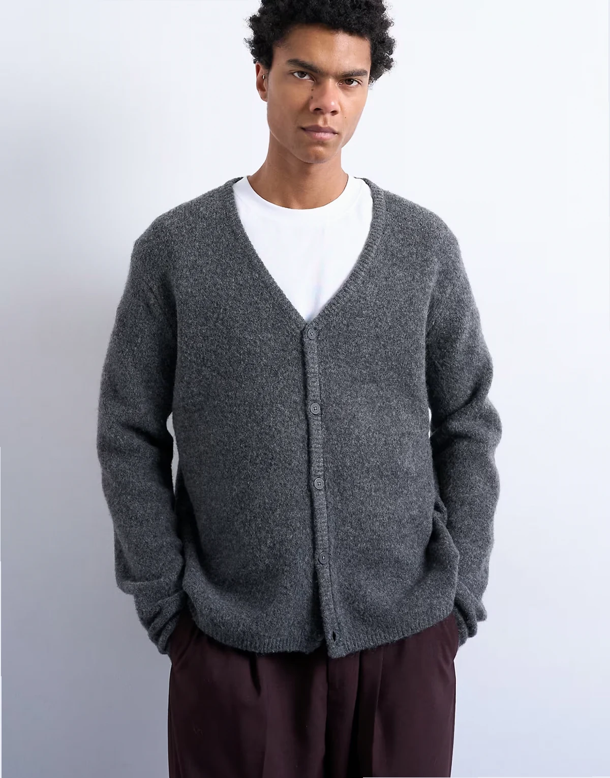 Ten uniwersalny gładki kardigan został uszyty z dzianiny o średniej grubości. Ma dekolt w kształcie litery V, plisę na guziki, długie rękawy i regularny krój.