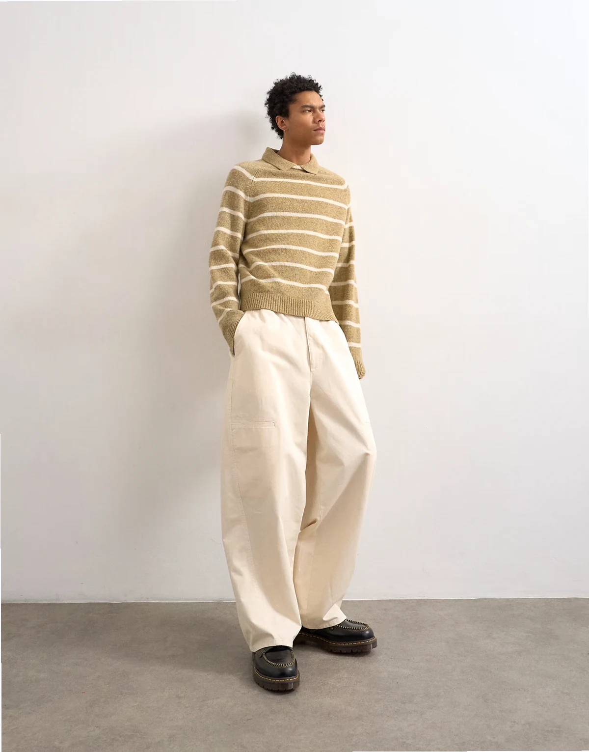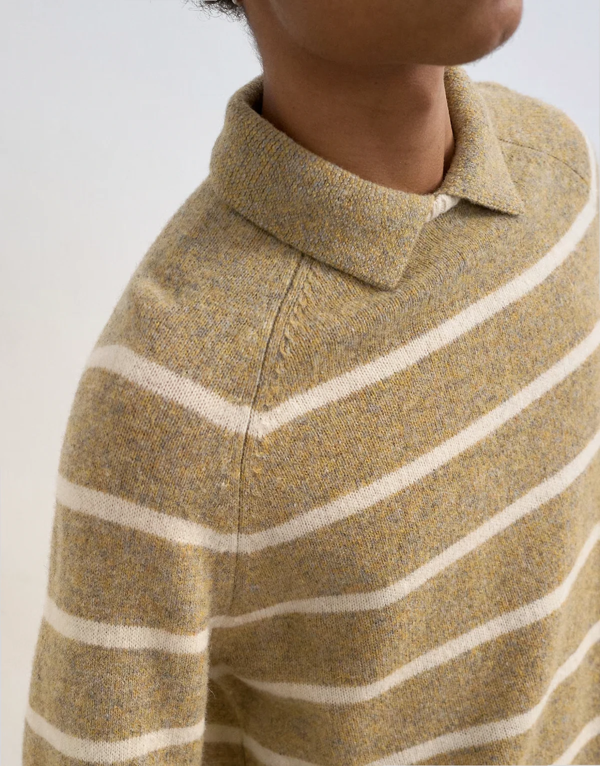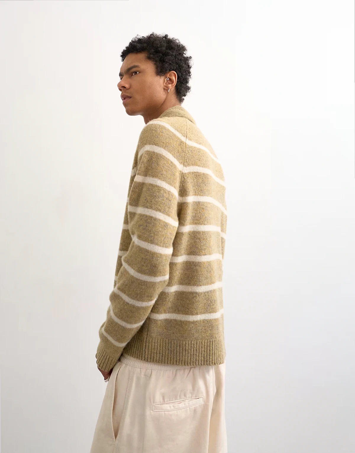 Ten sweter został wykonany ze średniej grubości dzianiny w paski. Ma kołnierzyk polo, długie rękawy i regularny krój.