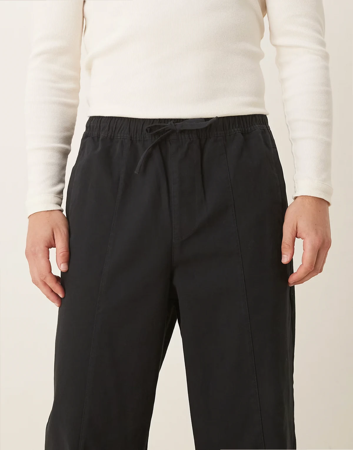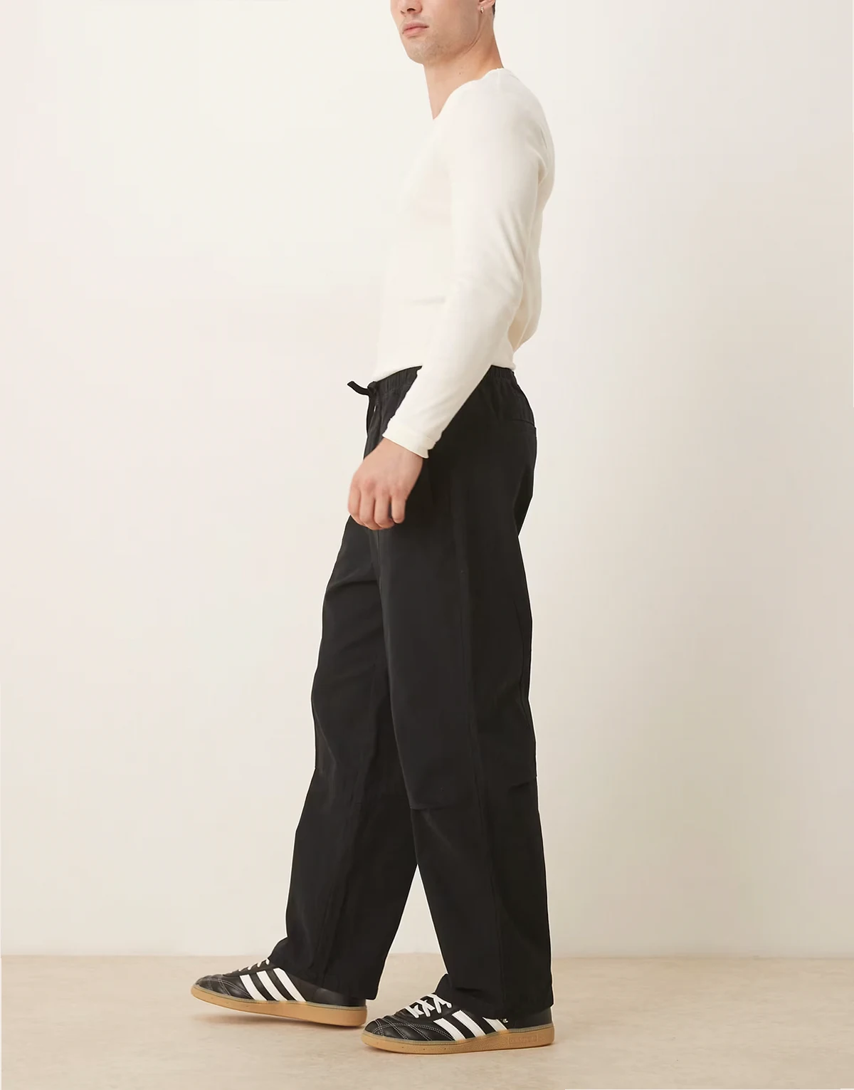 – Czarne luźne spodnie wciągane o zwężanym kroju
