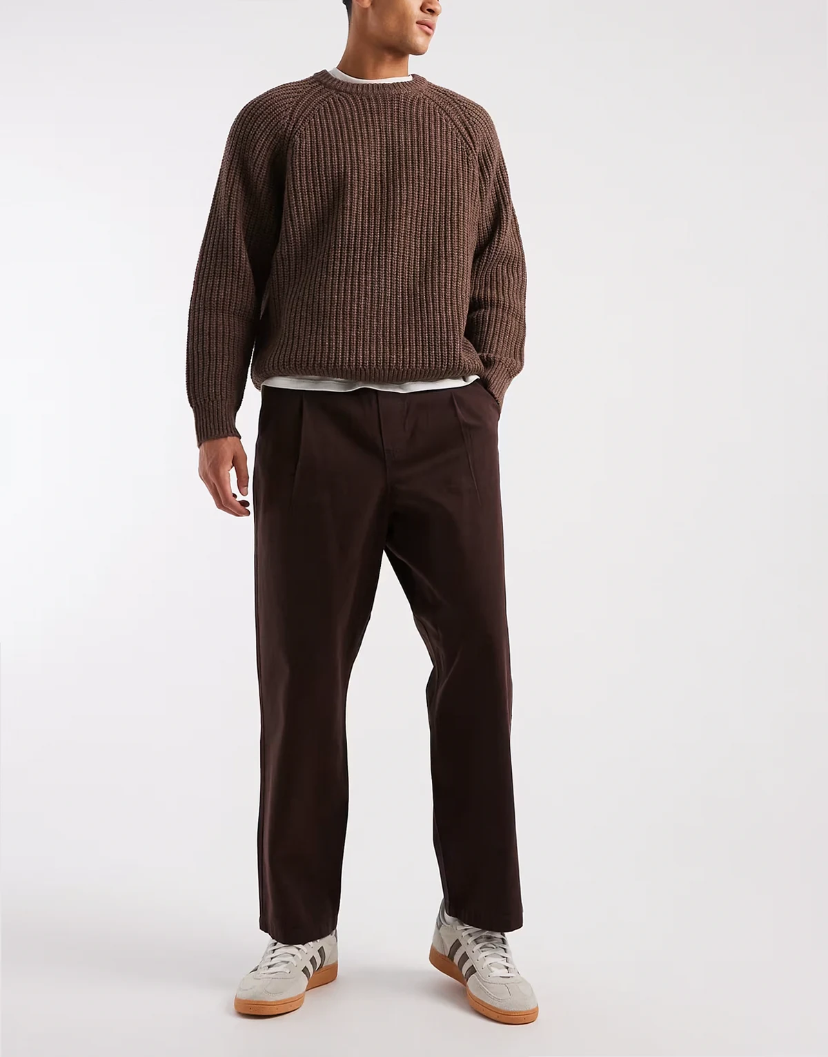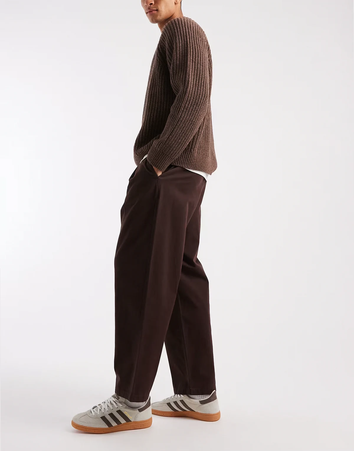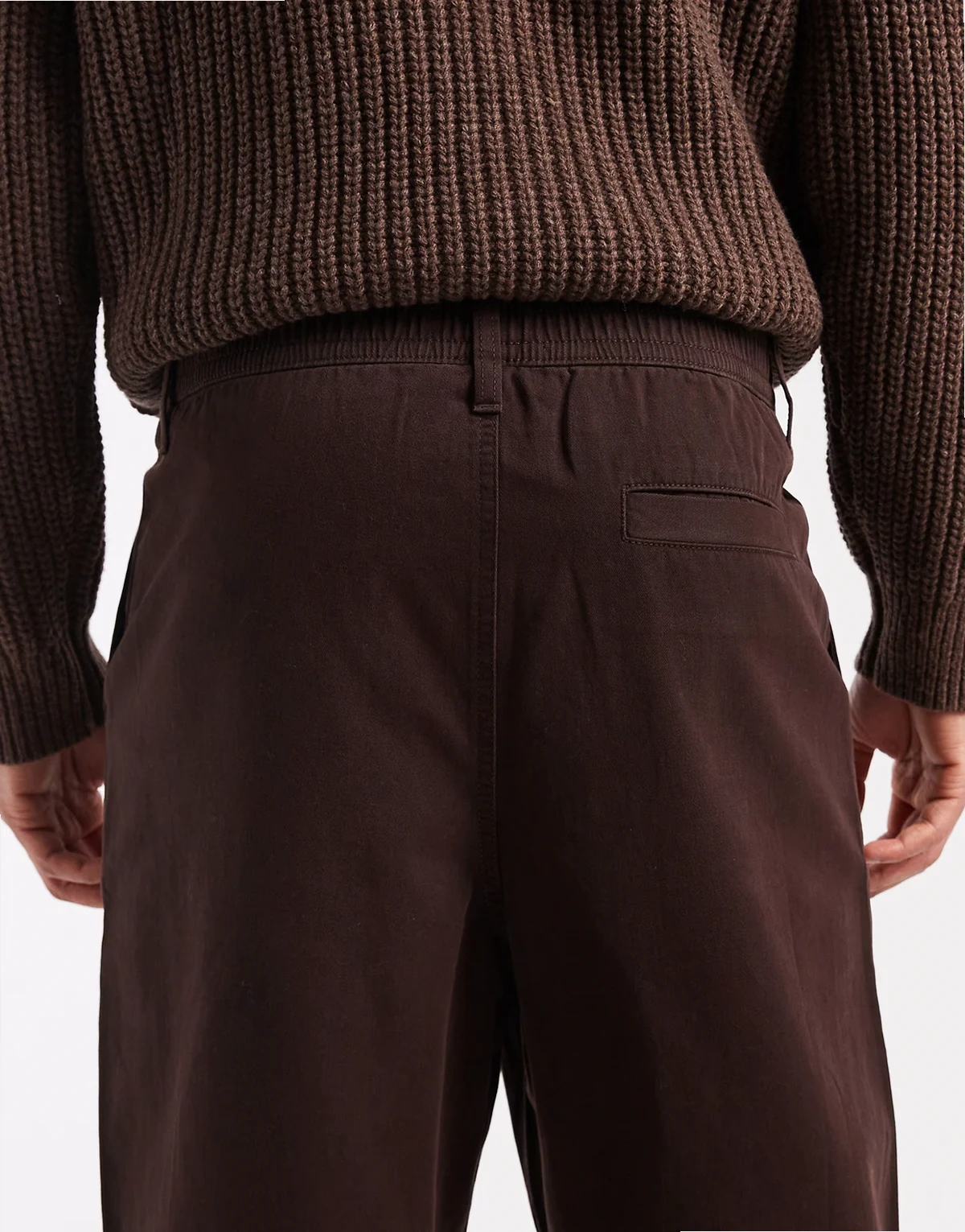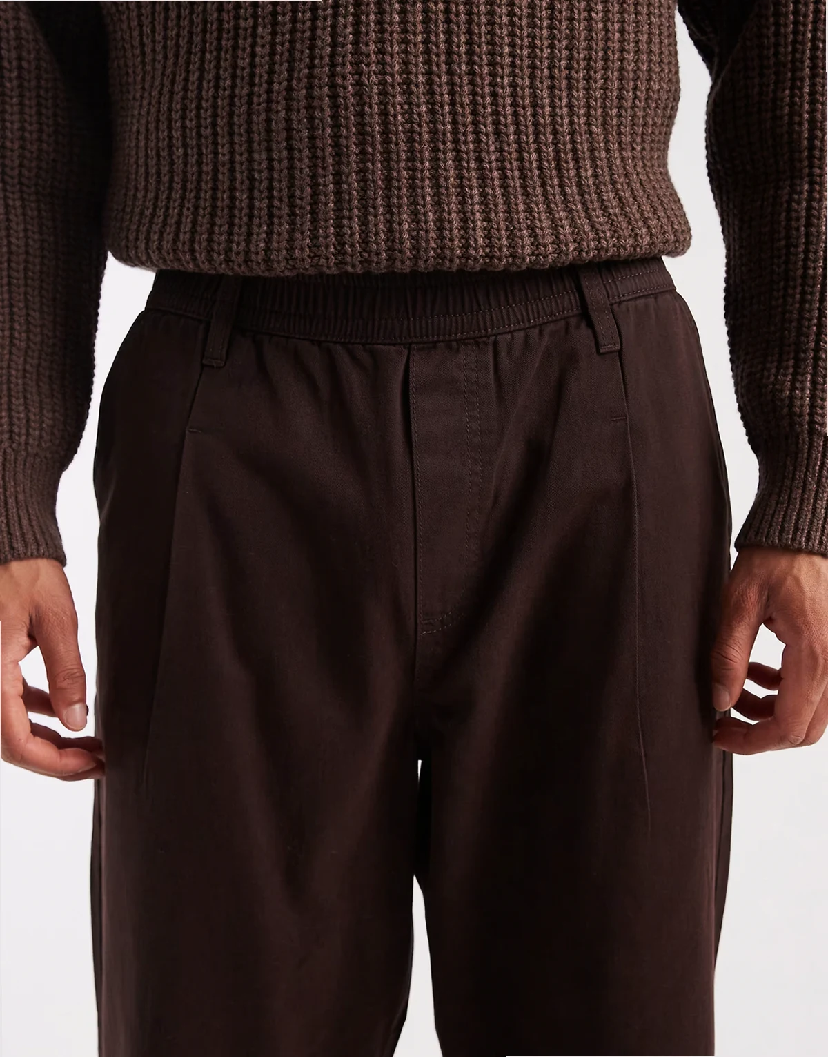 – Brązowe luźne spodnie wciągane o zwężanym kroju