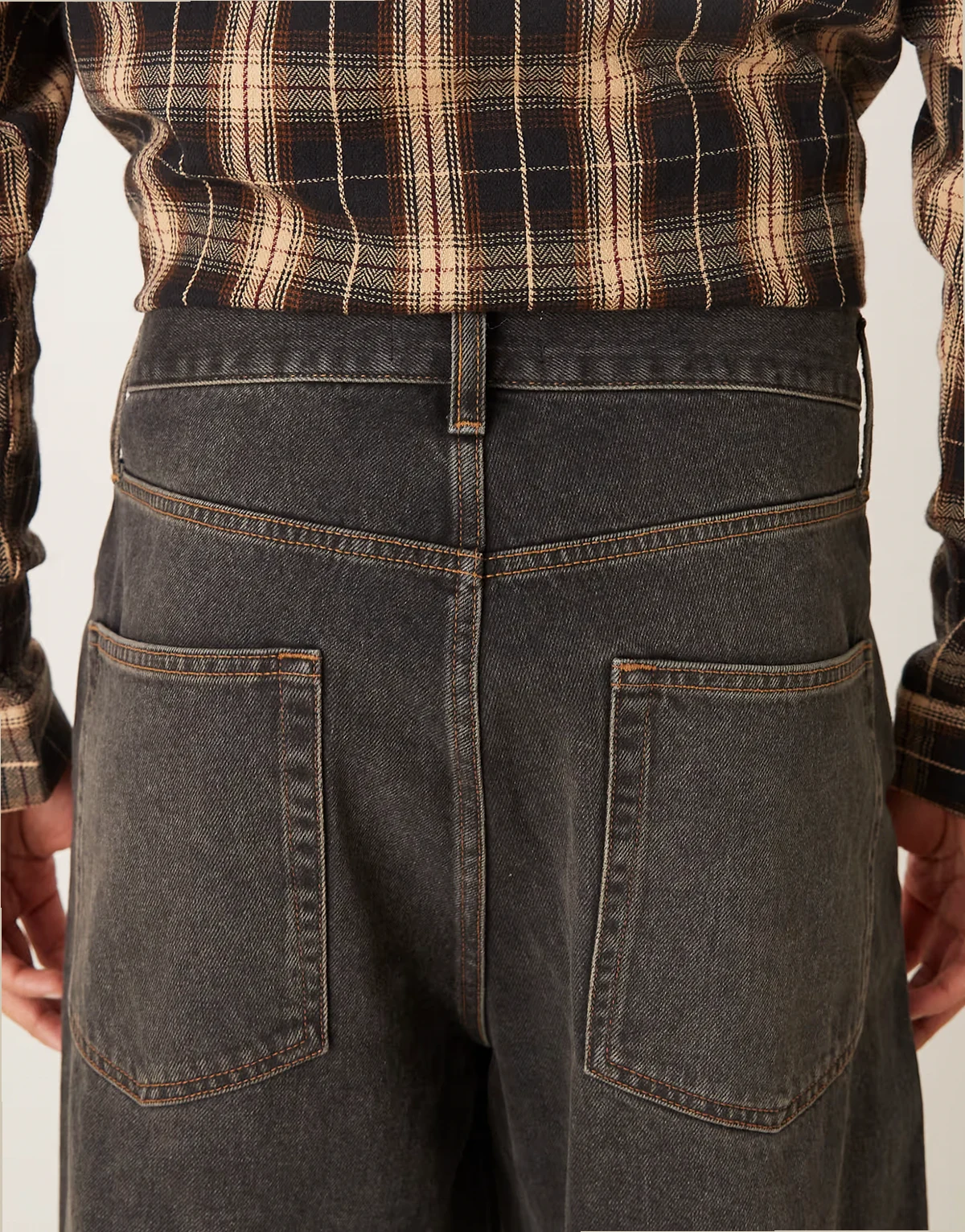 – Czarne luźne jeansy z efektem sprania