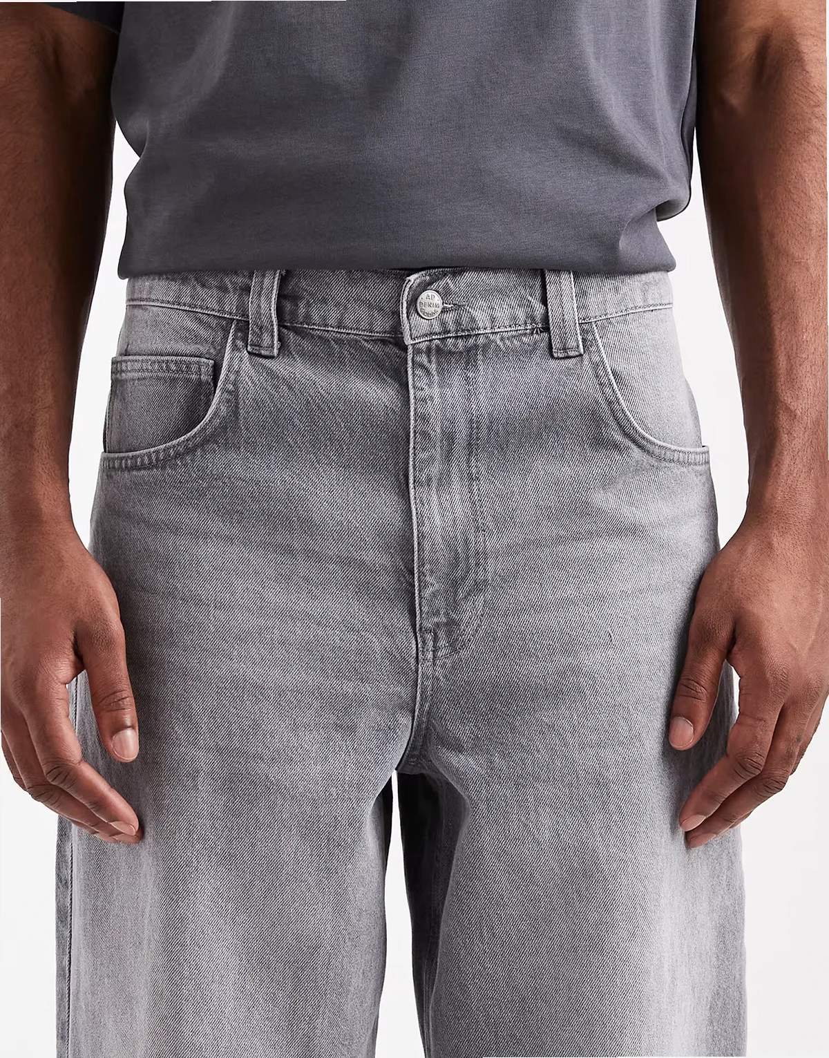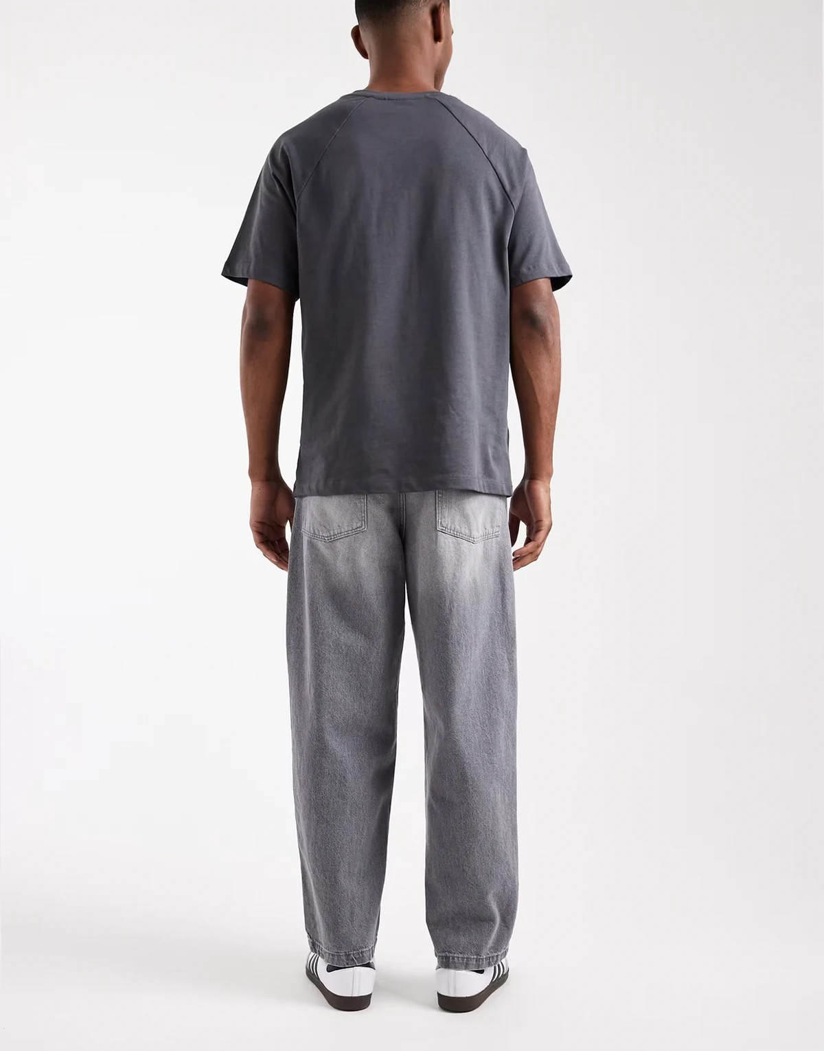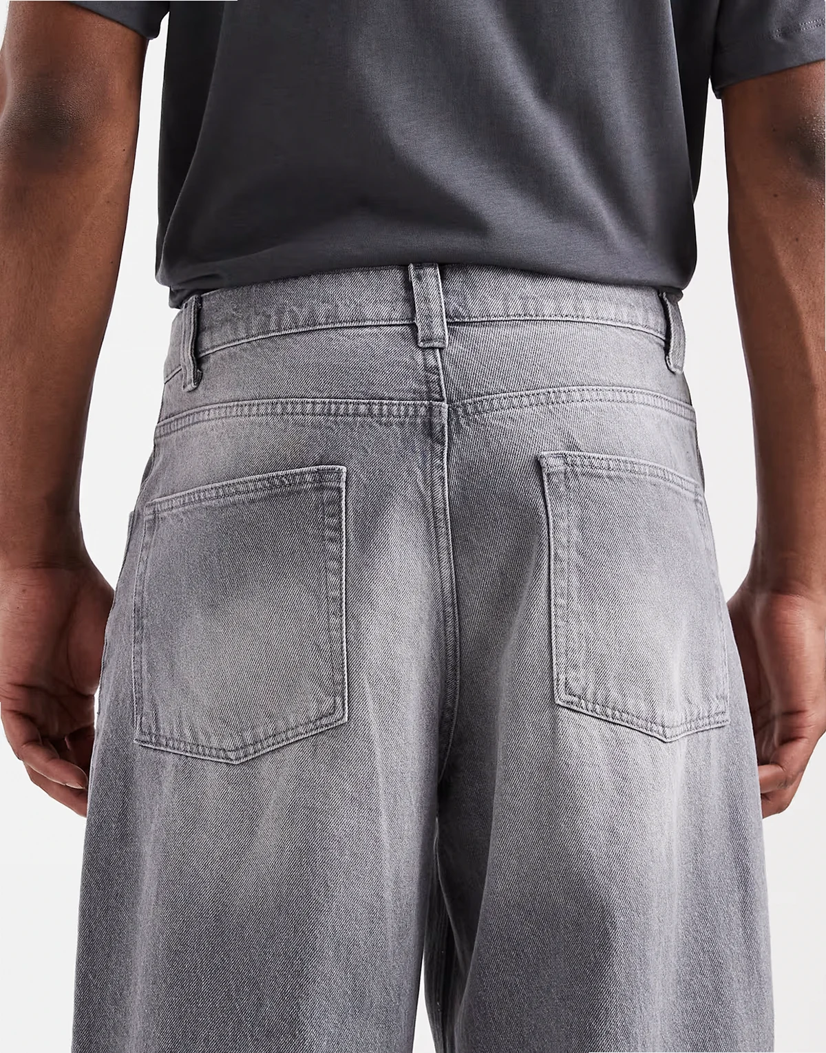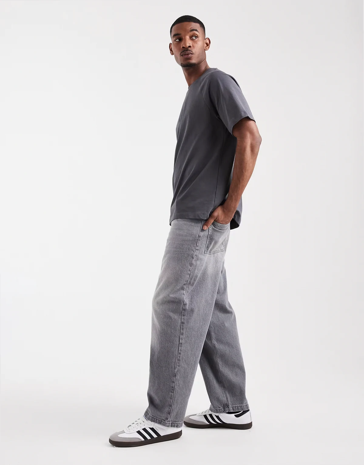 – Luźne jeansy o prostym kroju w spranym szarym kolorze, część zestawu