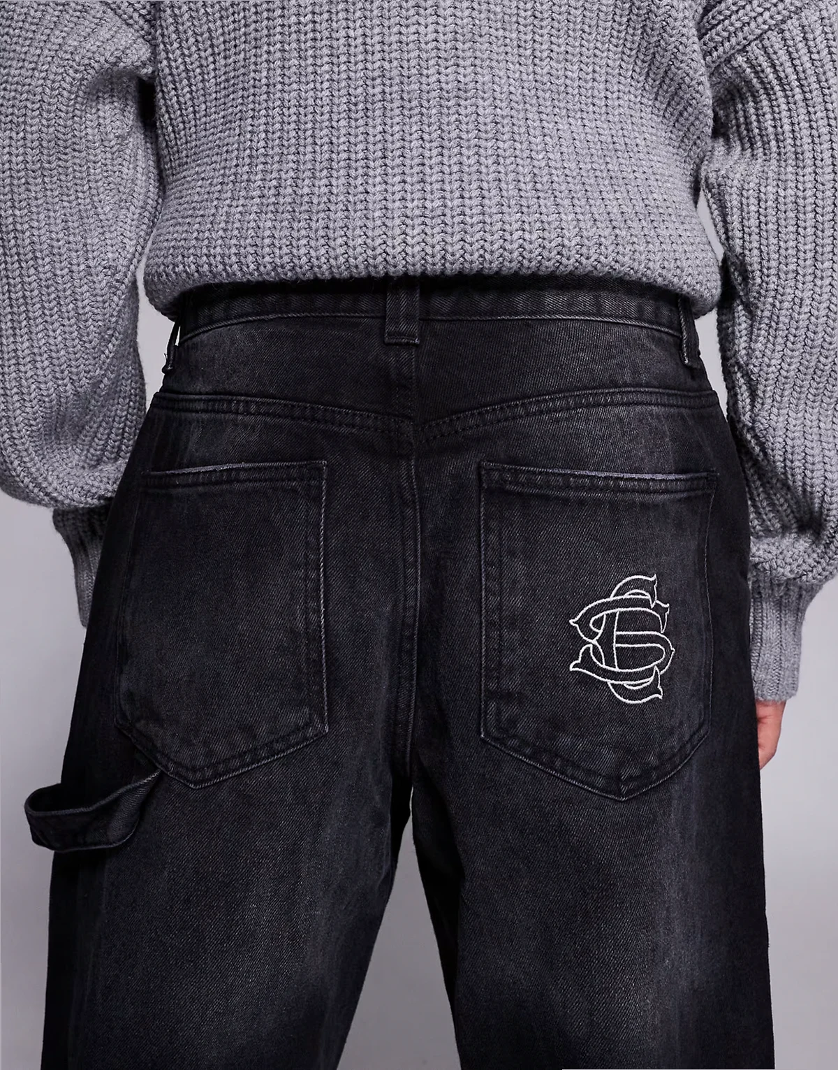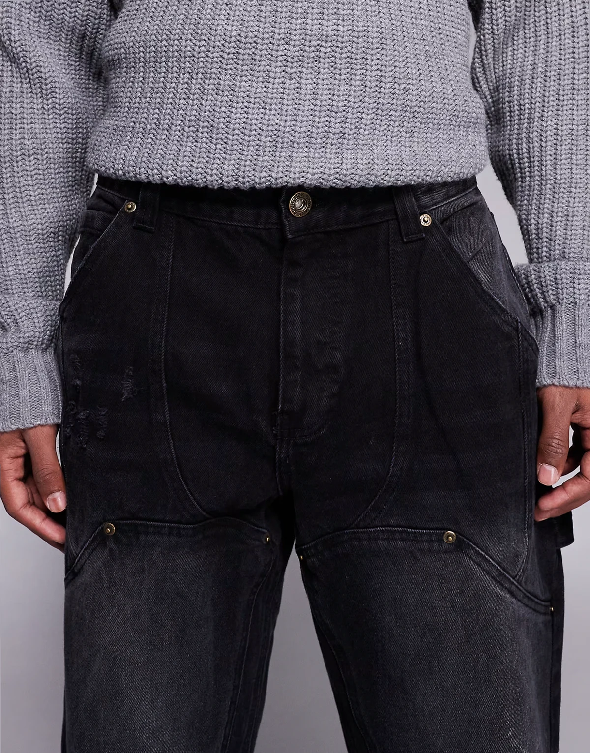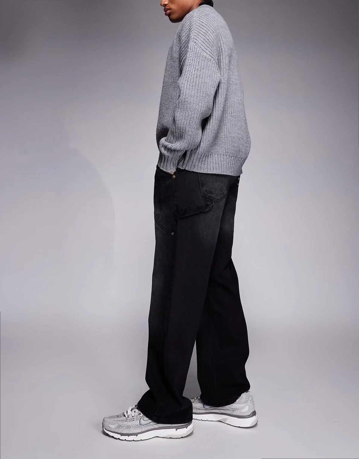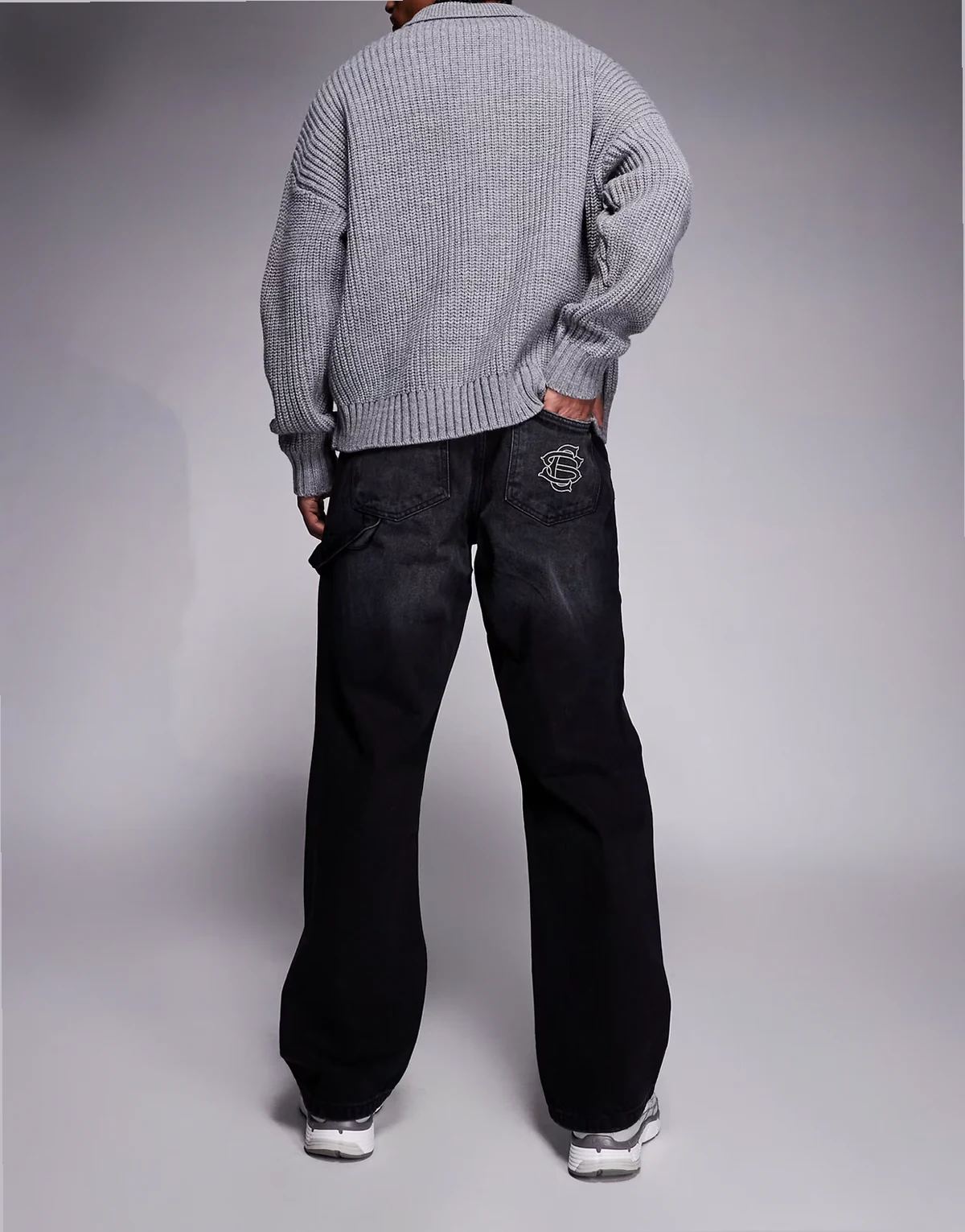 – Czarne luźne jeansy typu carpenter z efektem sprania