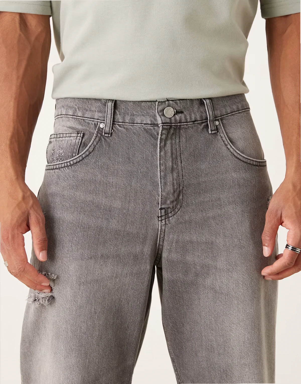 – Czarne luźne jeansy ze zwężanymi nogawkami, efektem sprania i rozdarciami