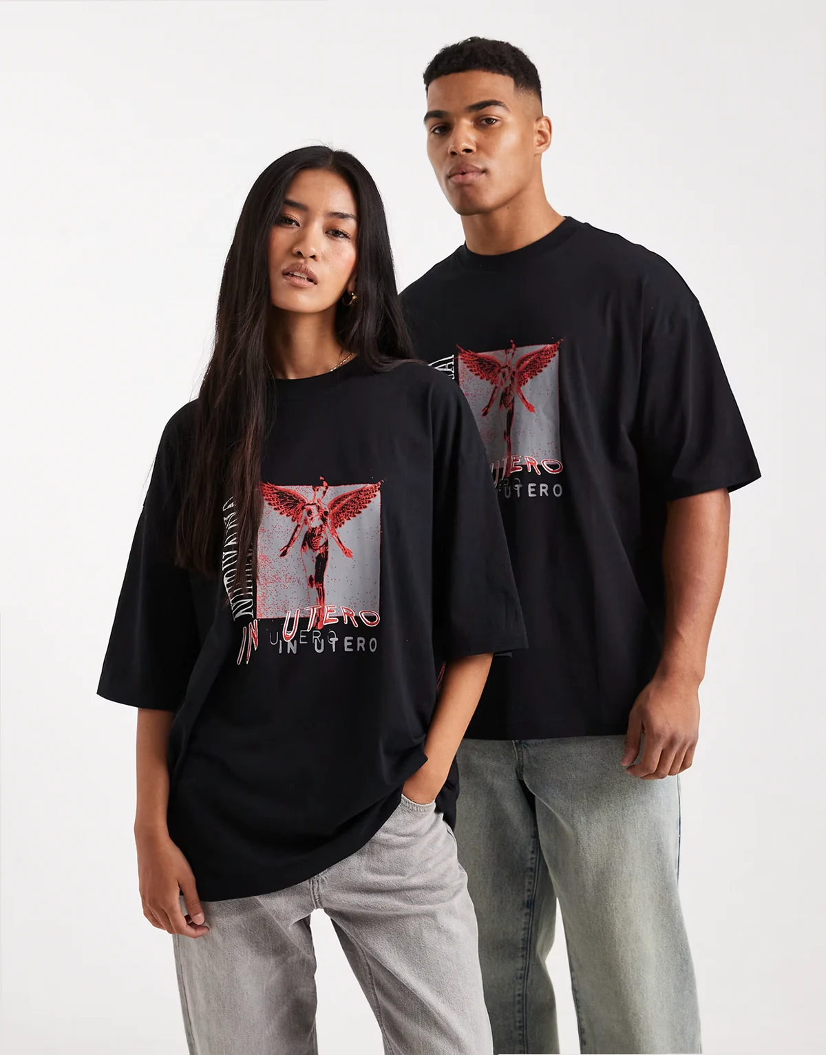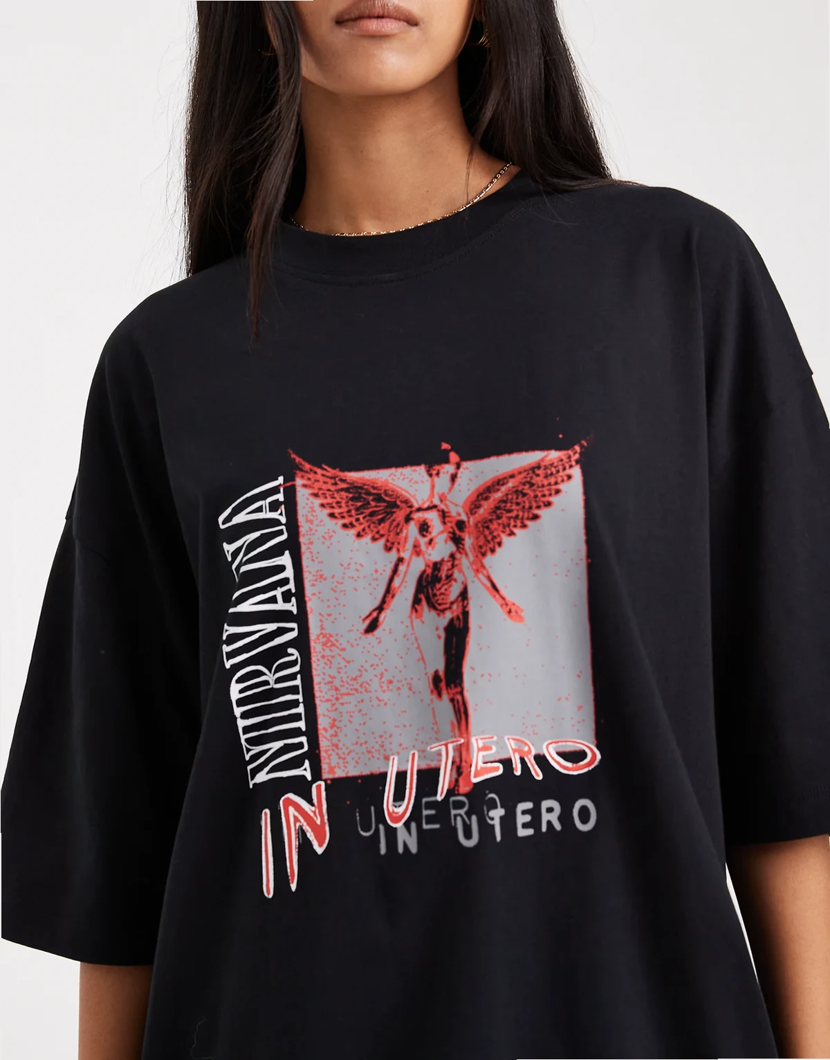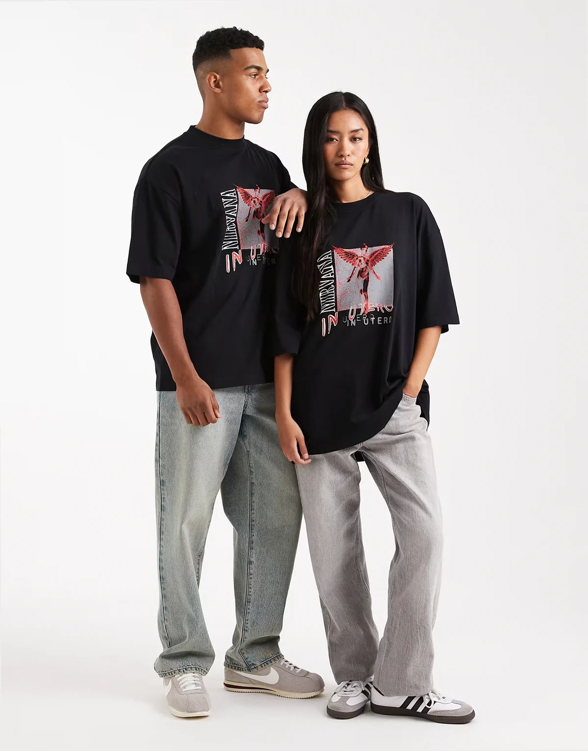 – Czarny T-shirt unisex o fasonie oversize z nadrukiem zespołu Nirvana