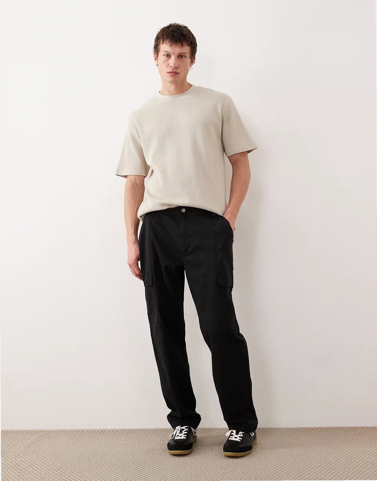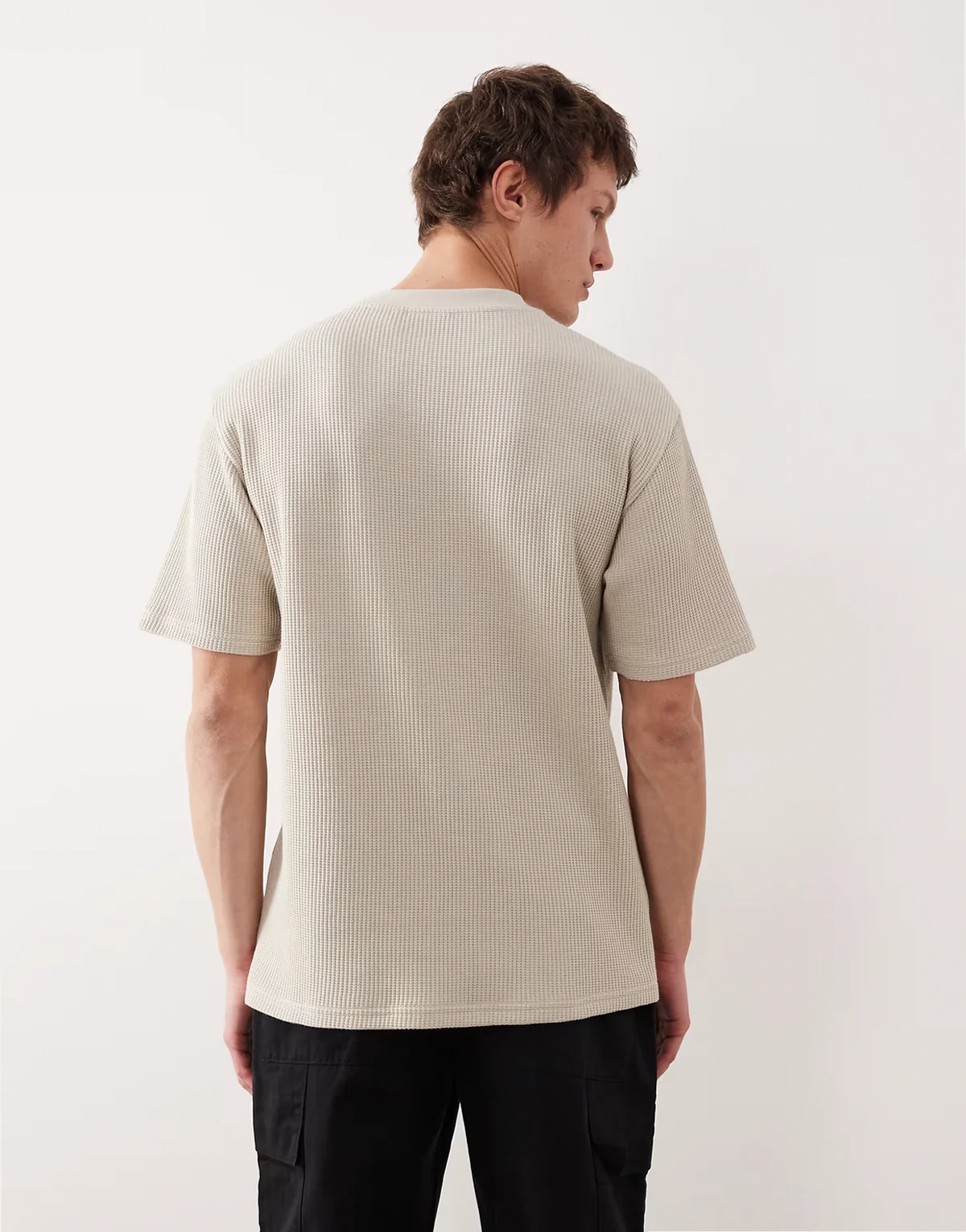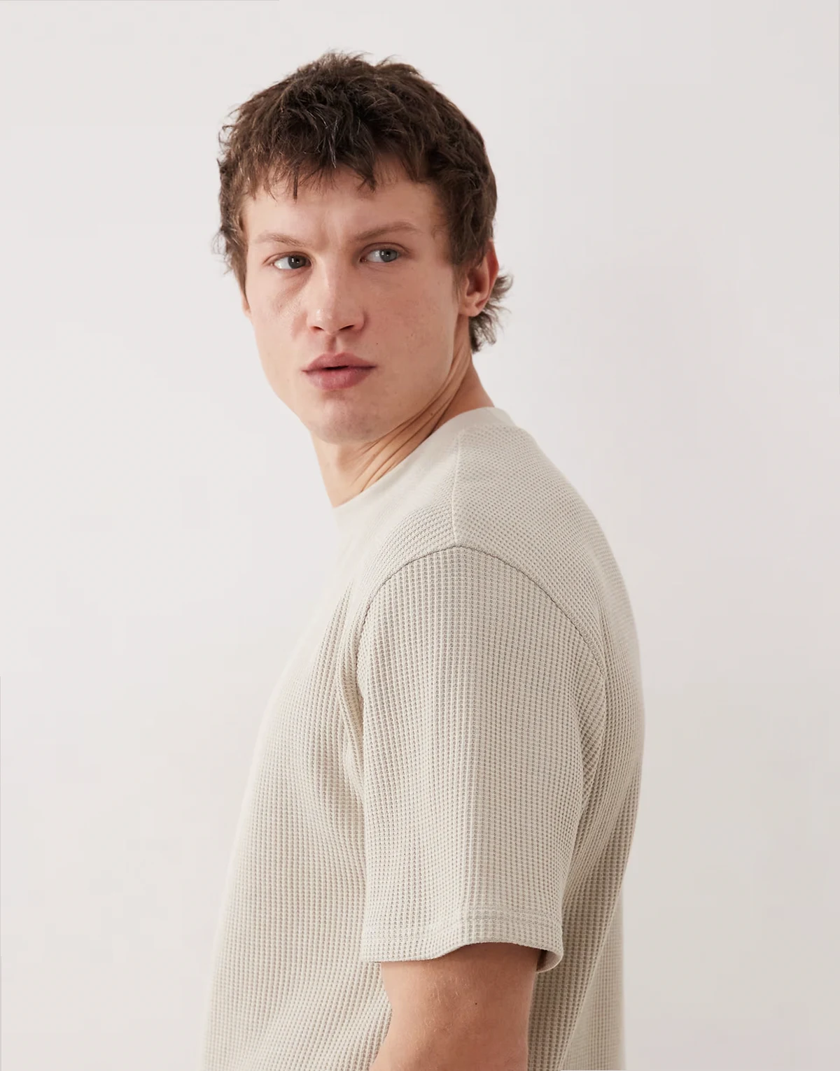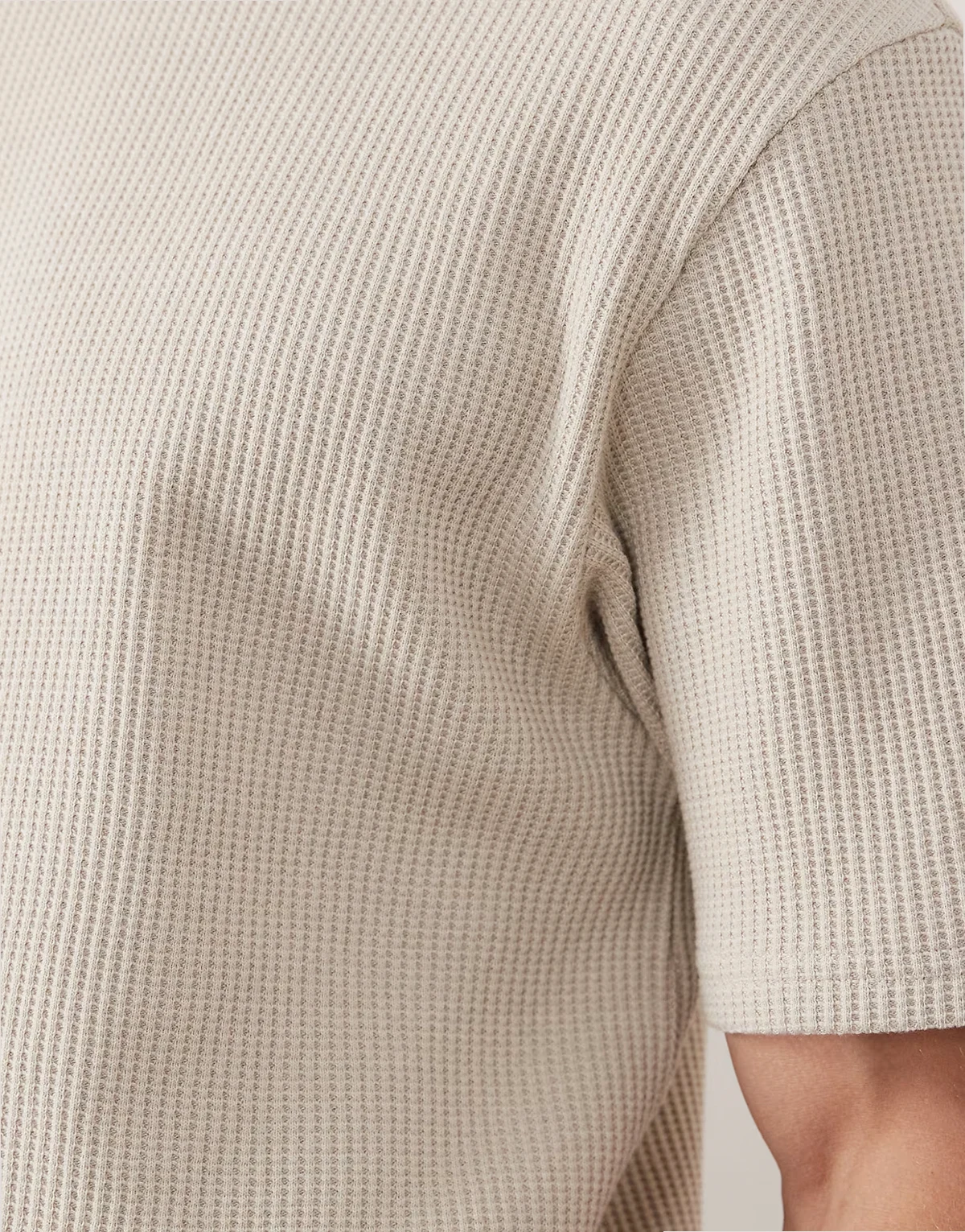 – Kremowy gruby T-shirt o luźnym kroju z materiału o waflowej teksturze