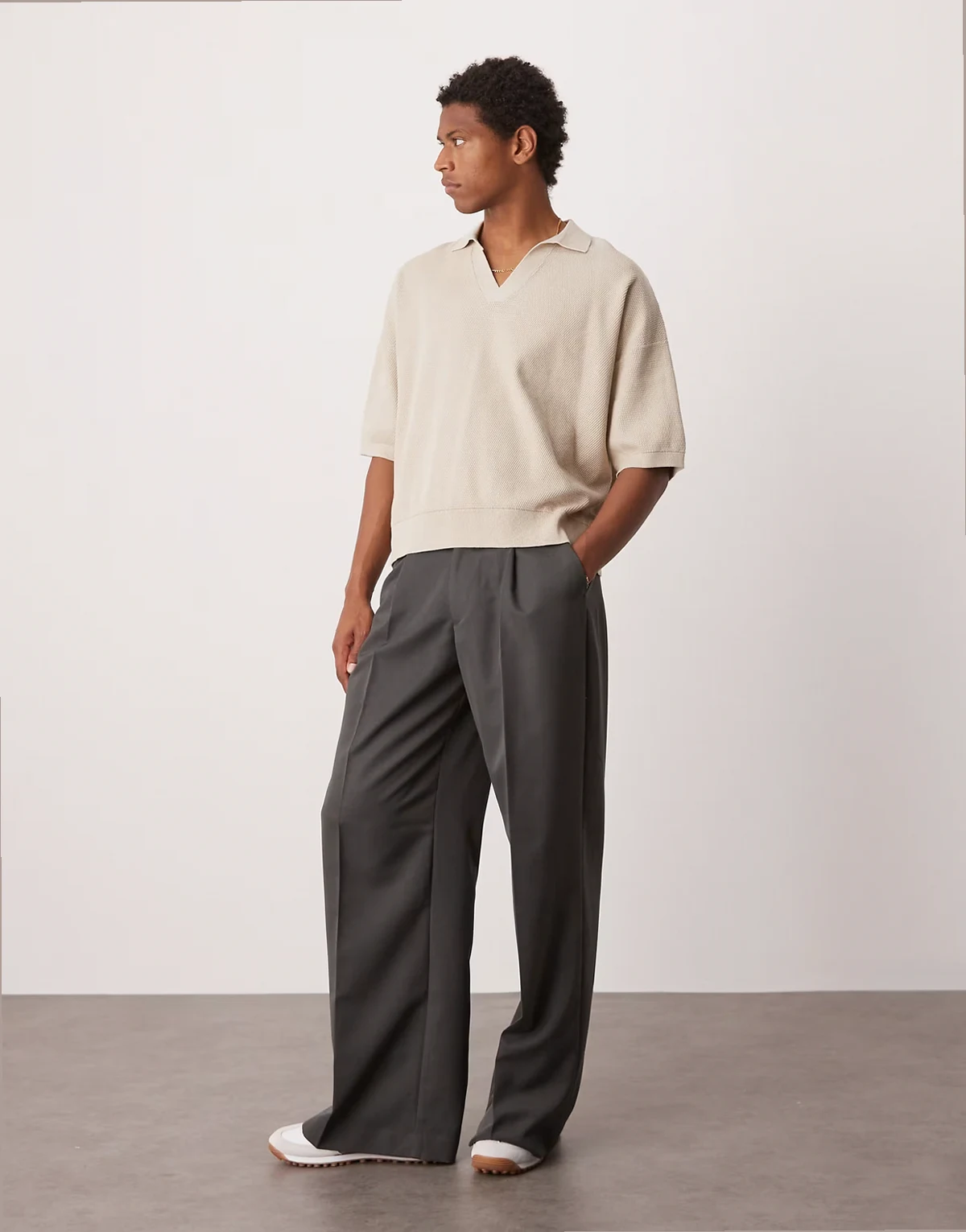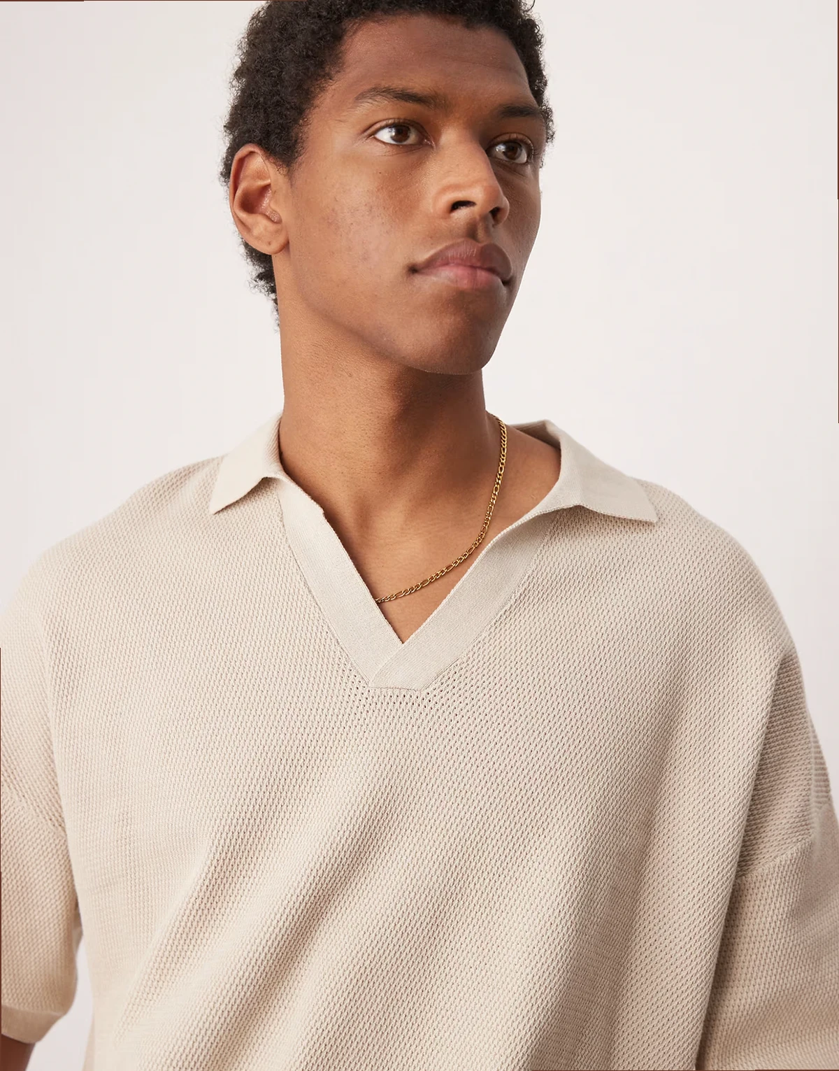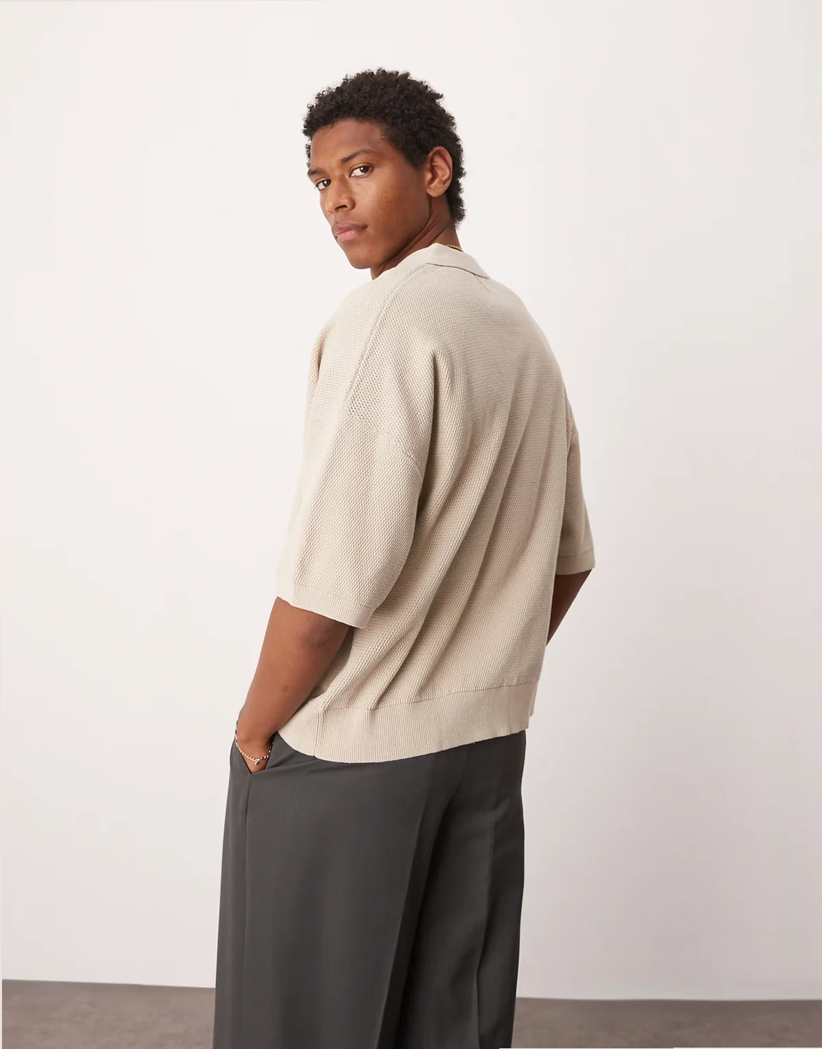 – Dzianinowa koszulka polo oversize z wycięciem w dekolcie w kolorze ecru