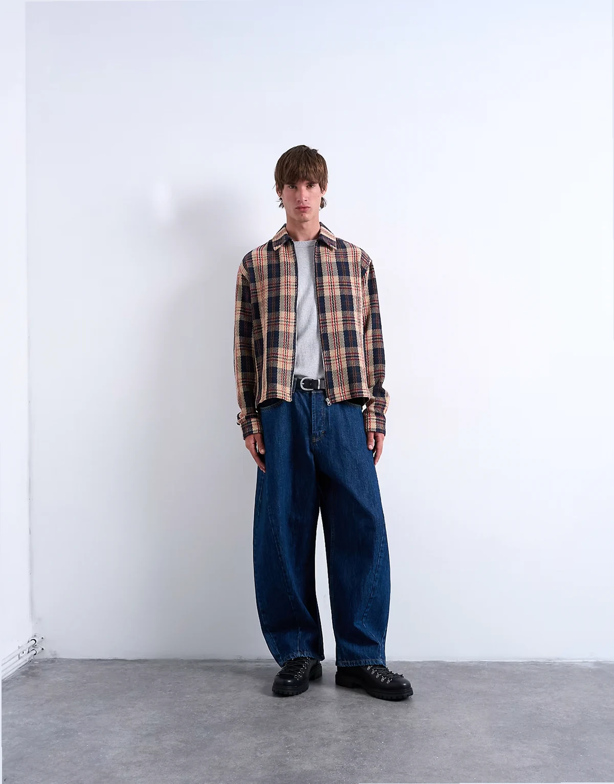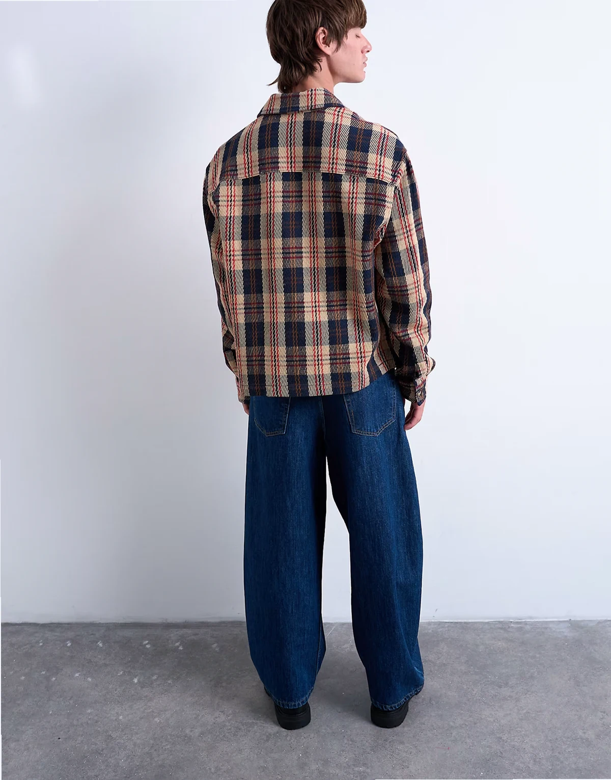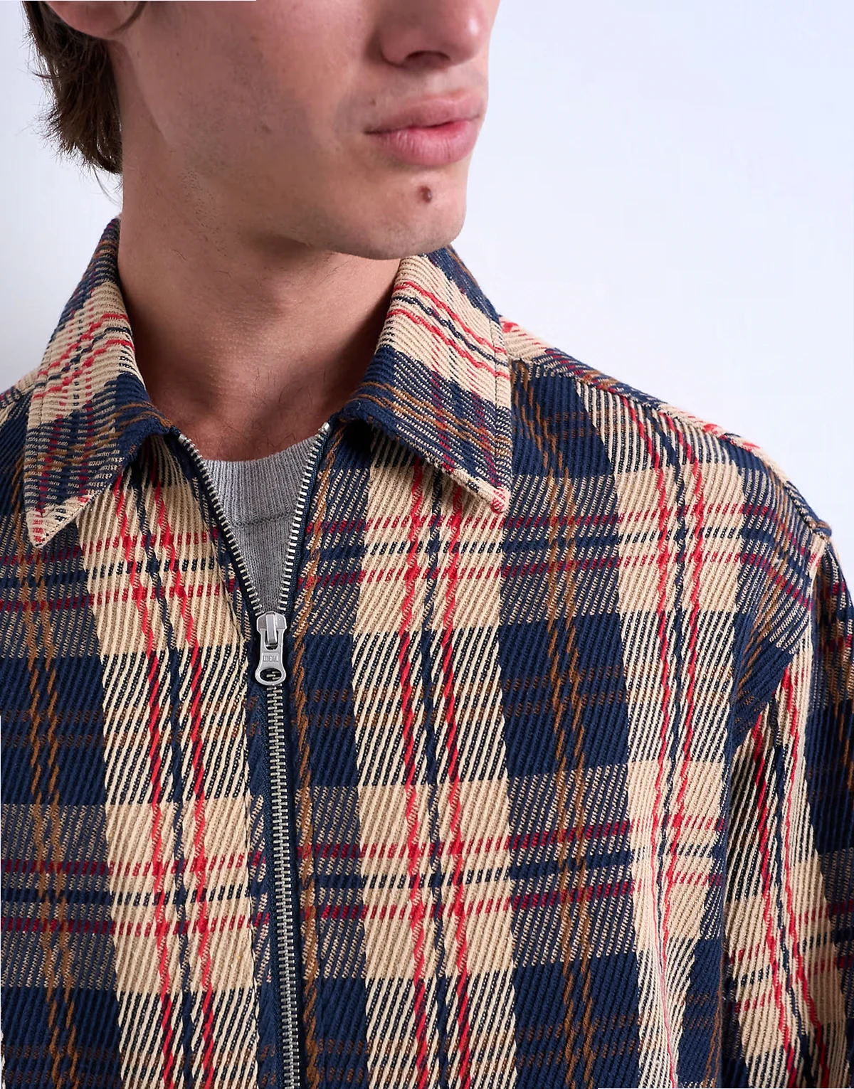 Tę koszulę wierzchnią uszyto z fakturowanej tkaniny w kratę. Ma kołnierzyk włoski, zapięcie na zamek, długie rękawy i regularny krój.