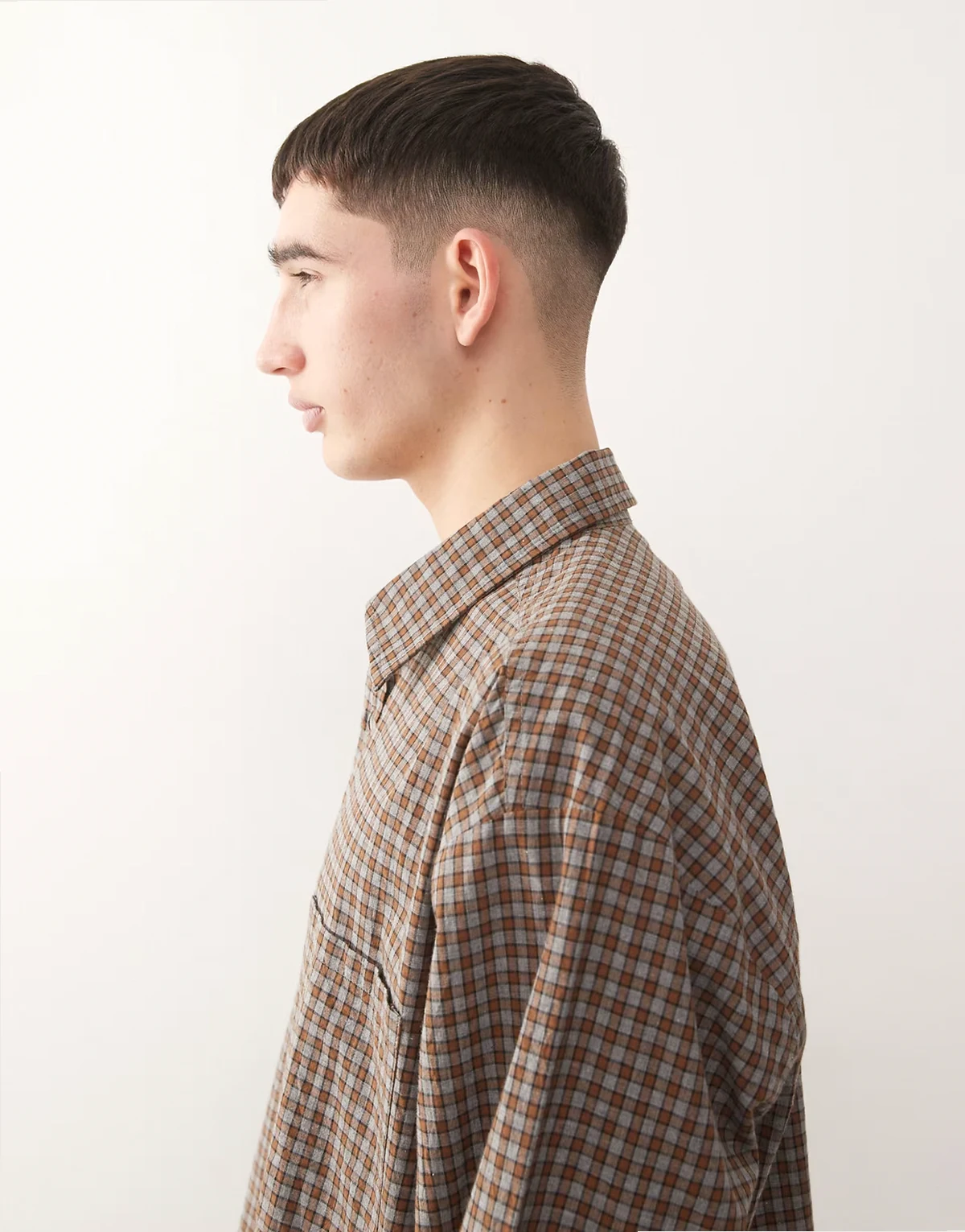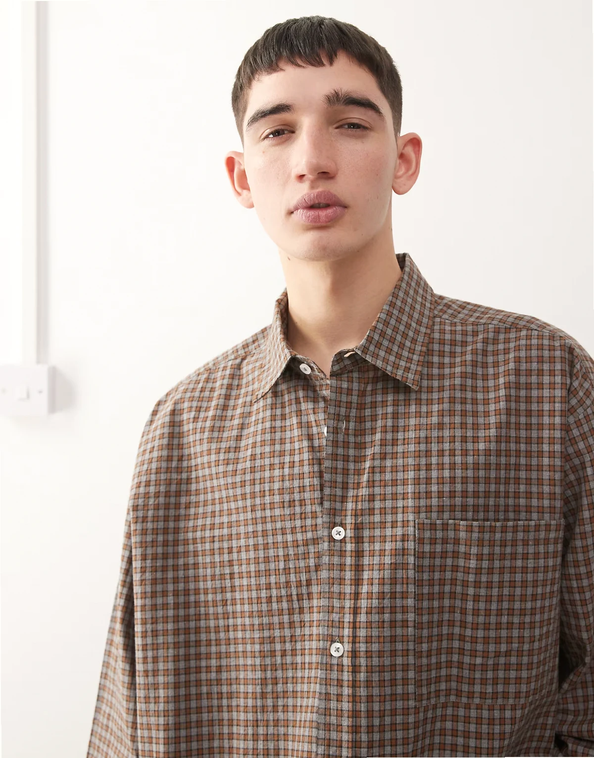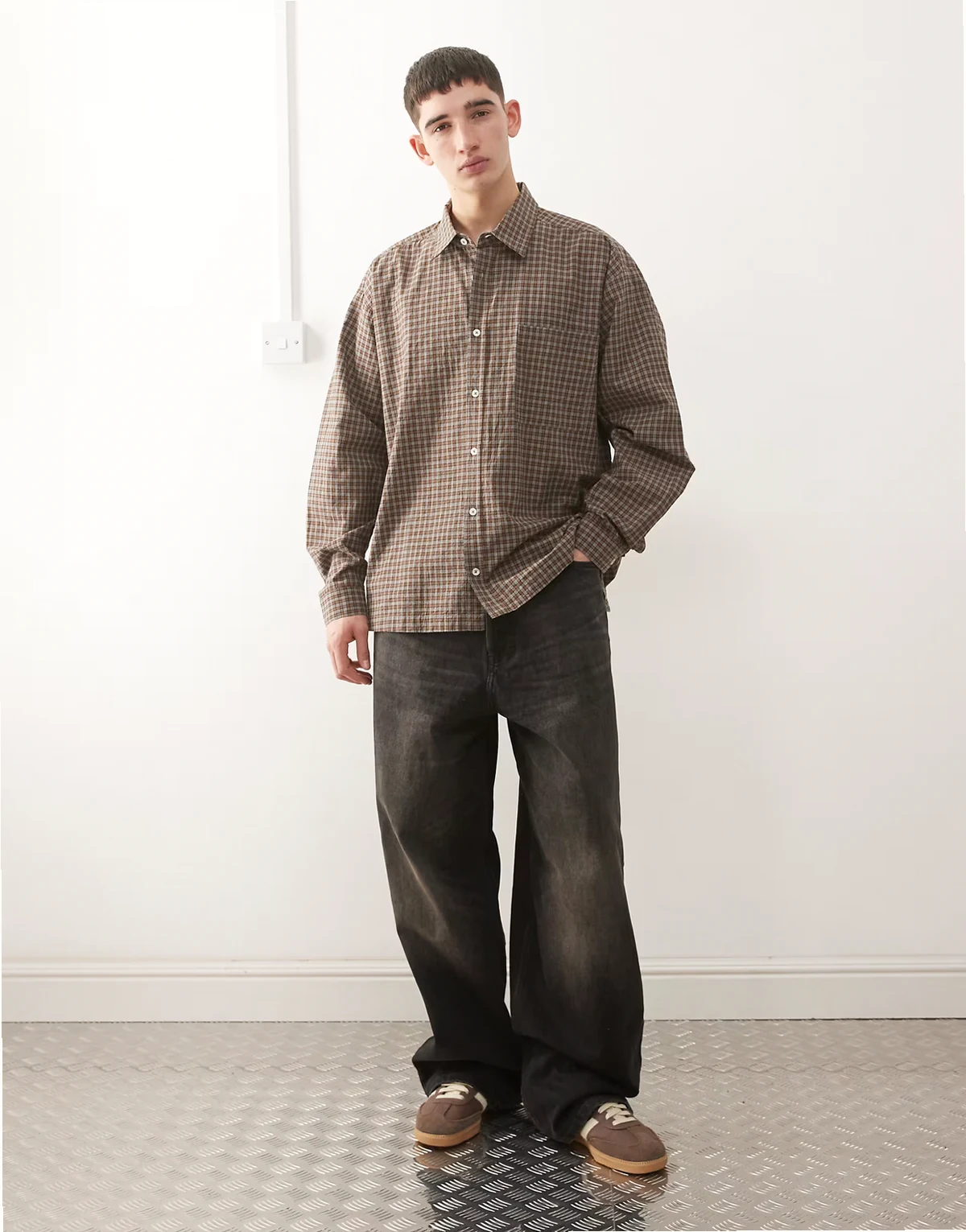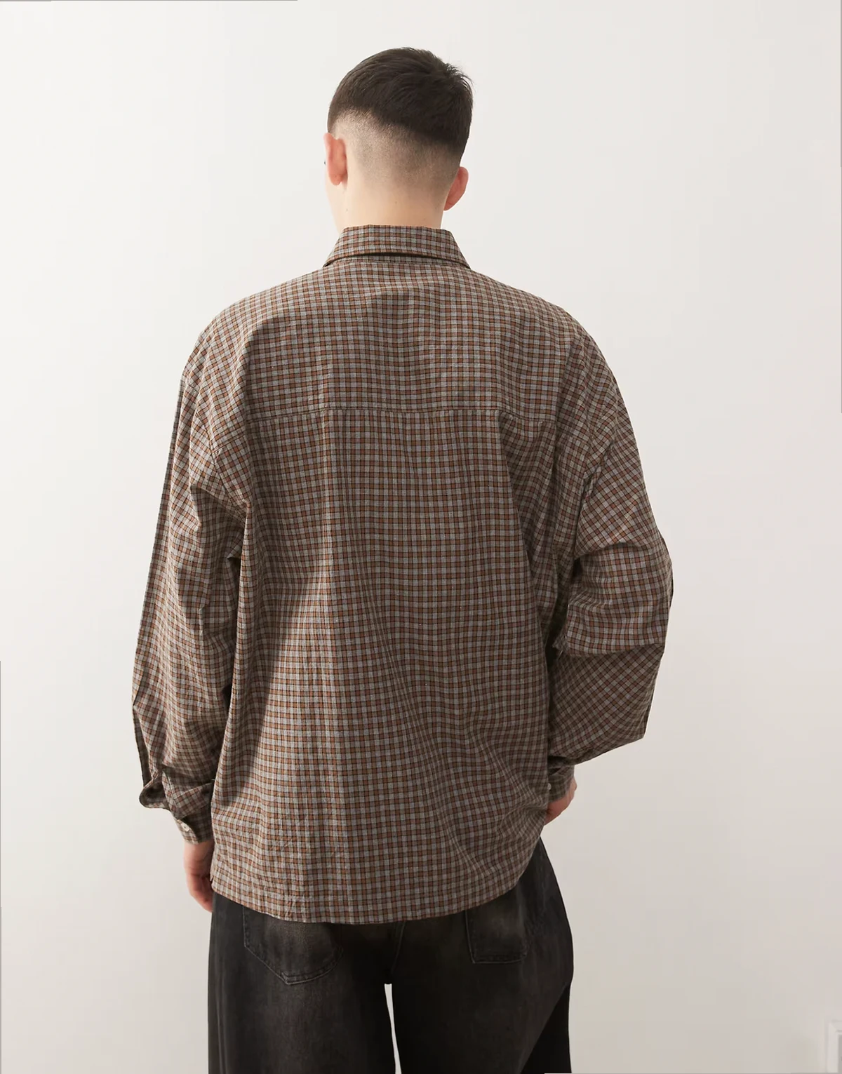 – Szara koszula oversize z długimi rękawami i wzorem w kratę