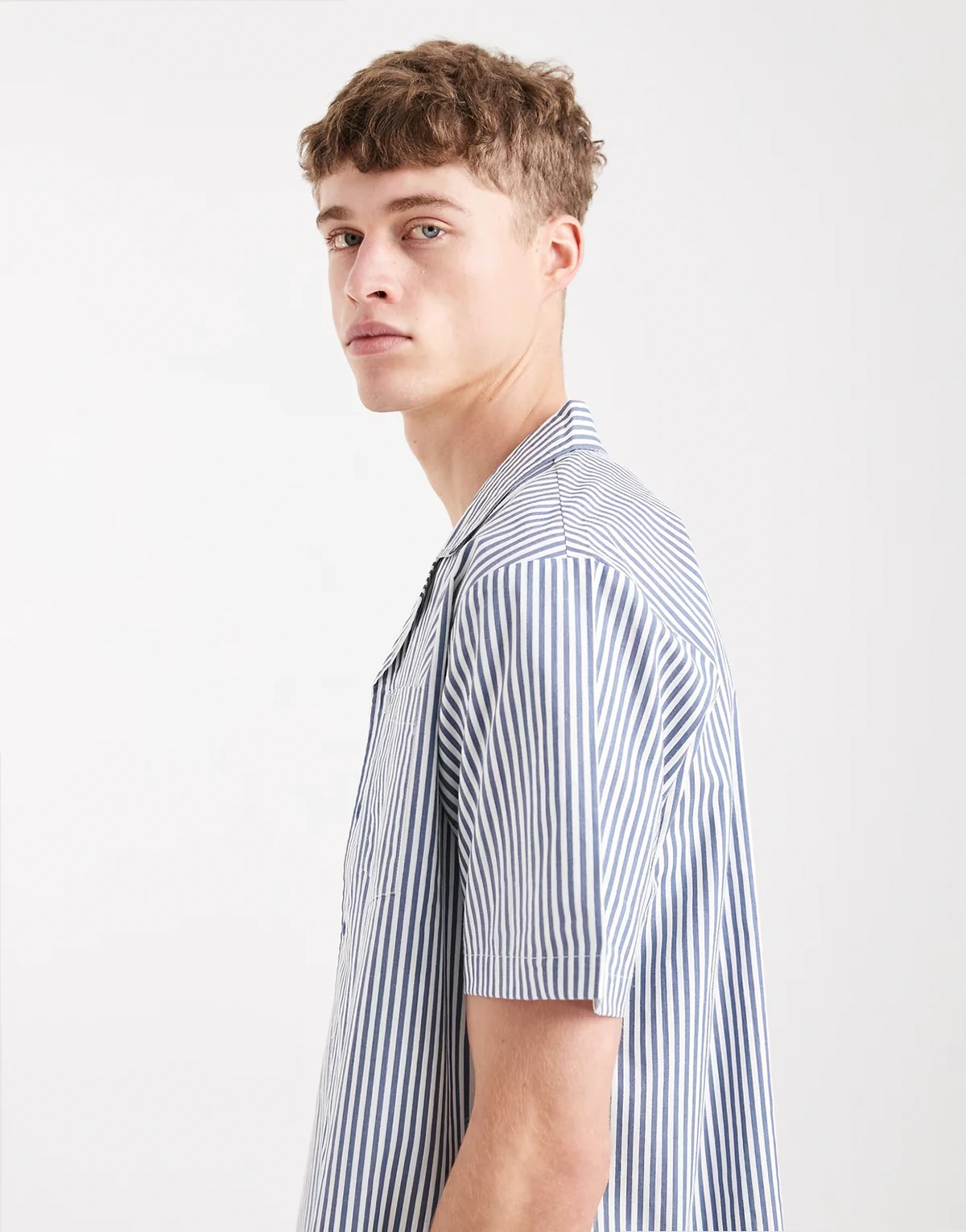 – Kopertowa koszula w prążki z rękawami typu kokon