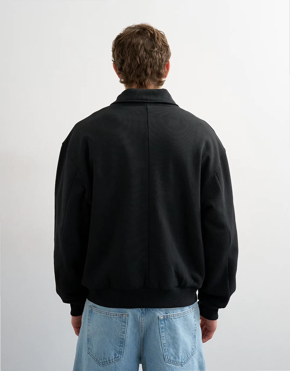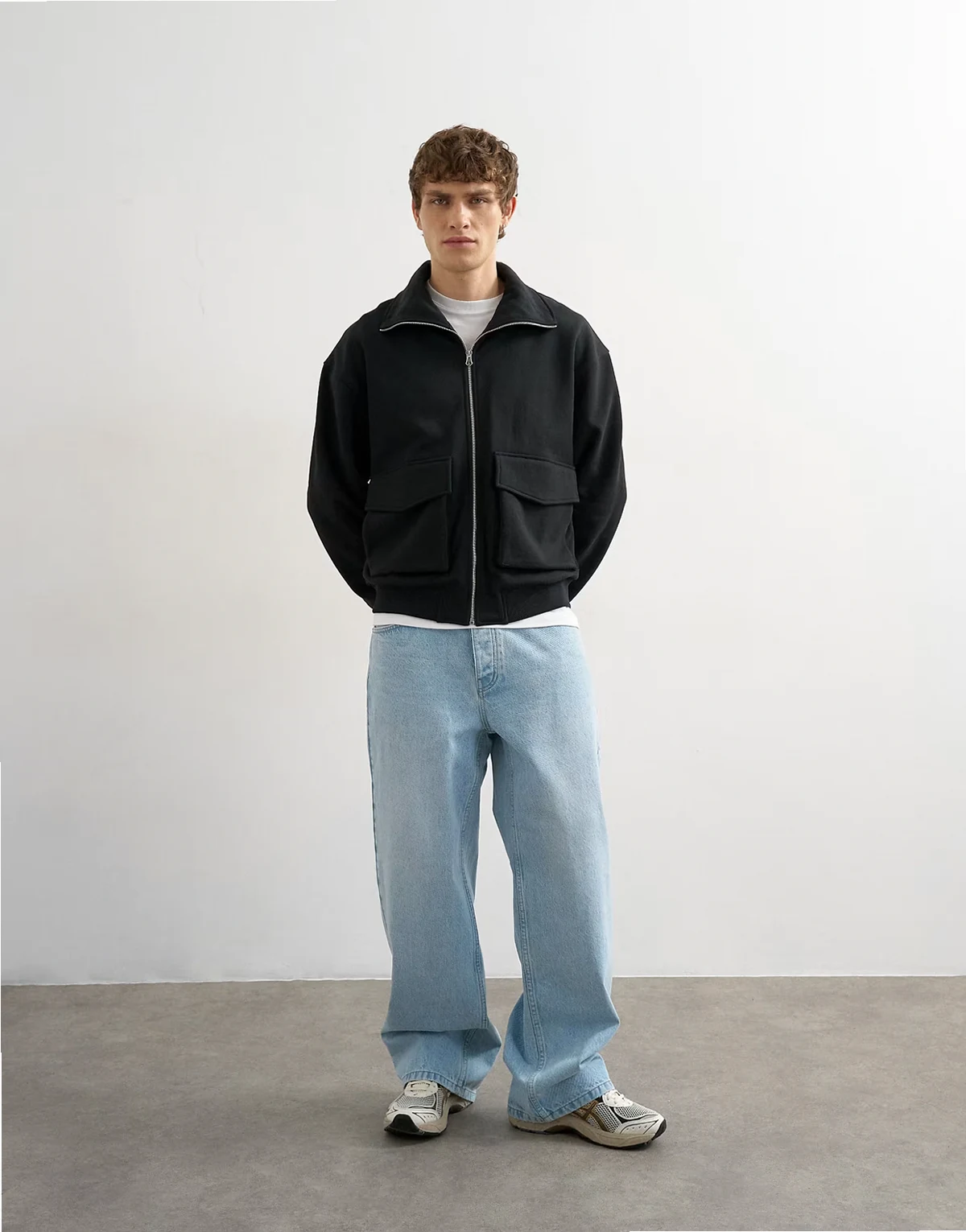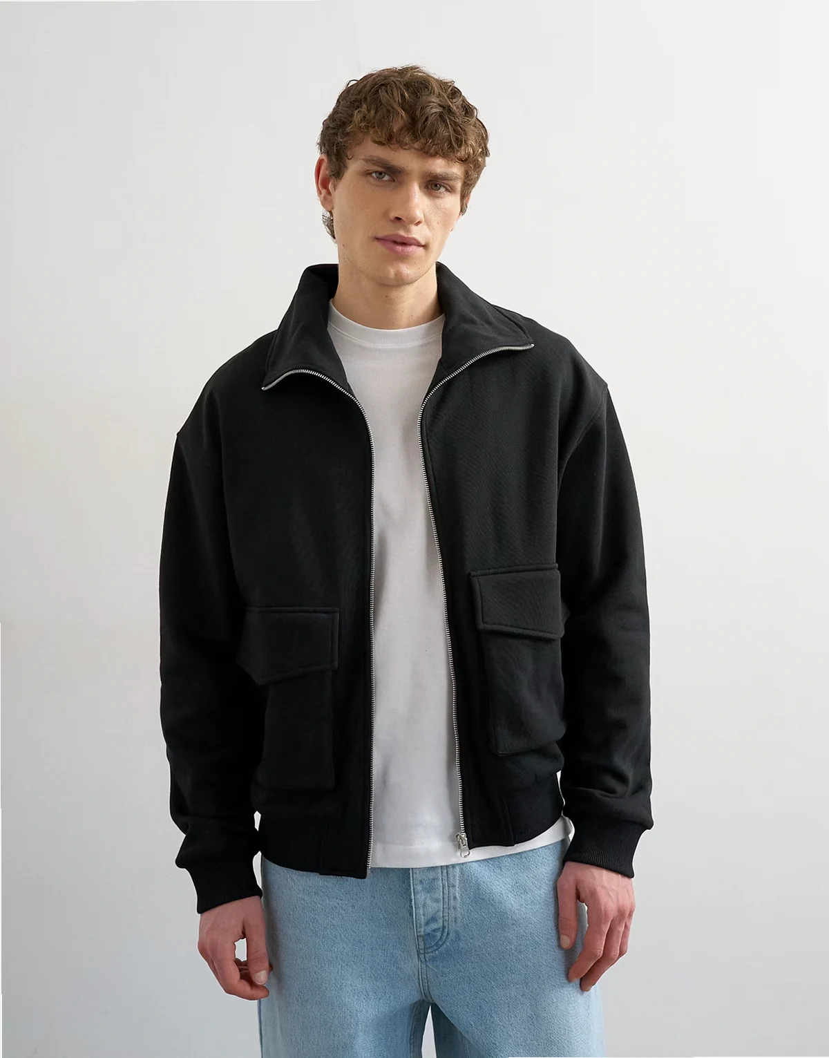 Ta kurtka została uszyta z miękkiego, fakturowanego materiału w ponadczasowym czarnym odcieniu. Ma wysoki kołnierz, zapięcie na zamek i dwie funkcjonalne kieszenie. To model o luźnym kroju.