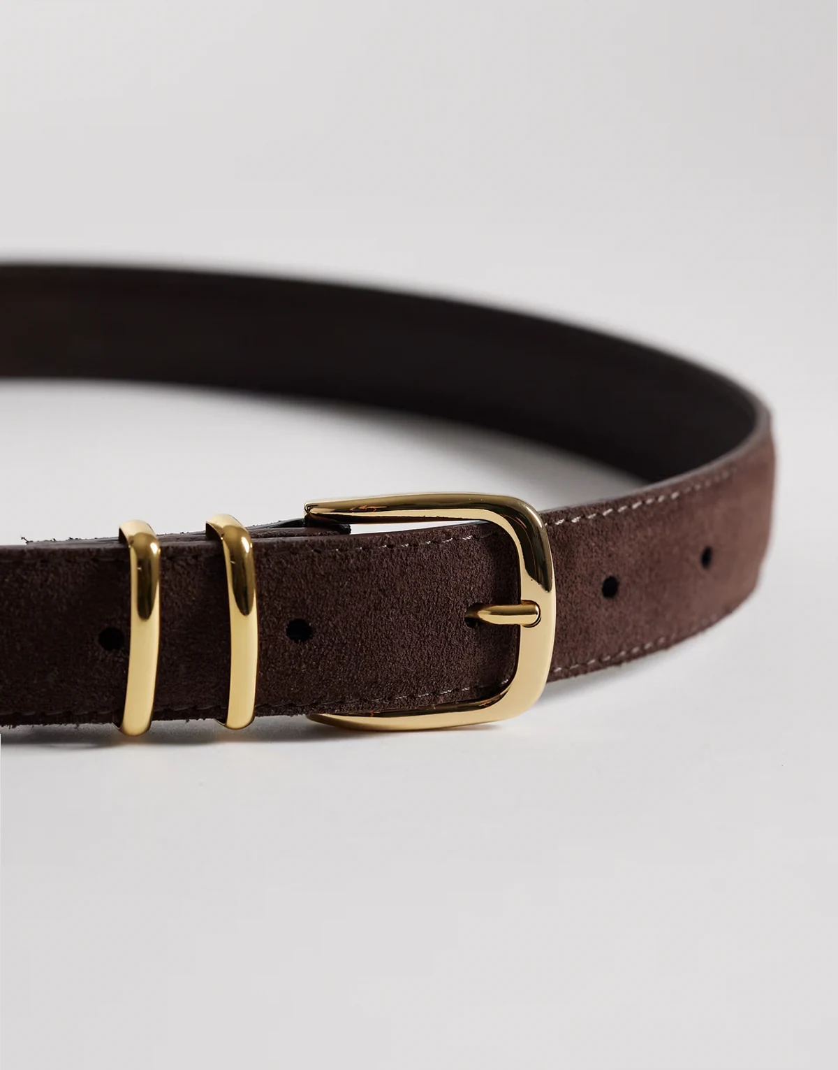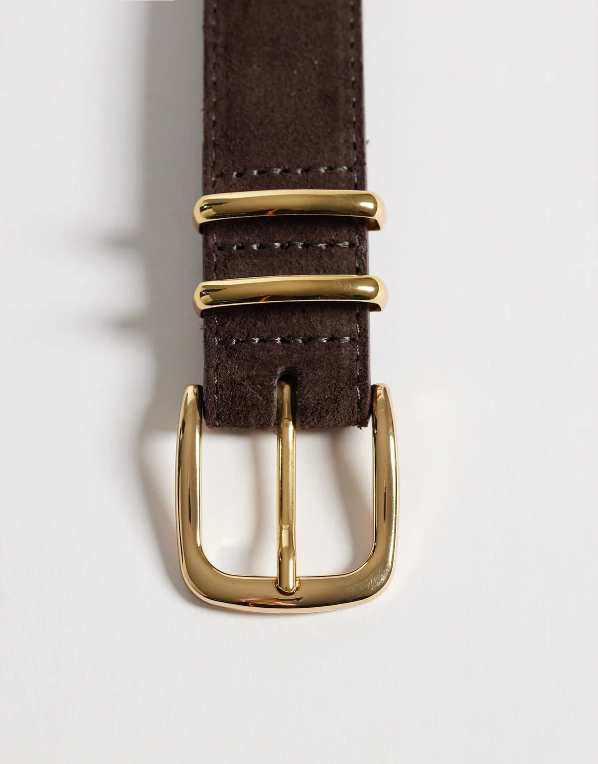 – Brązowy skórzany pasek z zamszowym wykończeniem i złotą klamrą