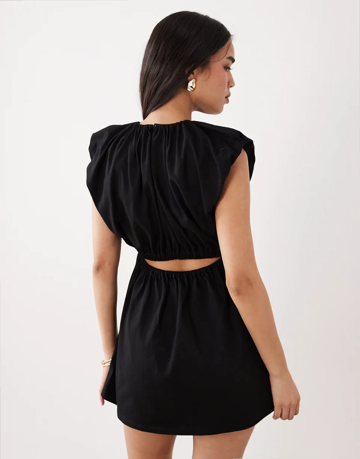 – Czarna marszczona sukienka mini ze skośnymi rękawkami i odkrytymi plecami