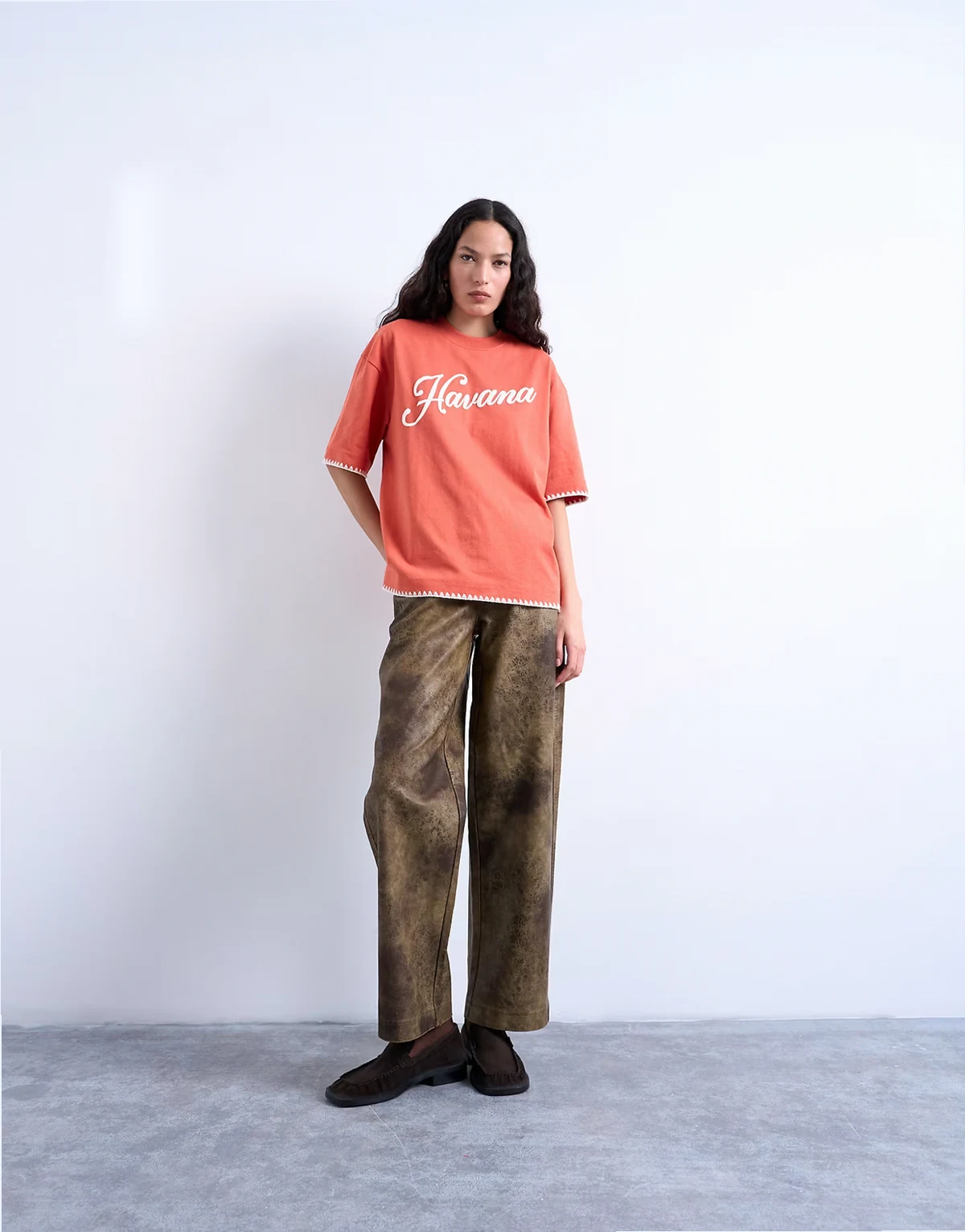 Ten T-shirt uszyto z miękkiego i elastycznego dżerseju z nadrukiem na piersi. Ma okrągły dekolt, krótkie rękawy, ozdobne ściegi i krój oversize.