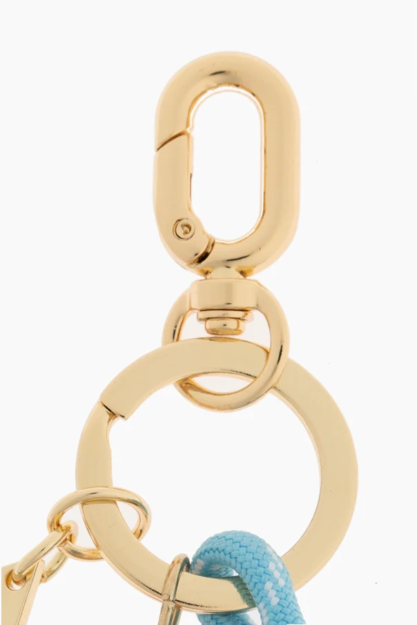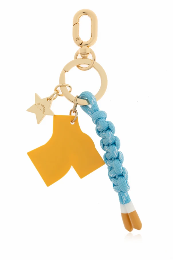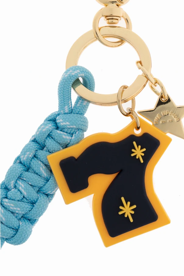 Brelok z zawieszką The Upside zachwyca wyrafinowaną formą i wyrazistą kompozycją kolorystyczną – multikolor stanowi tutaj esencję nieprzeciętnego stylu. Główną ozdobą jest stylizowana cyfra „7” o łagodnych liniach, wyróżniona kontrastową obwódką. Efektowności dodaje gruby splot z niebiesko-błękitnej, syntetycznej linki, którego precyzja wykonania świadczy o wyjątkowej dbałości o detale. Dwie żółte gwiazdki na czarnym tle cyfry wprowadzają aurę lekkości i fantazji, natomiast spójności dopełniają złociste metalowe okucia oraz dyskretne logo projektanta na delikatnej zawieszce.