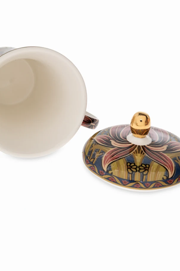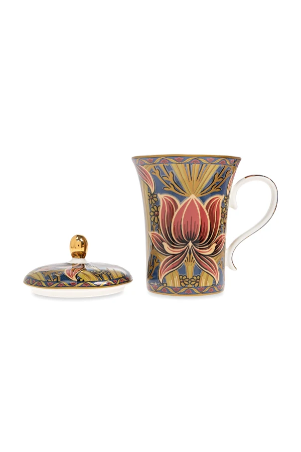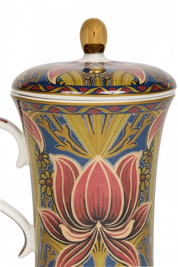 Porcelanowy kubek z pokrywką od Etro Home olśniewa niepowtarzalną formą i stylizacją, która zachwyca wysublimowaniem. Smukły kształt delikatnie rozszerza się ku górze, a ergonomicznym, wyprofilowanym uchwytem podkreśla wygodę użytkowania. Powierzchnia kubka oraz pokrywki mieni się bogatym, multikolorowym motywem roślinnym – centralnie wyeksponowana lilia przywodzi na myśl secesyjne bądź orientalne inspiracje.