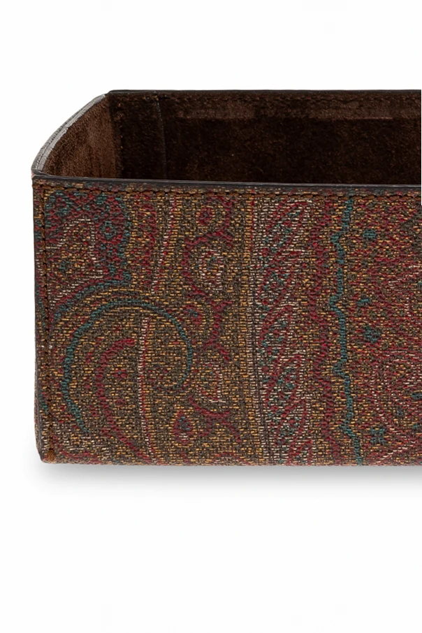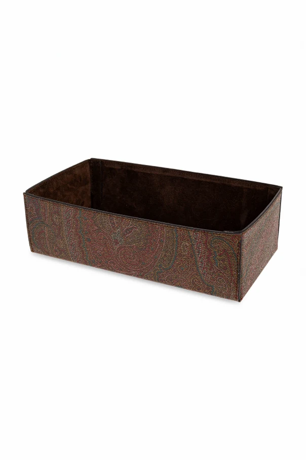 Pokrowiec na chusteczki marki Etro Home to kunsztowny akcent dla miłośników wyrafinowanego stylu. Prosty, pudełkowy kształt harmonijnie współgra z niezwykle bogatym wzorem paisley , który spowija całą powierzchnię pokrowca, nadając mu wysmakowaną, dekoracyjną aurę. Najwyższej jakości materiały — skóra, bawełna, poliester, polichlorek winylu — zapewniają wyjątkową trwałość, a wnętrze, starannie wyściełane miękką tkaniną w kolorze ciemnobrązowym, zachwyca elegancją oraz funkcjonalnością. To niezwykle subtelny, acz zachwycający dodatek, którego precyzja wykonania i troska o detale stanowią wyraz prawdziwego luksusu.