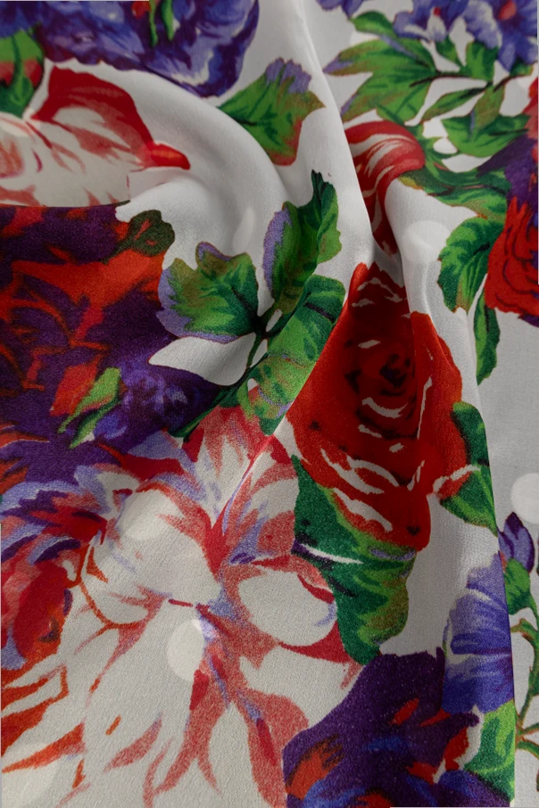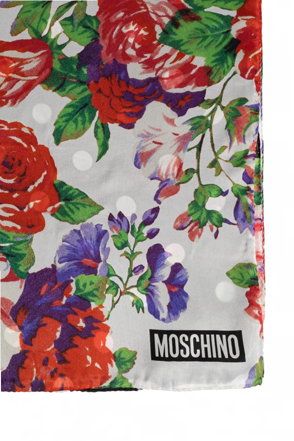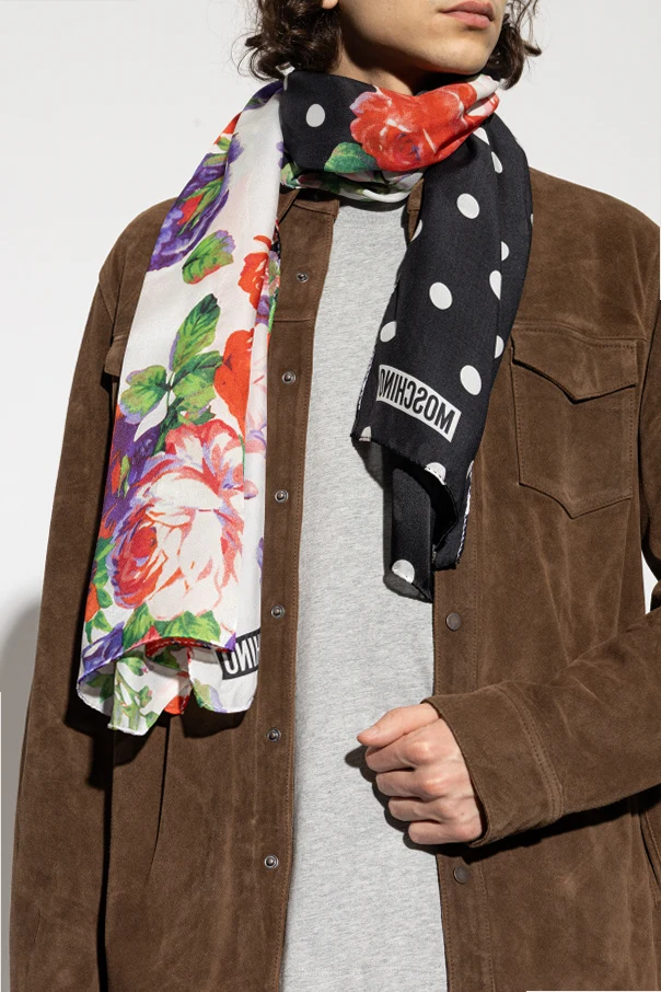 Jedwabny szal Moschino to uosobienie wysublimowanej elegancji i śmiałej ekspresji. Został wykonany z najwyższej klasy, lśniącego jedwabiu, którego miękkość oraz lekkość zachwycają od pierwszego dotyku. Multikolorowy motyw kwiatowy – z czerwonymi, liliowymi, fioletowymi i białymi kwiatami oraz zielonymi liśćmi – prezentuje się wyjątkowo okazale na jasnym tle ozdobionym białymi grochami, podczas gdy druga część szala kontrastuje czarnym tłem z identycznym wzorem.