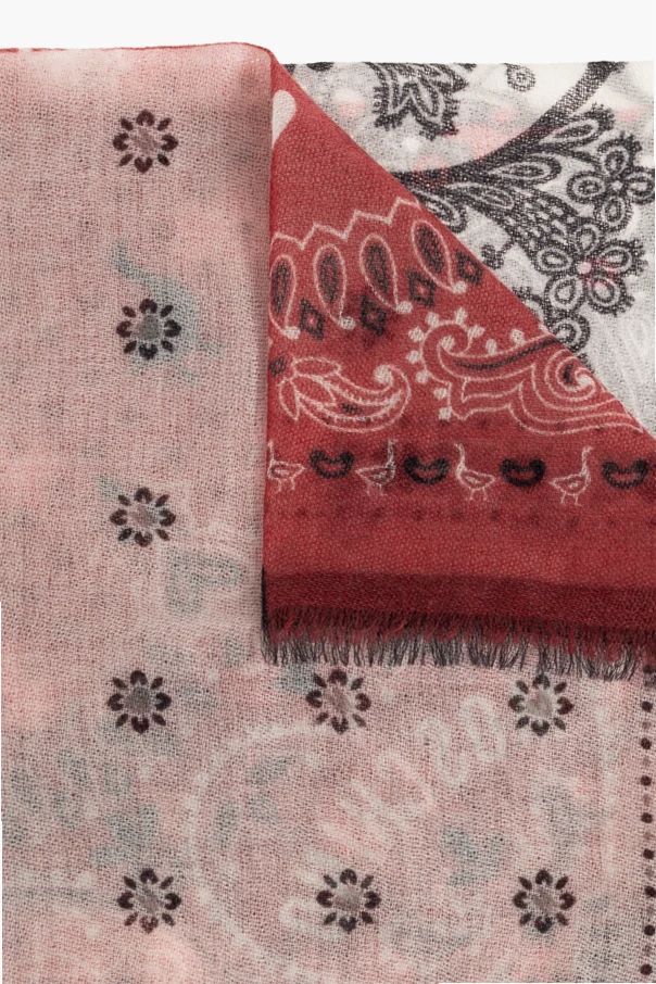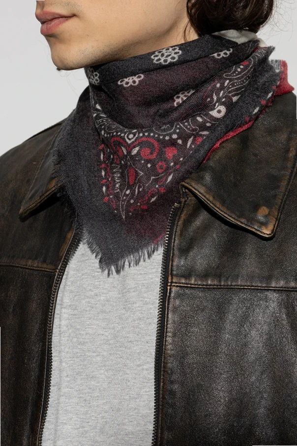 Multikolorowa kompozycja – gra czerń, biel, bordo, czerwień i pudrowy róż – nadaje całości artystycznej głębi, zaś bogaty nadruk łączy motywy kwiatowe, kropki, paisley oraz geometryczne desenie w unikatową mozaikę. Delikatnie postrzępione krawędzie z frędzlami akcentują nieformalną elegancję i styl casual-luxury.