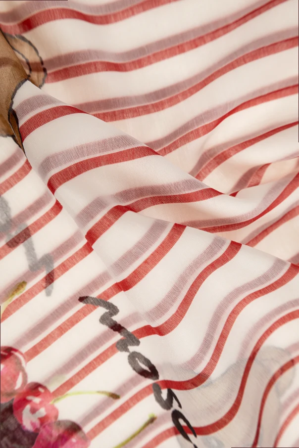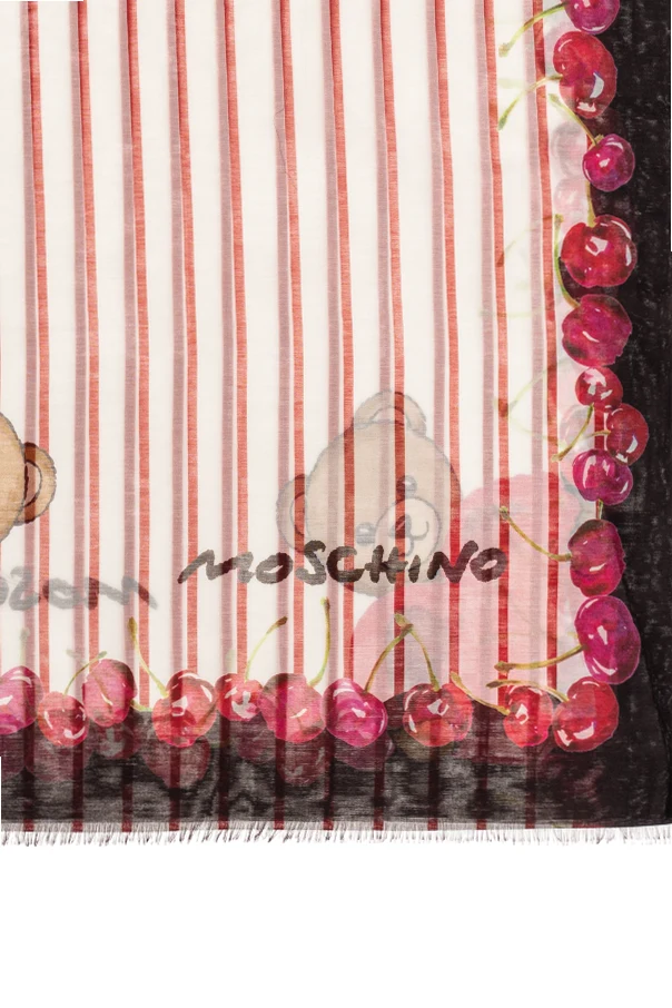 Tło zdobią pionowe pasy w odcieniach bieli i czerwieni, przełamane intensywnymi akcentami różowo-czerwonych wiśni przy krawędziach. Unikatowym detalem są grafiki beżowo-brązowych misiów w różowych swetrach, podkreślające radosny styl typowy dla Moschino. Delikatnie strzępione końce i wyraziste logo dopełniają luksusowego charakteru produktu.