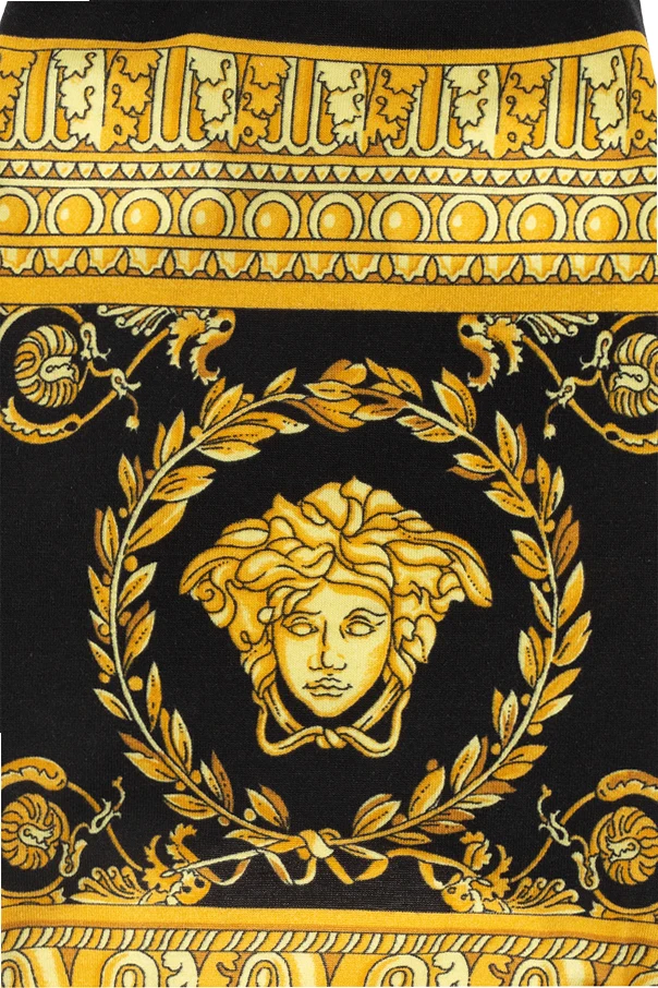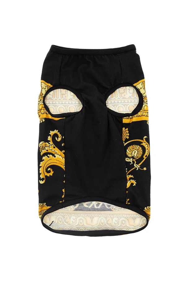 Czarne ubranie dla psa Versace Home. Ozdobione charakterystycznym dla marki wzorem w kolorze złotym.