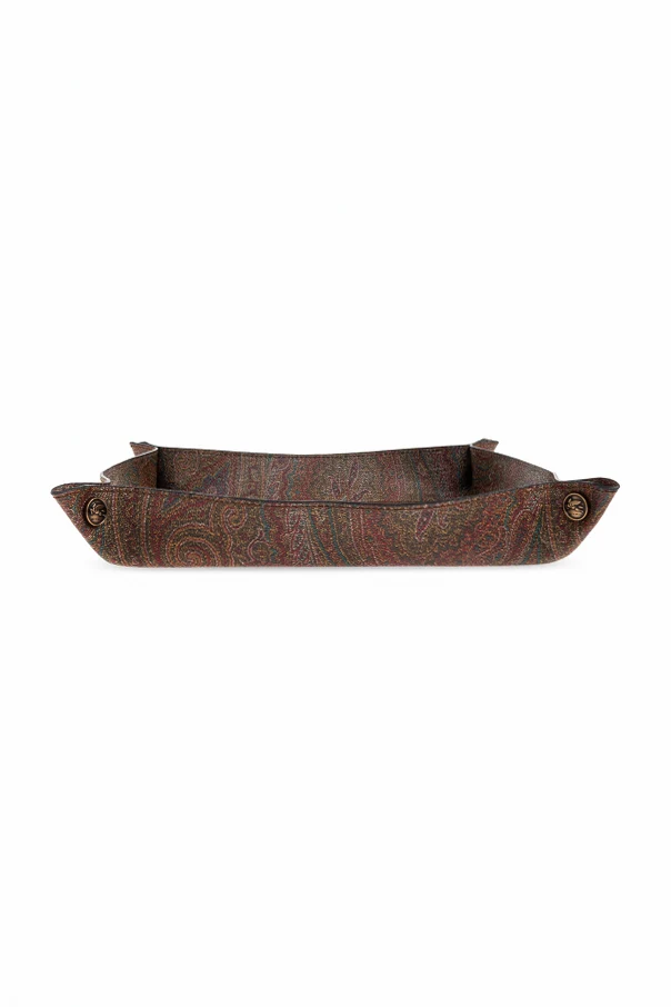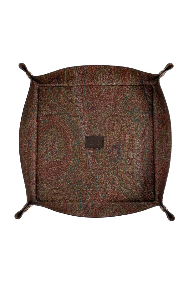 Kwadratowa taca z logo autorstwa Etro Home to wykwintny akcent do wnętrz, będący kwintesencją wyszukanego stylu i ponadczasowej elegancji. Forma sztywnej tacy, z wyraźnie podwyższonymi brzegami oraz starannie zagiętymi i spiętymi metalowymi napami rogami, zapewnia zarówno walory praktyczne, jak i nieprzeciętny wygląd.